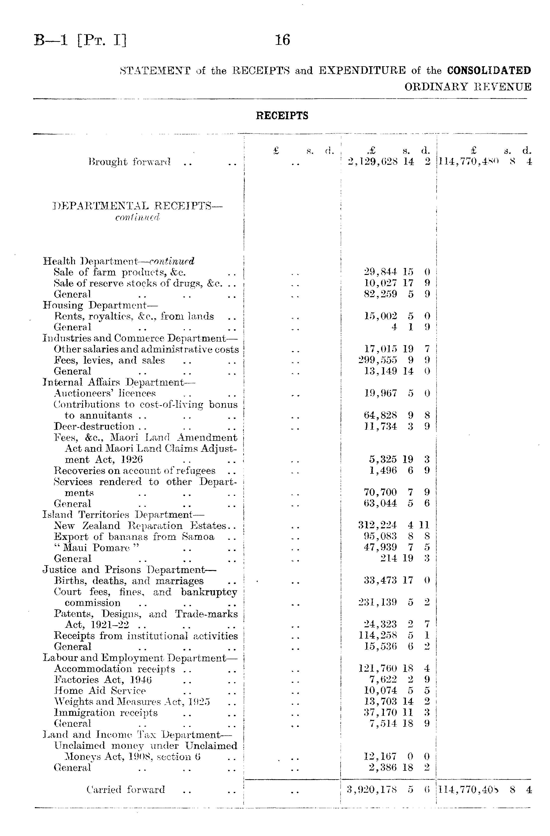 RECEIPTS £ s. d. £ s. d. £ s. d. Brought forward 2,129,628 14 2 114,770,480 8 4 DEPARTMENTAL RECEIPTS— continued Health Department—continued Sale of farm products, &e. 29,844 15 0 Sale of reserve stocks of drugs, &c. .. 10,027 17 9 General 82,259 5 9 Housing Department— Rents, royalties, &c., from lands 15,002 5 0 General 4 1 9 Industries and Commerce Department— Other salaries and administrative costs 17,015 19 7 Fees, levies, and sales 299,555 9 9 General 13,149 14 0 Internal Affairs Department— Auctioneers' licences 19,967 5 0 Contributions to cost-of-living bonus to annuitants 64,828 9 8 Deer-destruction 11,734 3 9 Fees, &c., Maori Land Amendment / Act and Maori Land Claims Adjustment Act, 1926 5,325 19 3 Recoveries on account of refugees .. 1,496 6 9 Services rendered to other Departments 70,700 7 9 General 63,044 5 6 Island Territories Department— New Zealand Reparation Estates.. 312,224 4 11 Export of bananas from Samoa .. 95,083 8 8 " Maui Pomare " 47,939 7 5 General 214 19 3 Justice and Prisons Department— Births, deaths, and marriages 33,473 17 0 | Court fees, fines, and bankruptcy commission .. .. 231,139 5 2 Patents, Designs, and Trade-marks Act, 1921-22 .. 24,323 2 7 Receipts from institutional activities 114,258 5 1 General 15,536 6 2 Labour and Employment Department— Accommodation receipts 121,760 18 4 Factories Act, 1946 7,622 2 9 Home Aid Service 10,074 5 5 Weights and Measures Act, 1925 13,703 14 2 Immigration receipts .. 37,170 11 3 General 7,514 18 9 Land and Income Tax Department— Unclaimed money under Unclaimed Moneys Act, 1908, section 6 12,167 0 0 General 2,386 18 2 Carried forward 3,920,178 5 6 114,770,408 8 4