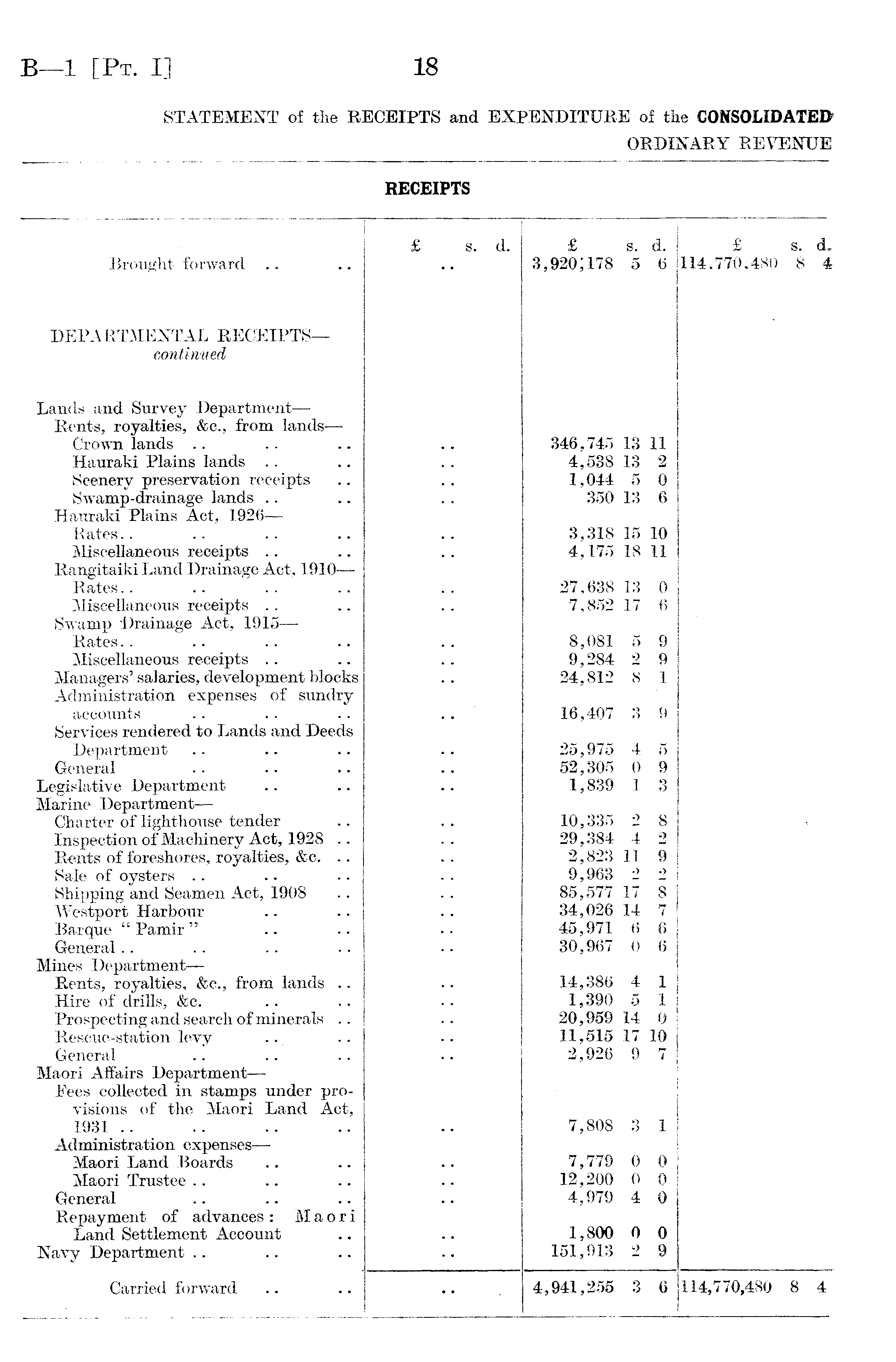 RECEIPTS £ s. d. £ s. d. £ s. d„ Brought forward 3,920;178 5 6 114,770,480 8 4 DEPARTMENTAL RECEIPTS— continued Lands and Survey Department— Rents, royalties, &c., from lands — Crown lands 346,745 13 11 Hauraki Plains lands 4,538 13 2 Scenery preservation receipts 1,044 5 0 Swamp-drainage lands 350 13 6 Hauraki Plains Act, 1926— Rates 3,318 15 10 Miscellaneous receipts 4,175 18 11 Rangitaiki Land Drainage Act, 1910 — Rates 27,638 13 0 Miscellaneous receipts 7,852 17 6 Swamp Drainage Act, 1915 — Rates 8,081 5 9 Miscellaneous receipts 9,284 2 9 Managers' salaries, development blocks 24,812 8 1 Administration expenses of sundry / accounts 16,407 3 9 Services rendered to Lands and Deeds Department 25,975 4 5 General 52,305 0 9 Legislative Department 1,839 1 3 Marine Department — Charter of lighthouse tender 10,335 2 8 Inspection of Machinery Act, 1928 .. 29,384 4 2 Rents of foreshores, royalties, &c. .. 2,823 11 9 Sale of oysters 9,963 2 2 Shipping and Seamen Act, 1908 85,577 17 8 Westport Harbour 34,026 14 7 Barque " Pamir " 45,971 6 6 General 30,967 0 6 Mines Department— Rents, royalties, &c., from lands .. 14,386 4 1 Hire of drills, &c. 1,390 5 1 Prospecting and search of minerals .. 20,959 14 0 Rescue-station levy .., 11,515 17 10 General 2,926 9 7 Maori Affairs Department— Fees collected in stamps under provisions of the Maori Land Act, 1931 7,808 3 1 Administration expenses — Maori Land Boards 7,779 0 0 Maori Trustee 12,200 0 0 General 4,979 4 0 Repayment of advances: Maori Land Settlement Account 1,800 0 0 Navy Department 151,913 2 9 Carried forward •• 4,941,255 3 6 114,770,480 8 4