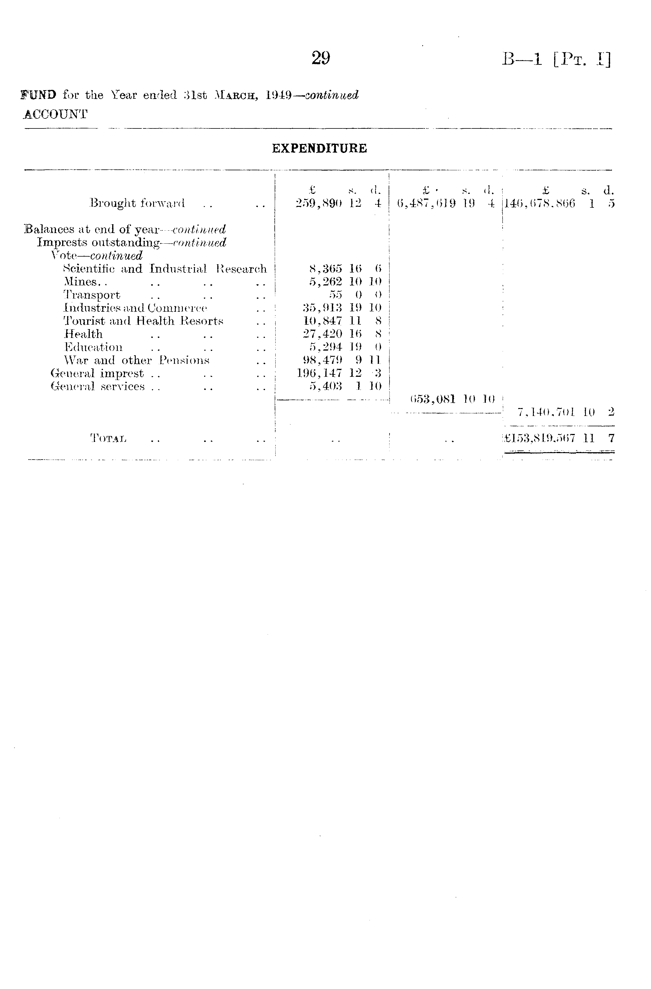 EXPENDITURE £ s. d. £ - s. d. £ s. d. Brought forward 259,890 12 4 6,487,619 19 4 146,678,866 1 5 Balances at end of year —continued Imprests outstanding—continued i V ote —continued 1 Scientific and Industrial Research 8,365 16 6 Mines.. 5,262 10 10 Transport 55 0 0 Industries and Commerce 35,913 19 10 Tourist and Health Resorts 10,847 11 8 Health 27,420 16 8 Education 5,294 19 0 War and other Pensions 98,479 9 11 General imprest .. .. 196,147 12 v 3 General services 5,403 1 10 \ JtJtJ j V/Oi xv" 11/ ; 7,140,701 10 2 Total i£153,819,567 11 7