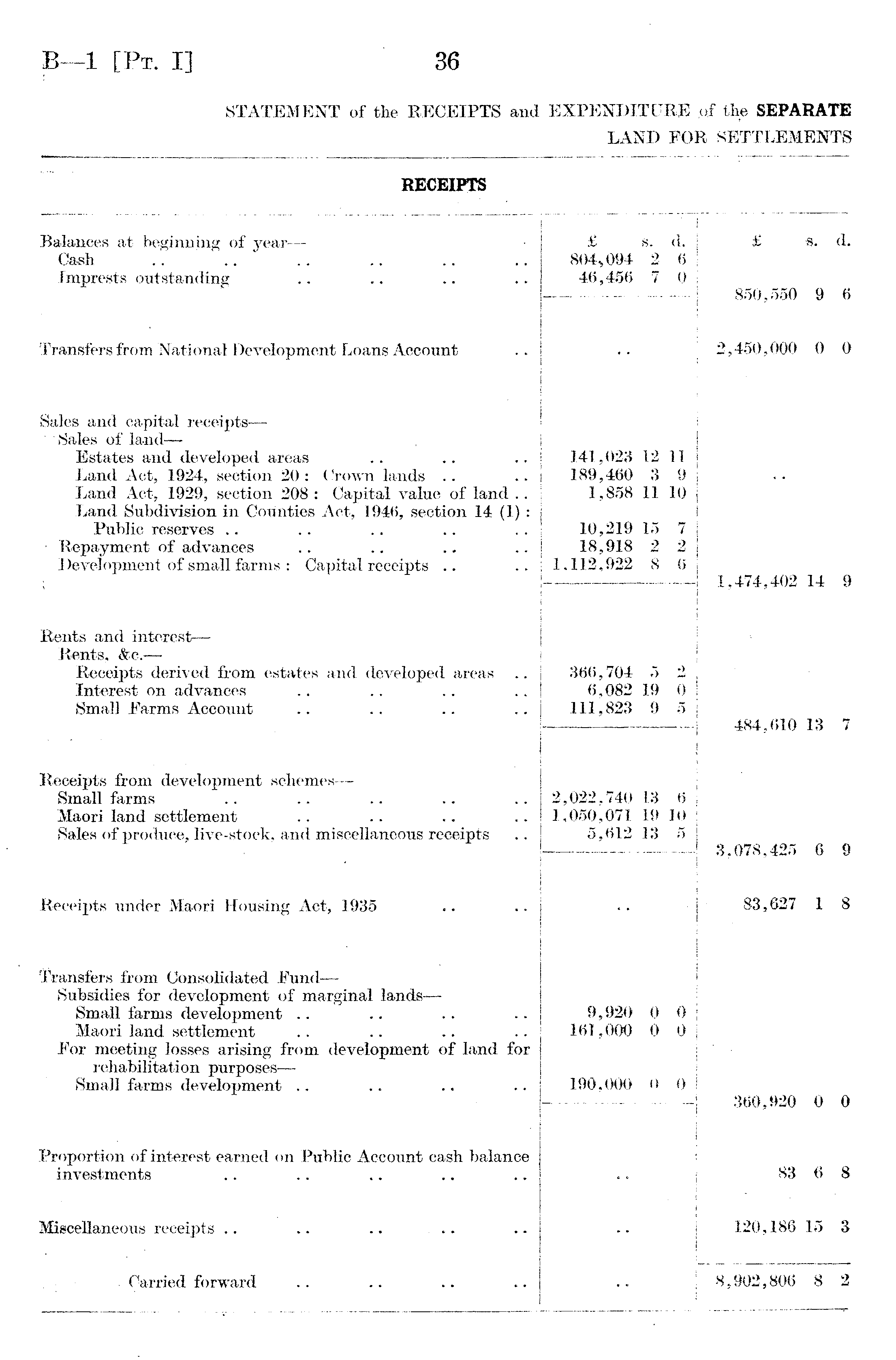 RECEIPTS Balances at beginning of year — Cash Imprests outstanding T* -sC o GC s. 2 7 d. 6 0 [ £ 850,550 s. 9 d. 6 Transfers from National Development Loans Account 2,450,000 0 0 Sales and capital receipts— Sales of land— Estates and developed areas Land Act, 1924, section 20 : Crown lands Land Act, 1929, section 208 : Capital value of land .. Land Subdivision in Counties Act, 1946, section 14 (1) : Public reserves .. .. ; Repayment of advances Development of small farms : Capital receipts 141,023 189,460 1,858 10,219 18,918 ! 1.112,922 i 12 3 11 15 2 8 n 9 10 j 7 2 6 1 ! i 1,474,402 14 9 Rents and interest— Rents, &c.— Receipts derived from estates and developed areas .. Interest on advances Small Farms Account .. .. .366,704 5 6,082 19 111,823 9 0 5 484,610 13 7 Receipts from development schemes — Small farms Maori land settlement Sales of produce, live-stock, and miscellaneous receipts 2,022,740 1,050,071 5,612 13 19 13 6 i 10 5 3,078,425 6 9 Receipts under Maori Housing Act, 1935 83,627 1 8 Transfers from Consolidated Fund— Subsidies for development of marginal lands — Small farms development Maori land settlement For meeting losses arising from development of land for rehabilitation purposes— Small farms development .. 9,920 161,000 190,000 0 0 0 o 0 0 360,920 0 0 V , Proportion of interest earned on Public Account cash balance investments 83 6 8 Miscellaneous receipts .. .. .. ... 120,186 15 3 Carried forward \ 8,902,806 8 2