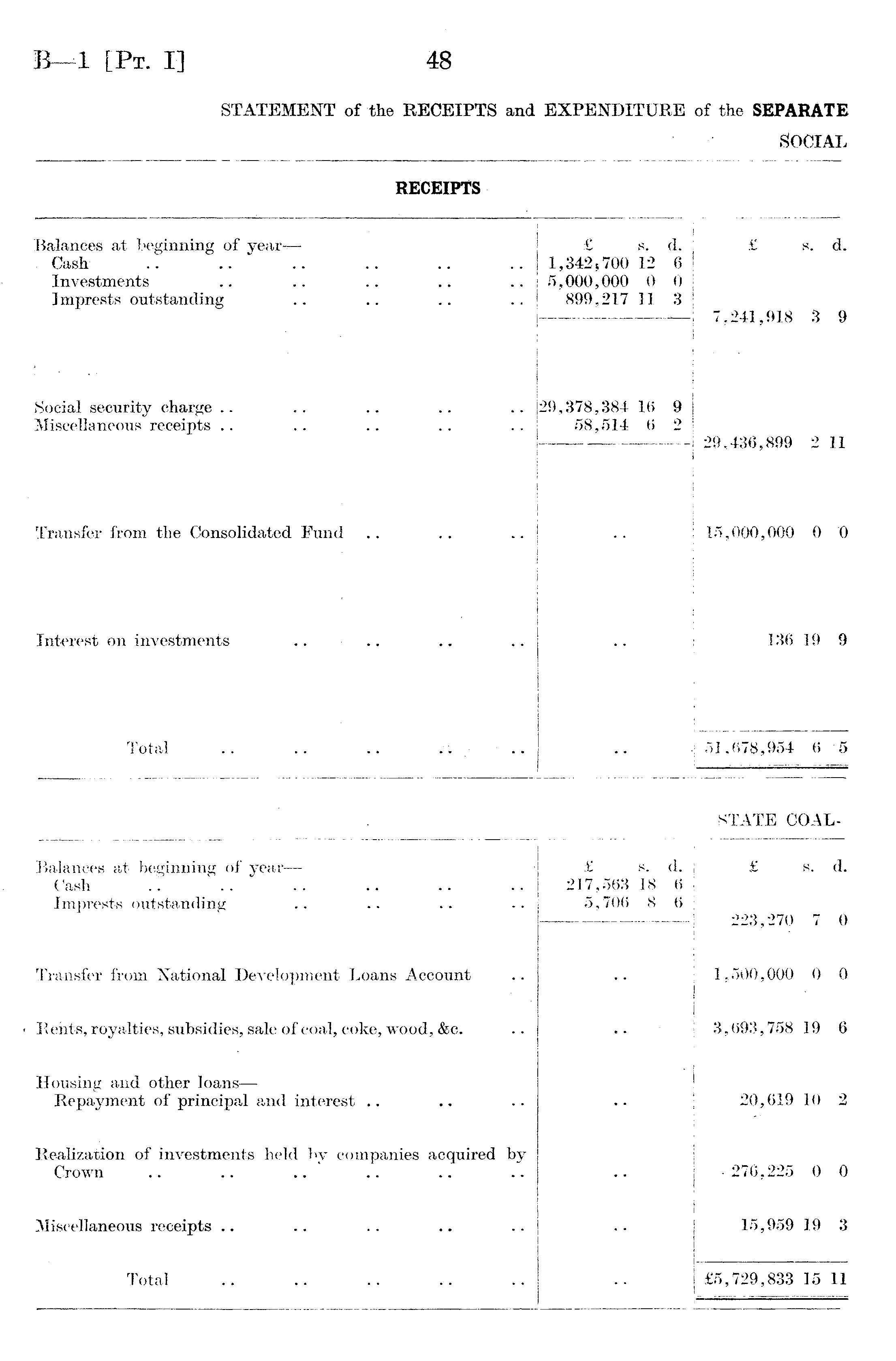 Social RECEIPTS Balances at beginning of yearCash .. Investments Imprests outstanding £ s. 1,342,700 12 5,000,000 0 899,217 11 d. 6 0 3 £ s. d. 7,241,918 3 9 . | Social security charge Miscellaneous receipts 29,378,384 16 58,514 6 9 2 29,436,899 2 11 Transfer from the Consolidated Fund 15,000,000 0 0 Interest on investments .. 136 19 9 Total .. .. .. .. 51,678,954 6 5 • STATE COALBalances at beginning of year — Cash Imprests outstanding £ s. 217,563 18 5,706 8 d. 6 6 £ s. d. 223,270 7 0 Transfer from National Development Loans Ac'count 1,500,000 0 0 Bents, royalties, subsidies, sale of coal, coke, wood, &c. 3,693,758 19 6 Housing and other loans — Repayment of principal and interest .. 20,619 10 2 V Realization of investments held by companies acquired by Crown ■ 276,225 0 0 Miscellaneous receipts .... 15,959 19 3 Total .. .. £5,729,833 15 11