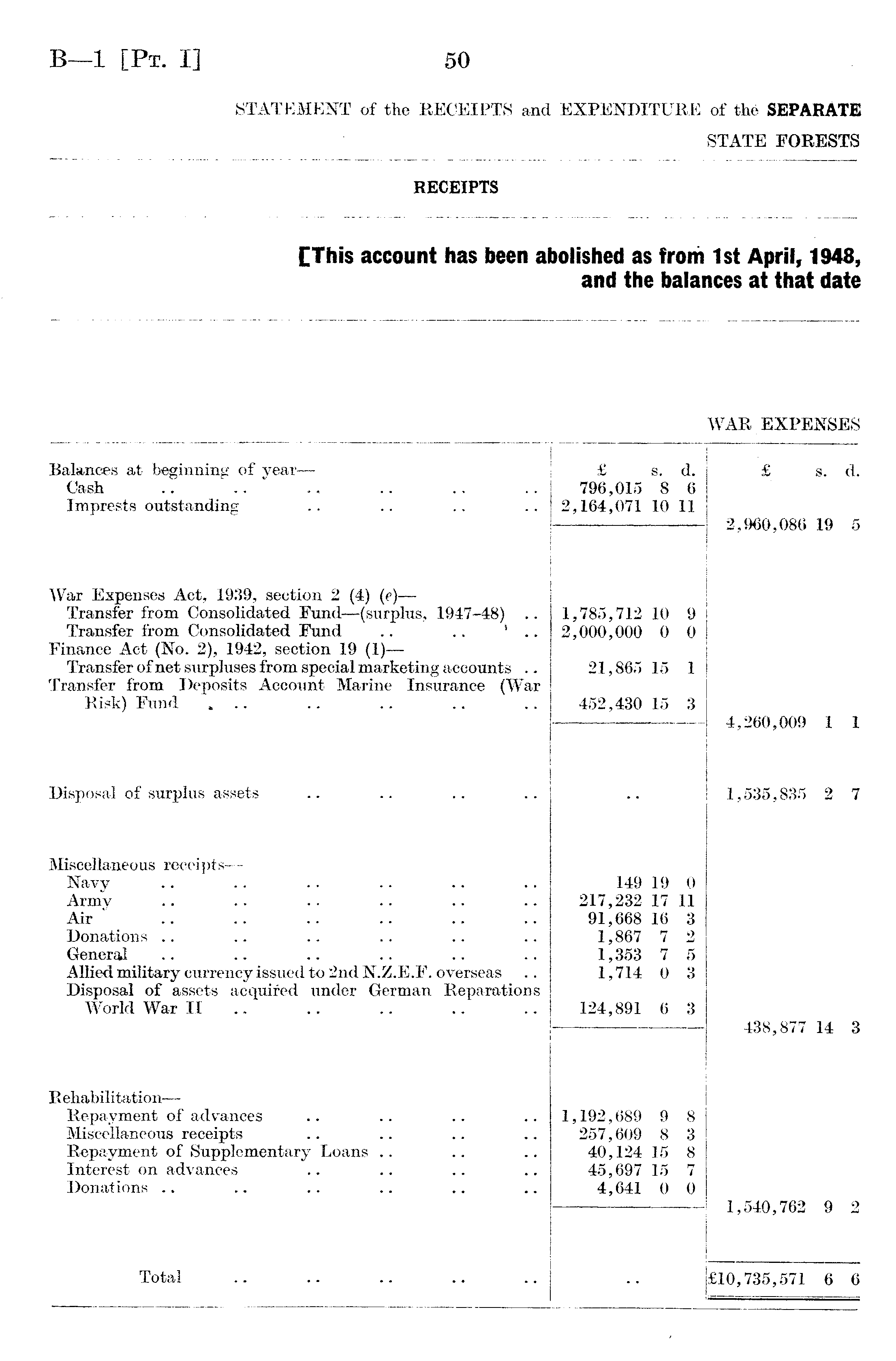 RECEIPTS [This account has been abolished as from 1st April, 1948, and the balances at that date WAR EXPENSES Balances at beginning of year— Cash Imprests outstanding £ s. d. 796,015 8 6 2,164,071 10 11 £ s. d. 2,960,086 19 5 War Expenses Act, 1939, section 2 (4) (e) — Transfer from Consolidated Fund —(surplus, 1947-48) .. Transfer from Consolidated Fund .. .. ' .. Finance Act (No. 2), 1942, section 19 (1) — Transfer of net surpluses from special marketing accounts .. Transfer from Deposits Account Marine Insurance (War Risk) Fund * .. 1,785,712 10 2,000,000 0 21,865 15 452,430 15 9 0 1 3 4,260,009 1 1 Disposal of surplus assets 1,535,835 2 7 Miscellaneous receipts— Navy Army Air Donations .. .. General Allied military currency issued to 2nd N.Z.E .F. overseas Disposal of assets acquired under German Reparations World War II 149 19 217,232 17 91,668 16 1,867 7 1,353 7 1,714 0 124,891 ,6 0 11 3 2 5 3 3 438,877 14 3 Rehabilitation— Repayment of advances Miscellaneous receipts Repayment of Supplementary Loans Interest on advances Donations 1,192,689 9 257,609 8 40,124 15 45,697 15 4,641 0 8 3 8 7 0 1,540,762 9 2 Total £10,735,571 6 6