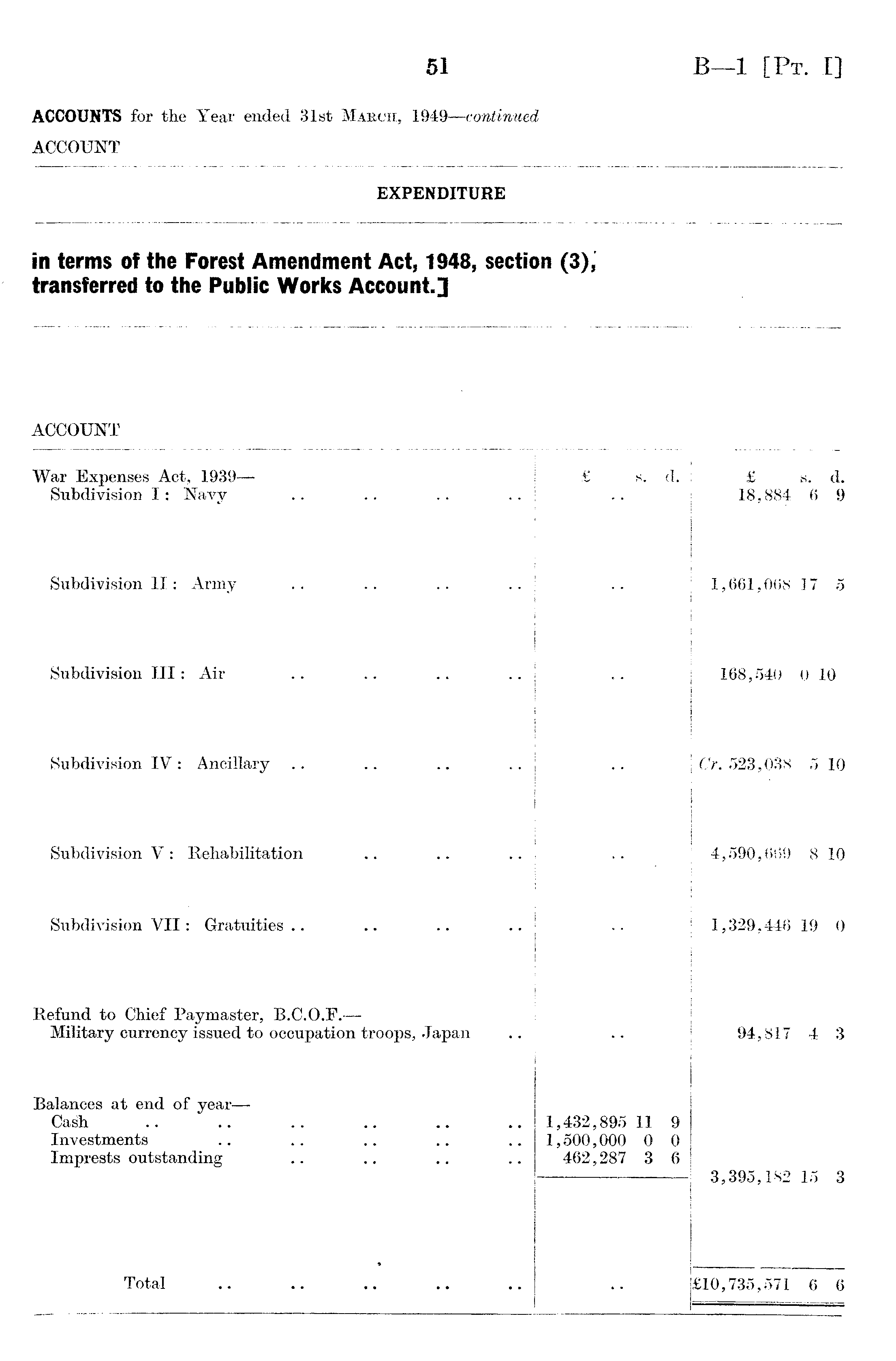 EXPENDITURE in terms of the Forest Amendment Act, 1948, section (3), transferred to the Public Works Account.3 ACCOUNT War Expenses Act, 1939 — Subdivision I: Navy £ s. d. £ s. 18,884 6 d. 9 Subdivision II: Army 1,661,068 17 5 Subdivision III: Air 168,540 0 10 Subdivision IV : Ancillary .. Or. 523,038 5 10 Subdivision V : Rehabilitation 4,590,669 8 10 Subdivision, VII: Gratuities 1,329,446 19 0 Refund to Chief Paymaster, B.C.O.F.—Military currency issued to occupation troops, Japan 94,817 4 3 Balances at end of year— Cash Investments Imprests outstanding .. .. 1,432,895 11 1,500,000 0 462,287 3 9 0 6 3,395,182 15 3 Total £10,735,571 6 6