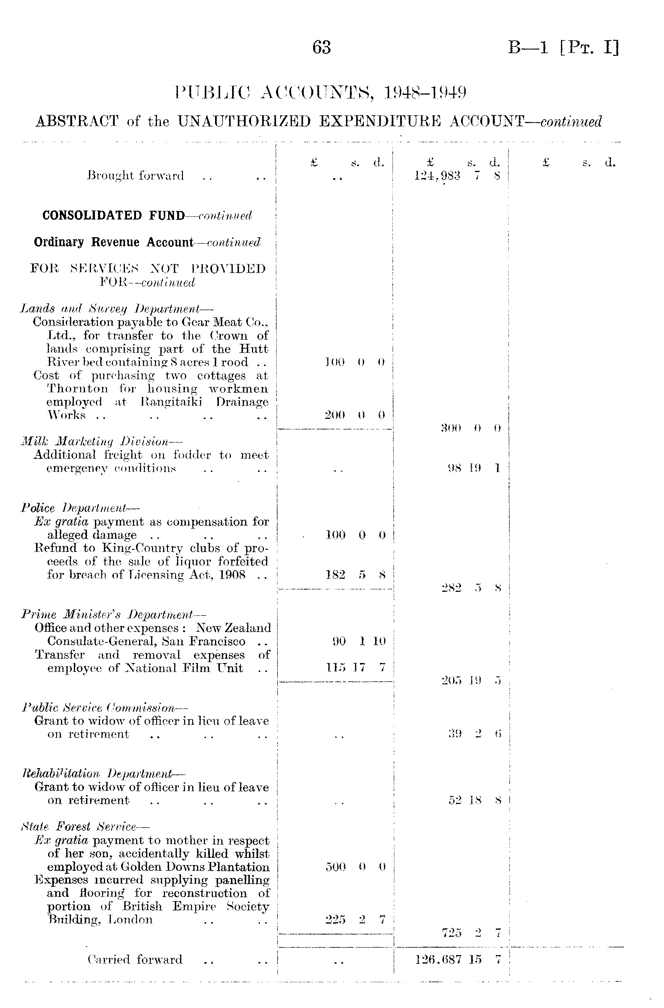 Brought forward £ s. d. £ 124,983 s. 7 d. 8 £ s. d. CONSOLIDATED FUND—continued Ordinary Revenue Account —continued FOR SERVICES NOT PROVIDED FOR—continued Lands and Survey' Department— Consideration payable to Gear Meat Co., Ltd., for transfer to the Crown of lands comprising part of the Hutt River bed containing 8 acres 1 rood .. Cost of purchasing two cottages at Thornton for housing workmen employed at Rangitaiki Drainage Works 100 200 0 0 0 0 300 98 0 19 0 1 Milk Marketing Division — Additional freight on fodder to meet emergency conditions Police Department— Ex gratia payment as compensation for alleged damage Refund to King-Country clubs of proceeds of the sale of liquor forfeited for breach of Licensing Act, 1908 .. - 100 182 0 5 0 8 282 8 j 1 Prime Minister's Department— Office and other expenses : New Zealand Consulate-General, San Francisco .. Transfer and removal expenses of employee of National Film Unit .. 90 115 1 17 10 7 205 19 Public Service Commission— Grant to widow of officer in lieu of leave on retirement 39 6 Rehabilitation Department— Grant to widow of officer in lieu of leave on retirement 52 18 8 State Forest Service — Ex gratia payment to mother in respect of her son, accidentally killed whilst employed at Golden Downs Plantation Expenses incurred supplying panelling and flooring" for reconstruction of portion of British Empire Society Building, London 500 225 0 2 0 7 725 0 7 Carried forward 126;687 15 7