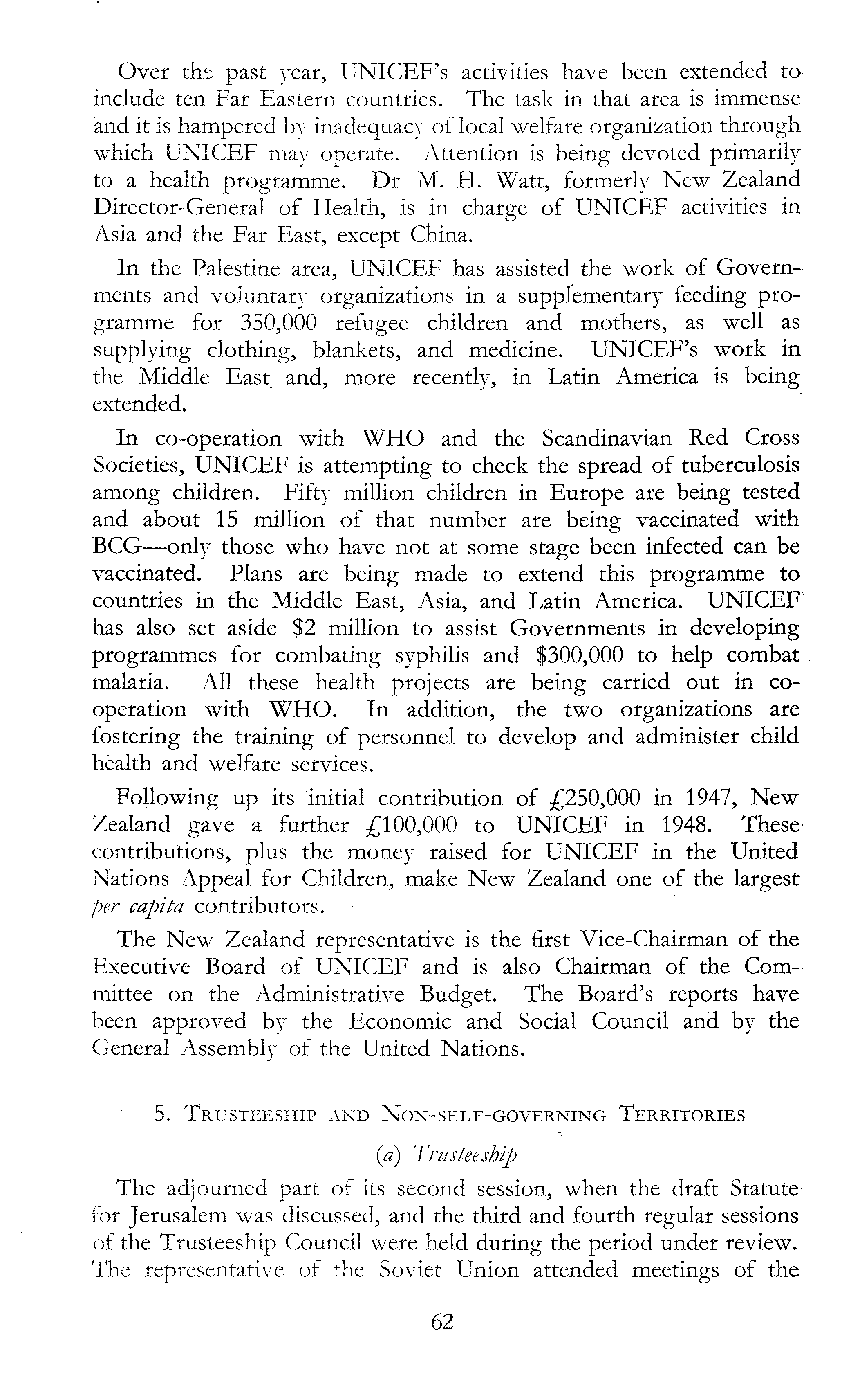 Over the past year, UNICEF's activities have been extended to include ten Far Eastern countries. The task in that area is immense and it is hampered by inadequacy of local welfare organization through which UNICEF may operate. Attention is being devoted primarily to a health programme. Dr M. H. Watt, formerly New Zealand Director-General of Health, is in charge of UNICEF activities in Asia and the Far East, except China. In the Palestine area, UNICEF has assisted the work of Governments and voluntary organizations in a supplementary feeding programme for 350,000 refugee children and mothers, as well as supplying clothing, blankets, and medicine. UNICEF's work in the Middle East and, more recently, in Latin America is being extended. In co-operation with WHO and the Scandinavian Red Cross Societies, UNICEF is attempting to check the spread of tuberculosis among children. Fifty million children in Europe are being tested and about 15 million of that number are being vaccinated with BCG—only those who have not at some stage been infected can be vaccinated. Plans are being made to extend this programme to countries in the Middle East, Asia, and Latin America. UNICEF' has also set aside $2 million to assist Governments in developing programmes for combating syphilis and $300,000 to help combat malaria. All these health projects are being carried out in cooperation with WHO. In addition, the two organizations are fostering the training of personnel to develop and administer child health and welfare services. Following up its initial contribution of £250,000 in 1947, New Zealand gave a further £IOO,OOO to UNICEF in 1948. These contributions, plus the money raised for UNICEF in the United Nations Appeal for Children, make New Zealand one of the largest per capita contributors. The New Zealand representative is the first Vice-Chairman of the Executive Board of UNICEF and is also Chairman of the Committee on the Administrative Budget. The Board's reports have been approved by the Economic and Social Council and by the General Assembly of the United Nations. 5. Trusteeship and Non-self-governing Territories (a) Trusteeship The adjourned part of its second session, when the draft Statute for Jerusalem was discussed, and the third and fourth regular sessions, of the Trusteeship Council were held during the period under review. The representative of the Soviet Union attended meetings of the