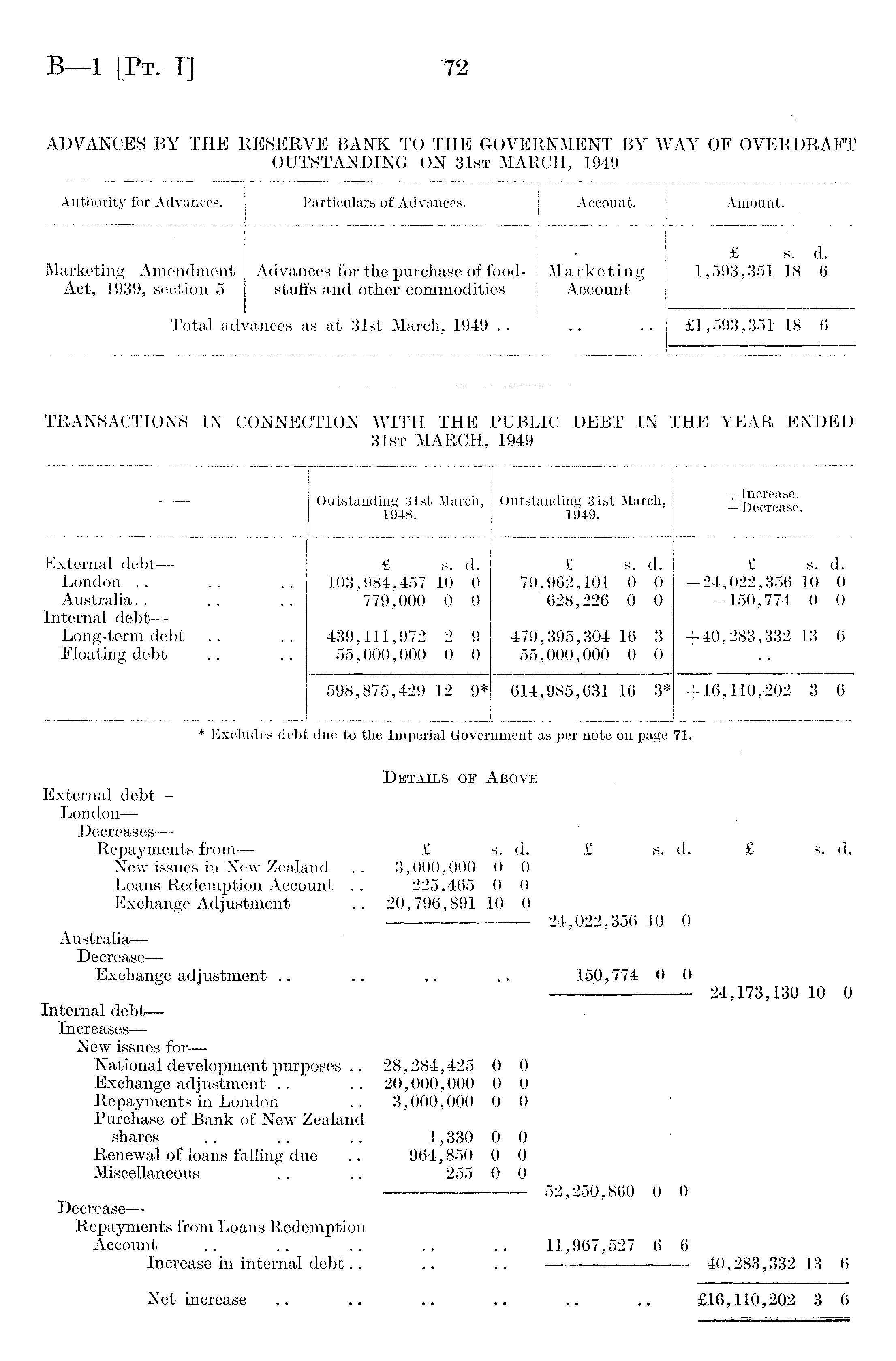 Details of Above External debt— London— Decreases— Repayments from— £ s. d. £ s. d. £ s. d. New issues in New Zealand .. 3,000,000 0 0 Loans Redemption Account .. 225,465 0 0 Exchange Adjustment .. 20,796,891 10 0 24,022,356 10 0 Australia— Decrease— Exchange adjustment .. .. .. 150,774 0 0 — 24,173,130 10 0 Internal debt— Increases—• New issues for— National development purposes ~ 28,284,425 0 0 Exchange adjustment .. .. 20,000,000 0 0 Repayments in London .. 3,000,000 0 0 „ Purchase of Bank of New Zealand shares .. .. .. 1,330 0 0 Renewal of loans falling due .. 964,850 0 0 Miscellaneous .. .. 255 0 0 52,250,860 0 0 DecreaseRepayments from Loans Redemption Account .. .. .. .. .. 11,967,527 6 6 Increase in internal debt.. .. .. 40,283,332 13 6 Net increase .. .. .. .. .. .. £16,110,202 3 6