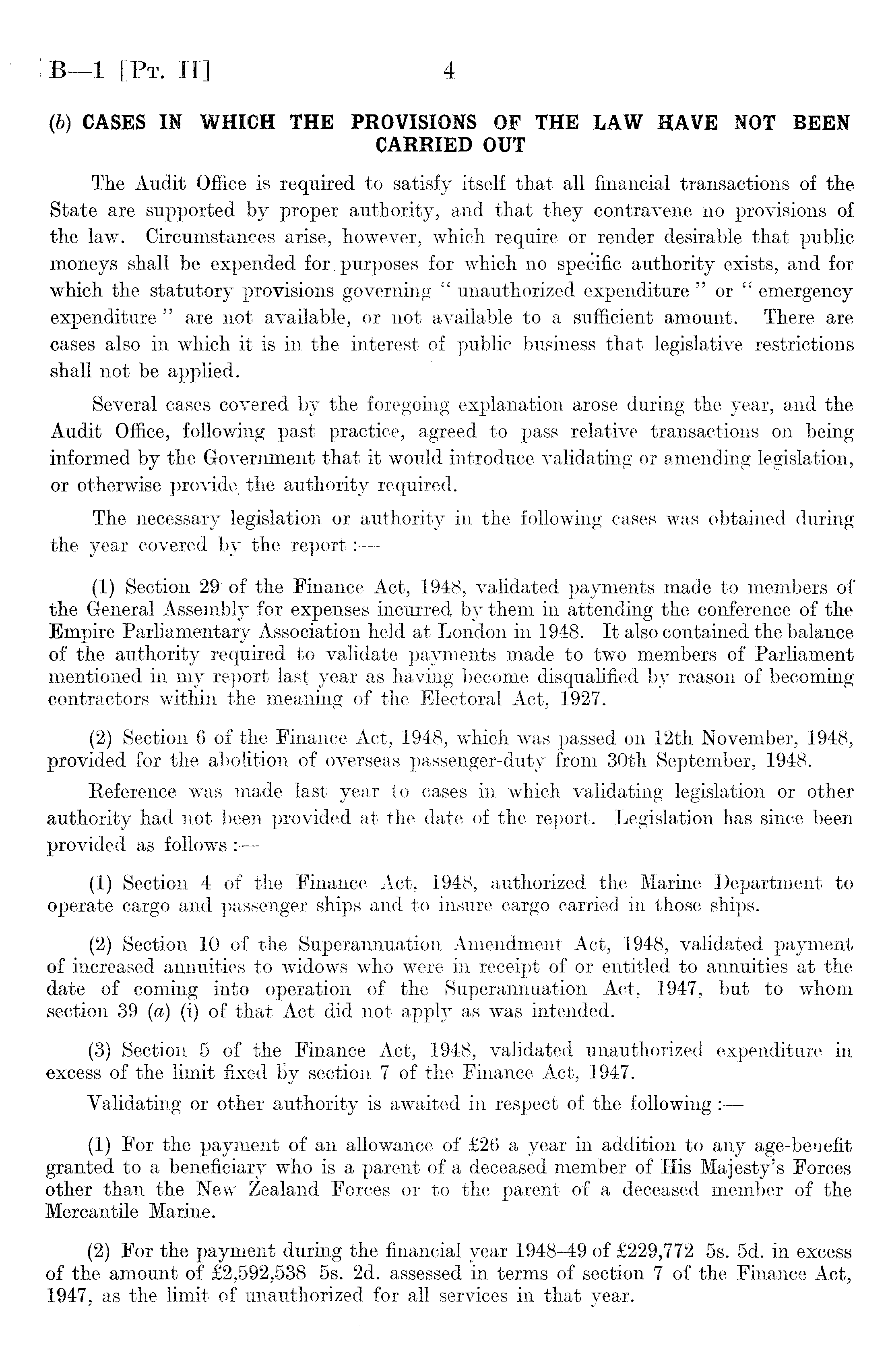 (b) CASES IN WHICH THE PROVISIONS OF THE LAW HAVE NOT BEEN CARRIED OUT The Audit Office is required to satisfy itself that all financial transactions of the State are supported by proper authority, and that they contravene no provisions of the law. Circumstances arise, however, which require or render desirable that public moneys shall be expended for, purposes for which no specific authority exists, and for which the statutory provisions governing " unauthorized expenditure " or " emergency expenditure " are not available, or not available to' a sufficient amount. There are cases also in which it is in the interest of public business that legislative restrictions shall not be applied. Several cases coveted by the foregoing explanation arose during the year, and the Audit Office, following past practice, agreed to pass relative transactions on being informed by the Government that it would introduce validating or amending legislation, or otherwise provide, the authority required. The necessary legislation or authority in the following cases was obtained during the year covered by the report: — (1) Section 29 of the Finance Act, 1948, validated payments made to members of the General Assembly for expenses incurred by them in attending the conference of the Empire Parliamentary Association held at London in 1948. It also contained the balance of the authority required to validate payments made to two members of Parliament mentioned in my report last year as having become disqualified by reason of becoming contractors within the meaning of the Electoral Act, 1927. (2) Section 6 of the Finance Act, 1948, which was passed on 12th November, 1948, provided for the abolition of overseas passenger-duty from 30th September, 1948. Reference was made last year to cases in which validating legislation or other authority had not been provided at the date of the report. Legislation has since been provided as follows : (1) Section 4 of the Finance Act, 1948, authorized the Marine Department to operate cargo and passenger ships and to insure cargo carried in those ships. (2) Section 10 of the Superannuation Amendment Act, 1948, validated payment of increased annuities to widows who were in receipt of or entitled to annuities at the date of coming into operation of the Superannuation Act, 1947, but to whom section 39 (a) (i) of that Act did not apply as was intended. (3) Section 5 of the Finance Act, 1948, validated unauthorized expenditure in excess of the limit fixed By section 7 of the Finance Act, 1947. Validating or other authority is awaited in respect of the following (1) For the payment of an allowance of £26 a year in addition to any age-benefit granted to a beneficiary who is a parent of a deceased member of His Majesty's Forces other than the New Zealand Forces or to the parent of a deceased member of the Mercantile Marine. (2) For the payment during the financial year 1948-49 of £229,772 ss. sd. in excess of the amount of £2,592,538 ss. 2d. assessed in terms of section 7 of the Finance Act, 1947, as the limit of unauthorized for all services in that year.