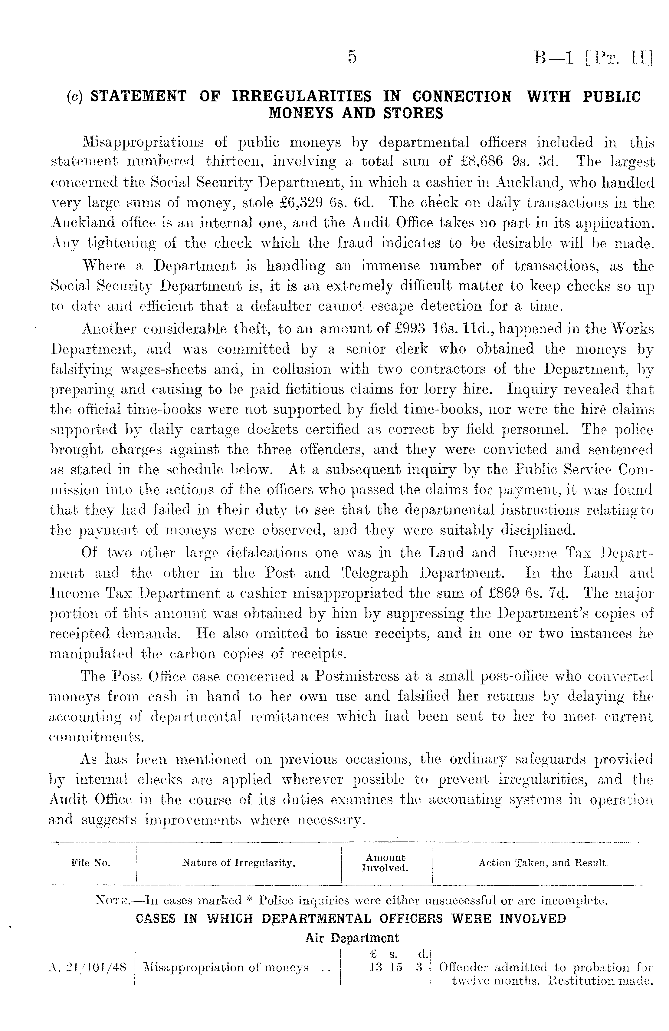 (c) STATEMENT OF IRREGULARITIES IN CONNECTION WITH PUBLIC MONEYS AND STORES Misappropriations of public moneys by departmental officers included in this statement numbered thirteen, involving a total sum of £8,686 9s. 3d. The largest concerned the Social Security Department, in which a cashier in Auckland, who handled very large sums of money, stole £6,329 6s. 6d. The check on daily transactions in the Auckland office is an internal one, and the Audit Office takes no part in its application. Any tightening of the check which the fraud indicates to be desirable will be made. Where a Department is handling an immense number of transactions, as the Social Security Department is, it is an extremely difficult matter to keep checks so up to date and efficient that a defaulter cannot escape detection for a time. Another considerable theft, to an amount of £993 16s. lid., happened in the Works Department, and was committed by a senior clerk who obtained the moneys by falsifying wages-sheets and, in collusion with two contractors of the Department, by preparing and causing to be paid fictitious claims for lorry hire. Inquiry revealed that the official time-books were not supported by field time-books, nor were the hire claims supported by daily cartage dockets certified as correct by field personnel. The police brought charges against the three offenders, and they were convicted and sentenced as stated in the schedule below. At a subsequent inquiry by the Public Service Commission into the actions of the officers who passed the claims for payment, it was found that they had failed in their duty to see that the departmental instructions relating to the payment of moneys were observed, and they were suitably disciplined. Of two other large defalcations one was in the Land and Income Tax Department and the other in the Post and Telegraph Department. In the Land and Income Tax Department a cashier misappropriated the sum of £869 6s. 7d. The major portion of this amount was obtained by him by suppressing the Department's copies of receipted demands. He also omitted to issue receipts, and in one or two instances he manipulated the carbon copies of receipts. The Post Office case concerned a Postmistress at a small post-office who converted moneys from cash in hand to her own use and falsified her returns by delaying the accounting of departmental remittances which had been sent to her to meet current commitments. As has been mentioned on previous occasions, the ordinary safeguards provided by internal checks are applied wherever possible to prevent irregularities, and the Audit Office in the course of its duties examines the accounting systems in operation and suggests improvements where necessary.