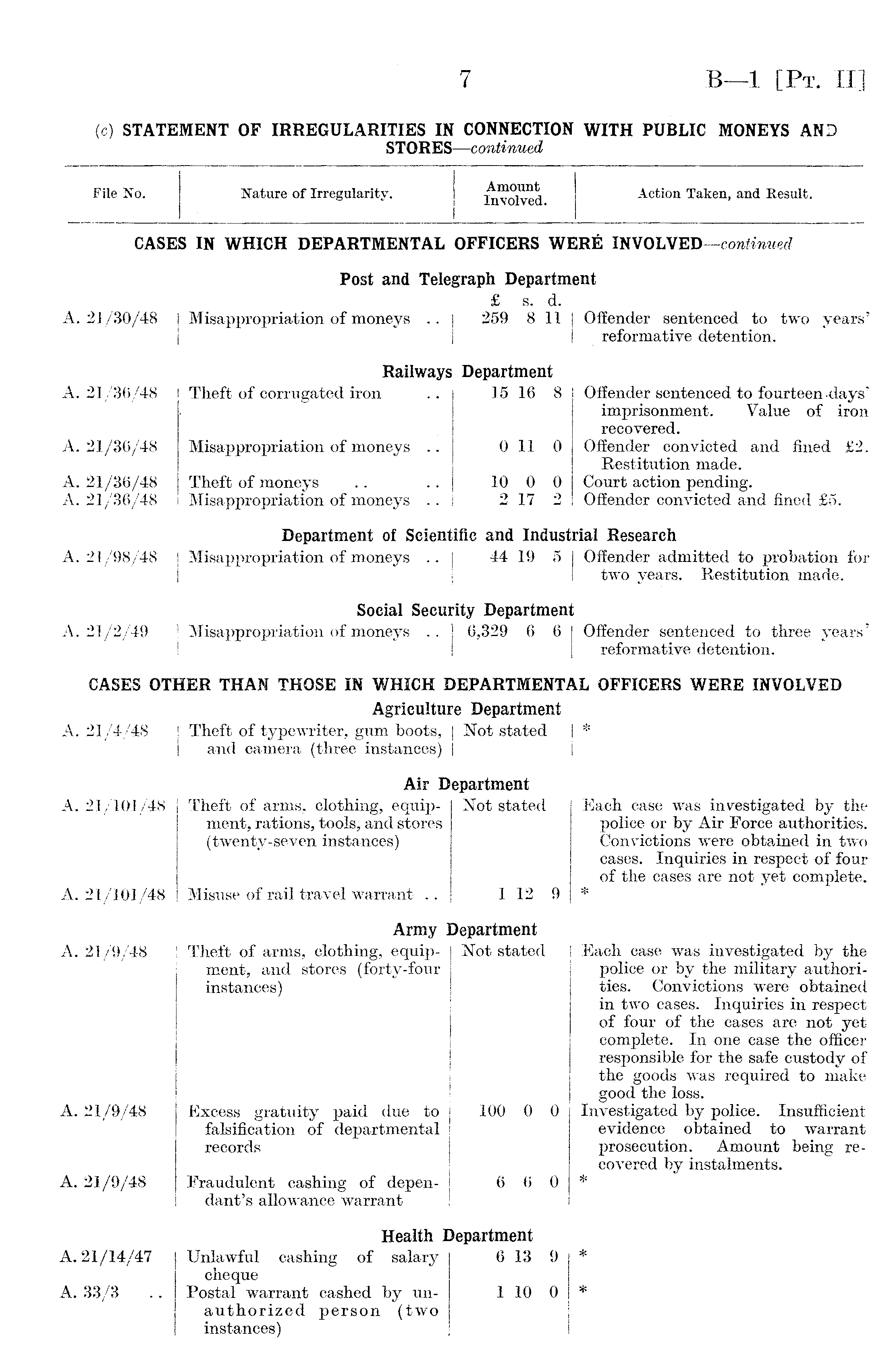 File No. Nature of Irregularity. Amount i Involved. 1 Action Taken, and Result. « CASES IN WHICH DEPARTMENTAL OFFICERS WERE INVOLVED —continued Post and Telegraph Department A. 21/30/48 Misappropriation of moneys .. X. s. u. 259 8 11 1 Offender sentenced to two years' I reformative detention. A. 21/36/48 A. 21/36/48 A. 21/36/48 A. 21/36/48 Railways Theft of corrugated iron Misappropriation of moneys .. Theft of moneys Misappropriation of moneys .. Department 15 16 8 0 11 0 10 0 0 2 17 2 Offender sentenced to fourteen days' imprisonment. Value of iron recovered. Offender convicted and fined £2. Restitution made. Court action pending. Offender convicted and fined £5. A. 21/98/48 Department of Scientific and Industrial Research Misappropriation of moneys .. 1 44 19 5 1 Offender admitted to probation for 1 1 two years. Restitution made. A. 21/2/49 Social Security Departmeni Misappropriation of moneys .. j 6,329 6 6 t 1 Offender sentenced to three years' 1 reformative detention. CASES OTHER THAN THOSE IN WHICH DEPARTMENTAL OFFICERS WERE INVOLVED A. 21/4/48 Agriculture Department Theft of typewriter, gum boots, 1 Not stated and camera (three instances) 1 * 1 A. 21/101/48 A. 21/101/48 Air D Theft of arms, clothing, equipment, rations, tools, and stores (twenty-seven instances) Misuse of rail travel warrant .. epartment Not stated 1 12 9 Each case was investigated by the police or by Air Force authorities. Convictions were obtained in two cases. Inquiries in respect of four of the cases are not yet complete. * A. 21/9/48 A. 21/9/48 A. 21/9/48 Army 1 Theft of arms, clothing, equipment, and stores (forty-four instances) Excess gratuity paid due to falsification of departmental records Fraudulent cashing of dependant's allowance warrant Department Not stated 100 0 0 6 6 0 Each case was investigated by the police or by the military authorities. Convictions were obtained in two cases. Inquiries in respect of four of the cases are not yet complete. In one case the officer responsible for the safe custody of the goods was required to make good the loss. Investigated by police. Insufficient evidence obtained to warrant prosecution. Amount being recovered by instalments. * A. 21/14/47 A. 33/3 .. Health I Unlawful cashing of salary cheque Postal warrant cashed by unauthorized person (two instances) )epartment 6 13 9 1 10 0 * *