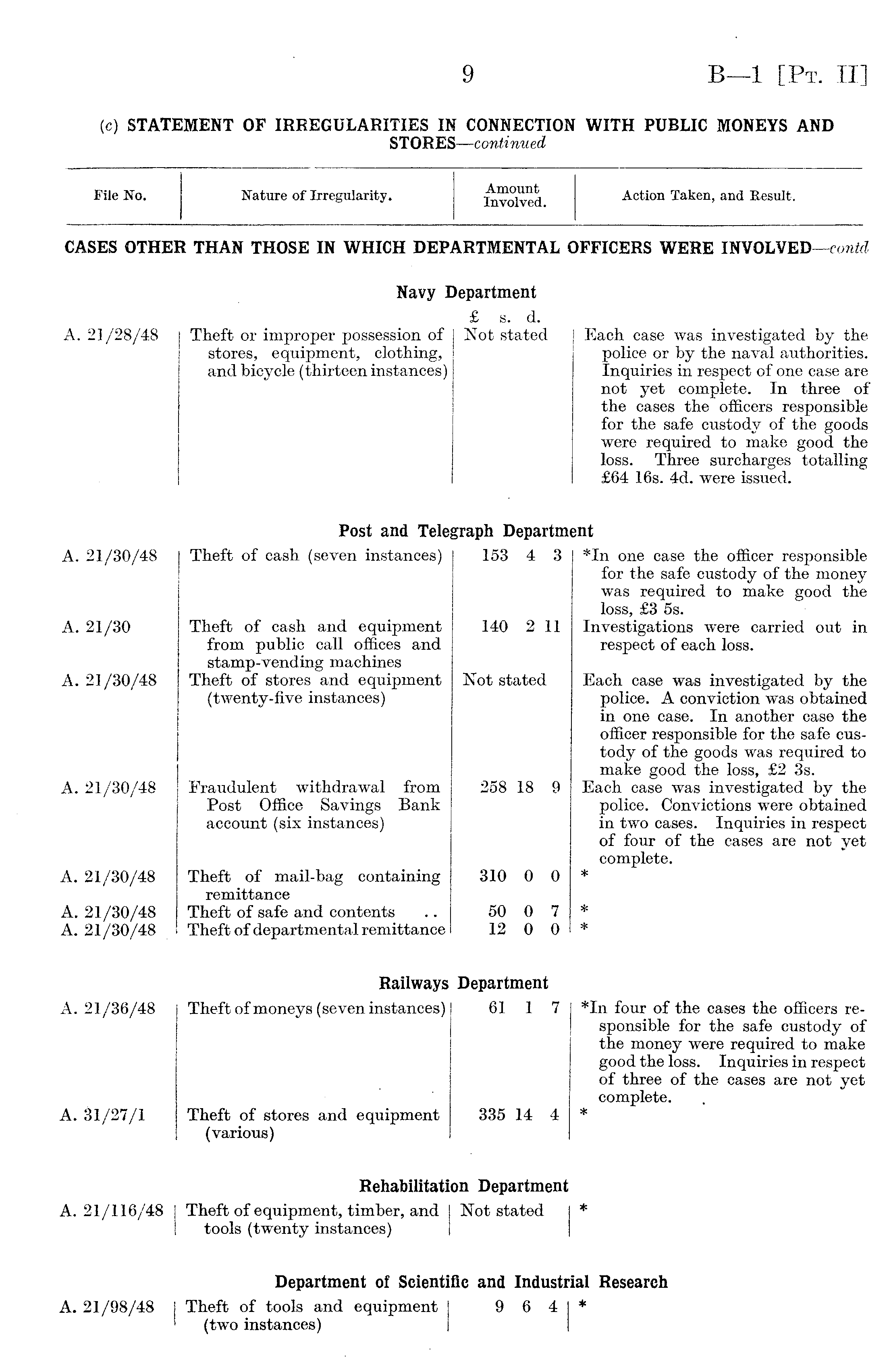 File No. Nature of Irregularity. Amount Involved. Action Taken, and Result. CASES OTHER THAN THOSE IN WHICH DEPARTMENTAL OFFICERS WERE INVOLVED —contd Navy Department A. 21/28/48 Theft or improper possession of stores, equipment, clothing, and bicycle (thirteen instances) £ s. a. Not stated Each case was investigated by the police or by the naval authorities. Inquiries in respect of one case are not yet complete. In three of the cases the officers responsible for the safe custody of the goods were required to make good the loss. Three surcharges totalling £64 16s. 4d. were issued. Post and Telegraph Department A. 21/30/48 A. 21/30 A. 21/30/48 A. 21/30/48 A. 21/30/48 A. 21/30/48 A. 21/30/48 Theft of cash (seven instances) Theft of cash and equipment from public call offices and stamp-vending machines Theft of stores and equipment (twenty-five instances) Fraudulent withdrawal from Post Office Savings Bank account (six instances) Theft of mail-bag containing remittance Theft of safe and contents Theft of departmental remittance 153 4 3 140 2 11 Not stated 258 18 9 310 0 0 50 0 7 12 0 0 *In one case the officer responsible for the safe custody of the money was required to make good the loss, £3 5s. Investigations were carried out in respect of each loss. Each case was investigated by the police. A conviction was obtained in one case. In another case the officer responsible for the safe custody of the goods was required to make good the loss, £2 3s. Each case was investigated by the police. Convictions were obtained in two cases. Inquiries in respect of four of the cases are not yet complete. * * * Railways Department A. 21/36/48 A. 31/27/1 Theft of moneys (seven instances) Theft of stores and equipment (various) 61 1 7 335 14 4 *In four of the cases the officers responsible for the safe custody of the money were required to make good the loss. Inquiries in respect of three of the cases are not yet complete. * Rehabilitation Department A. 21/116/48 | Theft of equipment, timber, and 1 tools (twenty instances) Not stated | * • Department of Scientific and Industrial Research A. 21/98/48 j Theft of tools and equipment j (two instances) I 9 6 4 | *