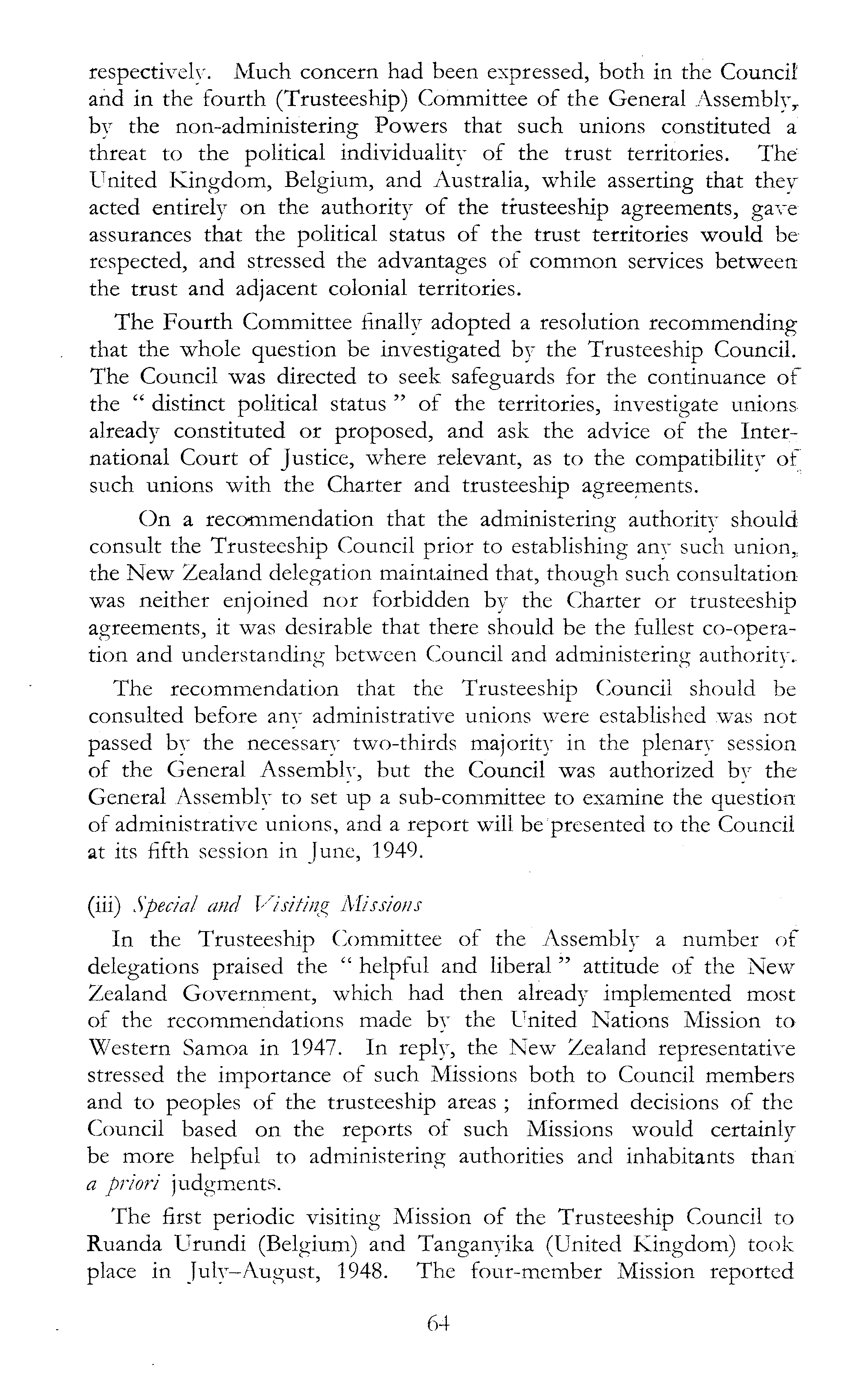 respectively. Much concern had been expressed, both in the Council and in the fourth (Trusteeship) Committee of the General Assembly,, by the non-administering Powers that such unions constituted a threat to the political individuality of the trust territories. The United Kingdom, Belgium, and Australia, while asserting that they acted entirely on the authority of the trusteeship agreements, gave assurances that the political status of the trust territories would be respected, and stressed the advantages of common services between the trust and adjacent colonial territories. The Fourth Committee finally adopted a resolution recommending that the whole question be investigated by the Trusteeship Council. The Council was directed to seek safeguards for the continuance of the " distinct political status " of the territories, investigate unions already constituted or proposed, and ask the advice of the International Court of Justice, where relevant, as to the compatibility of such unions with the Charter and trusteeship agreements. On a recommendation that the administering authority should consult the Trusteeship Council prior to establishing any such union, the New Zealand delegation maintained that, though such consultation was neither enjoined nor forbidden by the Charter or trusteeship agreements, it was desirable that there should be the fullest co-opera-tion and understanding between Council and administering authority. The recommendation that the Trusteeship Council should be consulted before any administrative unions were established was not passed by the necessary two-thirds majority in the plenary session of the General Assembly, but the Council was authorized by the General Assembly to set up a sub-committee to examine the question of administrative unions, and a report will be presented to the Council at its fifth session in June, 1949. (iii) Special and Visiting Missions In the Trusteeship Committee of the Assembly a number of delegations praised the " helpful and liberal" attitude of the New Zealand Government, which had then already implemented most of the recommendations made by the United Nations Mission to Western Samoa in 1947. In reply, the New Zealand representative stressed the importance of such Missions both to Council members and to peoples of the trusteeship areas ; informed decisions of the Council based on the reports of such Missions would certainly be more helpful to administering authorities and inhabitants than a priori judgments. The first periodic visiting Mission of the Trusteeship Council to Ruanda Urundi (Belgium) and Tanganyika (United Kingdom) took place in July-August, 1948. The four-member Mission reported