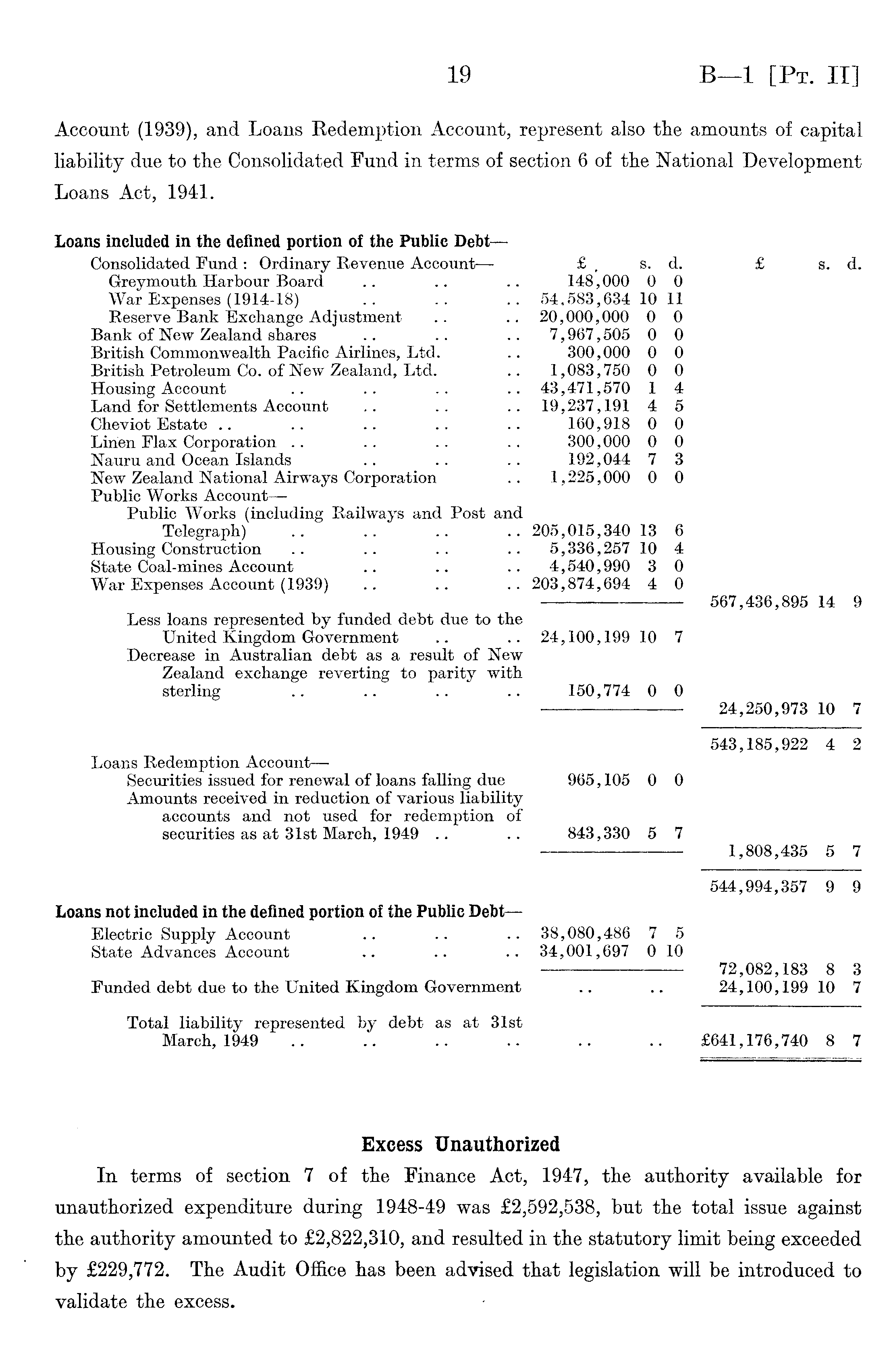 Account (1939), and Loans Redemption Account, represent also the amounts of capital liability due to the Consolidated Fund in terms of section 6 of the National Development Loans Act, 1941. Loans included in the defined portion of the Public Debt — Consolidated Fund: Ordinary Revenue Account — £ s. d. £ s. d. Greymouth Harbour Board .. .. .. 148,000 0 0 War Expenses (1914-18) .. .. .. 54,583,634 10 11 Reserve Bank Exchange Adjustment .. .. 20,000,000 0 0 Bank of New Zealand shares .. .. .. 7,967,505 0 0 British Commonwealth Pacific Airlines, Ltd. .. 300,000 0 0 British Petroleum Co. of New Zealand, Ltd. .. 1,083,750 0 0 Housing Account .. .. .. .. 43,471,570 1 4 Land for Settlements Account .. .. .. 19,237,191 4 5 Cheviot Estate .. .. .. .. .. 160,918 0 0 Linen Flax Corporation .. .. .. .. 300,000 0 0 Nauru and Ocean Islands .. .. .. 192,044 7 3 New Zealand National Airways Corporation .. 1,225,000 0 0 Public Works Account— Public Works (including Railways and Post and Telegraph) .. .. .. ..205,015,340 13 6 Housing Construction .. .. .. .. 5,336,257 10 4 State Coal-mines Account .. .. .. 4,540,990 3 0 War Expenses Account (1939) .. .. .. 203,874,694 4 0 567,436,895 14 9 Less loans represented by funded debt due to the United Kingdom Government .. .. 24,100,199 10 7 Decrease in Australian debt as a result of New Zealand exchange reverting to parity with sterling .. .. .. .. 150,774 0 0 24,250,973 10 7 543,185,922 4 2 Loans Redemption Account— Securities issued for renewal of loans falling due 965,105 0 0 Amounts received in reduction of various liability accounts and not used for redemption of securities as at 31st March, 1949 .. .. 843,330 5 7 1,808,435 5 7 544,994,357 9 9 Loans not included in the defined portion of the Public Debt — Electric Supply Account .. .. .. 38,080,486 7 5 State Advances Account .. .. .. 34,001,697 0 10 72,082,183 8 3 Funded debt due to the United Kingdom Government .. .. 24,100,199 10 7 Total liability represented by debt as at 31st March, 1949 .. .. .. .. .. .. £641,176,740 8 7 - V Excess Unauthorized In terms of section 7 of the Finance Act, 1947, the authority available for unauthorized expenditure during 1948-49 was £2,592,538, but the total issue against the authority amounted to £2,822,310, and resulted in the statutory limit being exceeded by £229,772. The Audit Office has been advised that legislation will be introduced to validate the excess.