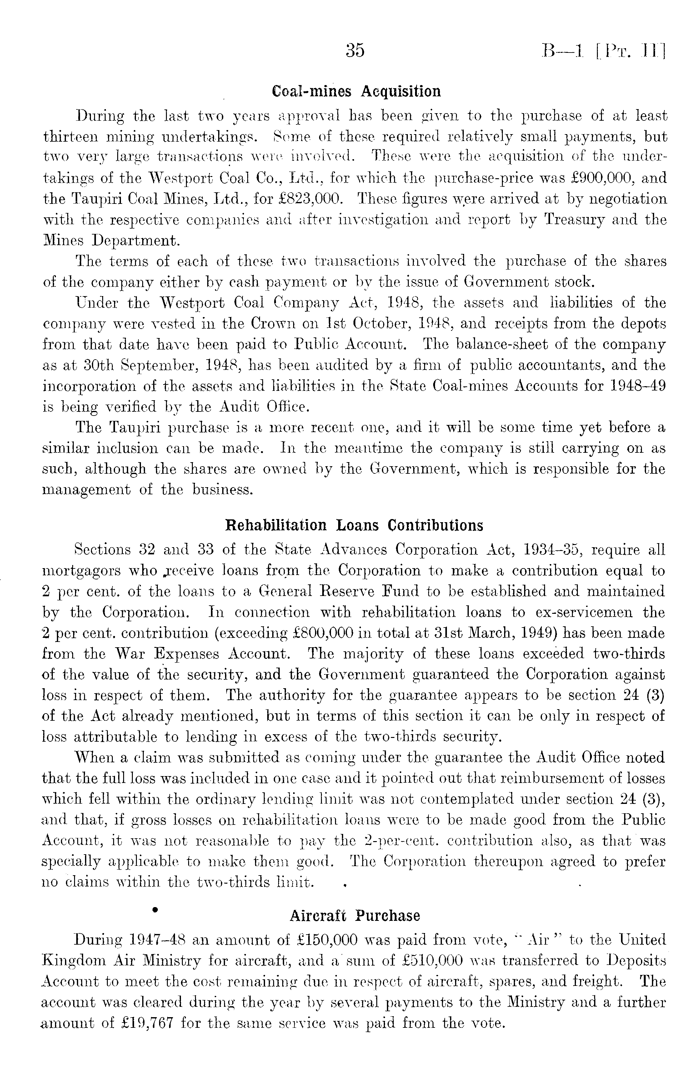 Coal-mines Acquisition During the last two years approval lias been given to the purchase of at least thirteen mining undertakings. Some of these required, relatively small payments, but two very large transactions were involved. These were the acquisition of the undertakings of the Westport Coal Co., Ltd., for which the purchase-price was £900,000, and the Taupiri Coal Mines, Ltd., for £823,000. These figures were arrived at by negotiation with the respective companies and after investigation and report by Treasury and the Mines Department. The terms of each of these two transactions involved the purchase of the shares of the company either by cash payment or by the issue of Government stock. Under the Westport Coal Company Act, 1948, the assets and liabilities of the company were vested in the Crown on Ist October, 1948, and receipts from the depots from that date have been paid to Public Account. The balance-sheet of the company as at 30th September, 1948, has been audited by a firm of public accountants, and the incorporation of the assets and liabilities in the State Coal-mines Accounts for 1948-49 is being verified by the Audit Office. The Taupiri purchase is a more recent one, and it will be some time yet before a similar inclusion can be made. In the meantime the company is still carrying on as such, although the shares are owned by the Government, which is responsible for the management of the business. Rehabilitation Loans Contributions Sections 32 and 33 of the State Advances Corporation Act, 1934-35, require all mortgagors who .receive loans from the Corporation to make a contribution equal to 2 per cent, of the loans to a General Reserve Fund to be established and maintained by the Corporation. In connection with rehabilitation loans to ex-servicemen the 2 per cent, contribution (exceeding £BOO,OOO in total at 31st March, 1949) has been made from the War Expenses Account. The majority of these loans exceeded two-thirds of the value of the security, and the Government guaranteed the Corporation against loss in respect of them. The authority for the guarantee appears to be section 24 (3) of the Act already mentioned, but in terms of this section it can be only in respect of loss attributable to lending in excess of the two-thirds security. When a claim was submitted as coming under the guarantee the Audit Office noted that the full loss was included in one case and it pointed out that reimbursement of losses which fell within the ordinary lending limit was not contemplated under section 24 (3), and that, if gross losses on rehabilitation loans were to be made good from the Public Account, it was not reasonable to pay the 2-per-cent. contribution also, as that was specially applicable to make them good. The Corporation thereupon agreed to prefer no claims within the two-thirds limit. * Aircraft Purchase During 1947-48 an amount of £150,000 was paid from vote, " Air " to the United Kingdom Air Ministry for aircraft, and a' sum of £510,000 was transferred to Deposits Account to meet the cost remaining due in respect of aircraft, spares,, and freight. The account was cleared during the year by several payments to the Ministry and a further amount of £19,767 for the same service was paid from the vote.