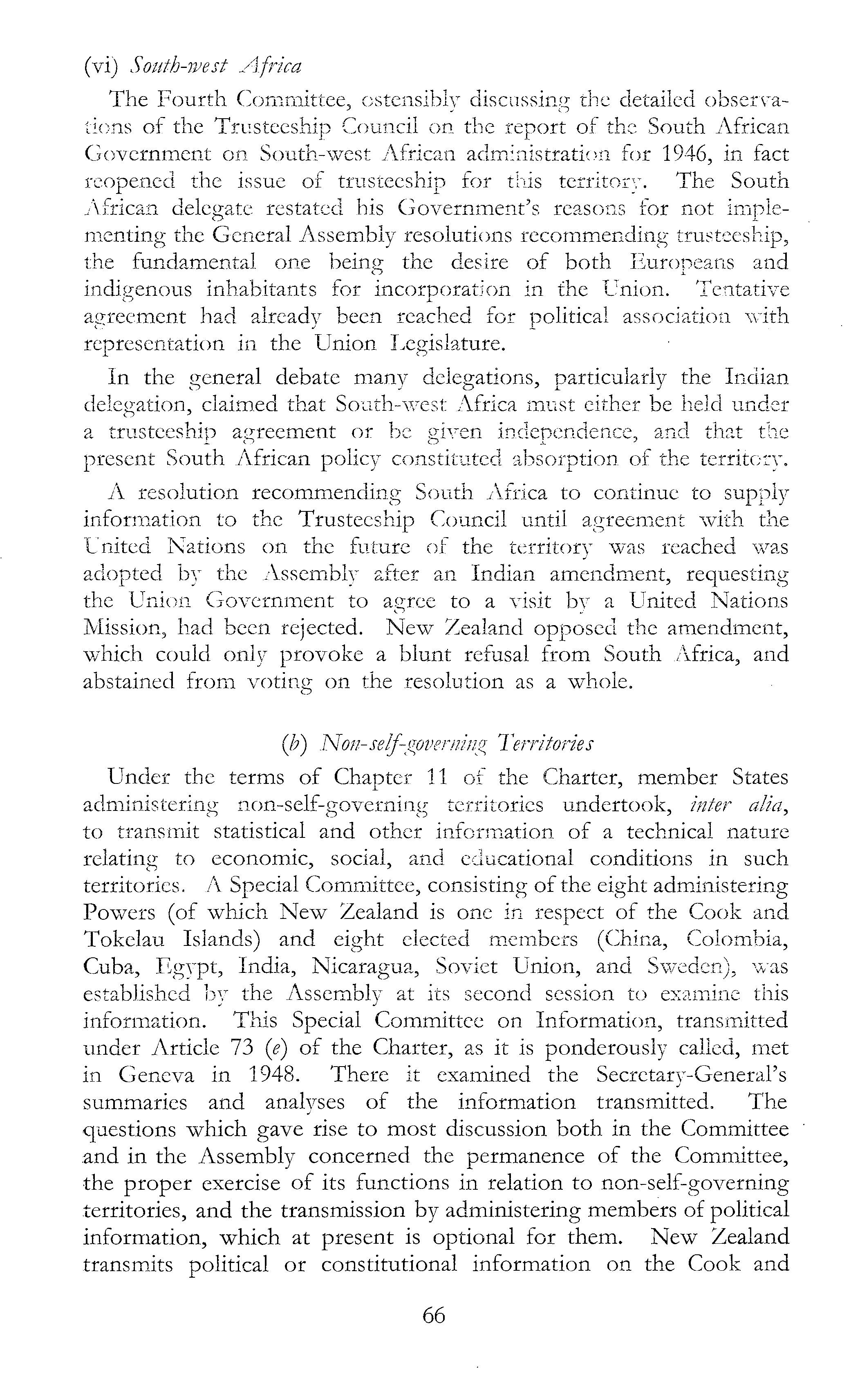 (vi) South-west Africa The Fourth Committee, ostensibly discussing the detailed observations of the Trusteeship Council on the report of the South African Government on South-west African administration for 1946, in fact reopened the issue of trusteeship for this territory. The South African delegate restated his Government's reasons for not implementing the General Assembly resolutions recommending trusteeship, the fundamental one being the desire of both Europeans and indigenous inhabitants for incorporation in the Union. Tentative agreement had already been reached for political association with representation in the Union Legislature. In the general debate many delegations, particularly the Indian delegation, claimed that South-west Africa must either be held under a trusteeship agreement or be given independence, and that the present South African policy constituted absorption of the territory. A resolution recommending South Africa to continue to supply information to the Trusteeship Council until agreement with the United Nations on the future of the territory was reached was adopted by the Assembly after an Indian amendment, requesting the Union Government to agree to a visit by a United Nations Mission, had been rejected. New Zealand opposed the amendment, which could only provoke a blunt refusal from South Africa, and abstained from voting on the resolution as a whole. (b) Non- self-governing Territories Under the terms of Chapter 11 of the Charter, member States administering non-self-governing territories undertook, inter alia, to transmit statistical and other information of a technical nature relating to economic, social, and educational conditions in such territories. A Special Committee, consisting of the eight administering Powers (of which New Zealand is one in respect of the Cook and Tokelau Islands) and eight elected members (China, Colombia, Cuba, Egypt, India, Nicaragua, Soviet Union, and Sweden), was established by the Assembly at its second session to examine this information. This Special Committee on Information, transmitted under Article 73 (e) of the Charter, as it is ponderously called, met in Geneva in 1948. There it examined the Secretary-General's summaries and analyses of the information transmitted. The questions which gave rise to most discussion both in the Committee and in the Assembly concerned the permanence of the Committee, the proper exercise of its functions in relation to non-self-governing territories, and the transmission by administering members of political information, which at present is optional for them. New Zealand transmits political or constitutional information on the Cook and