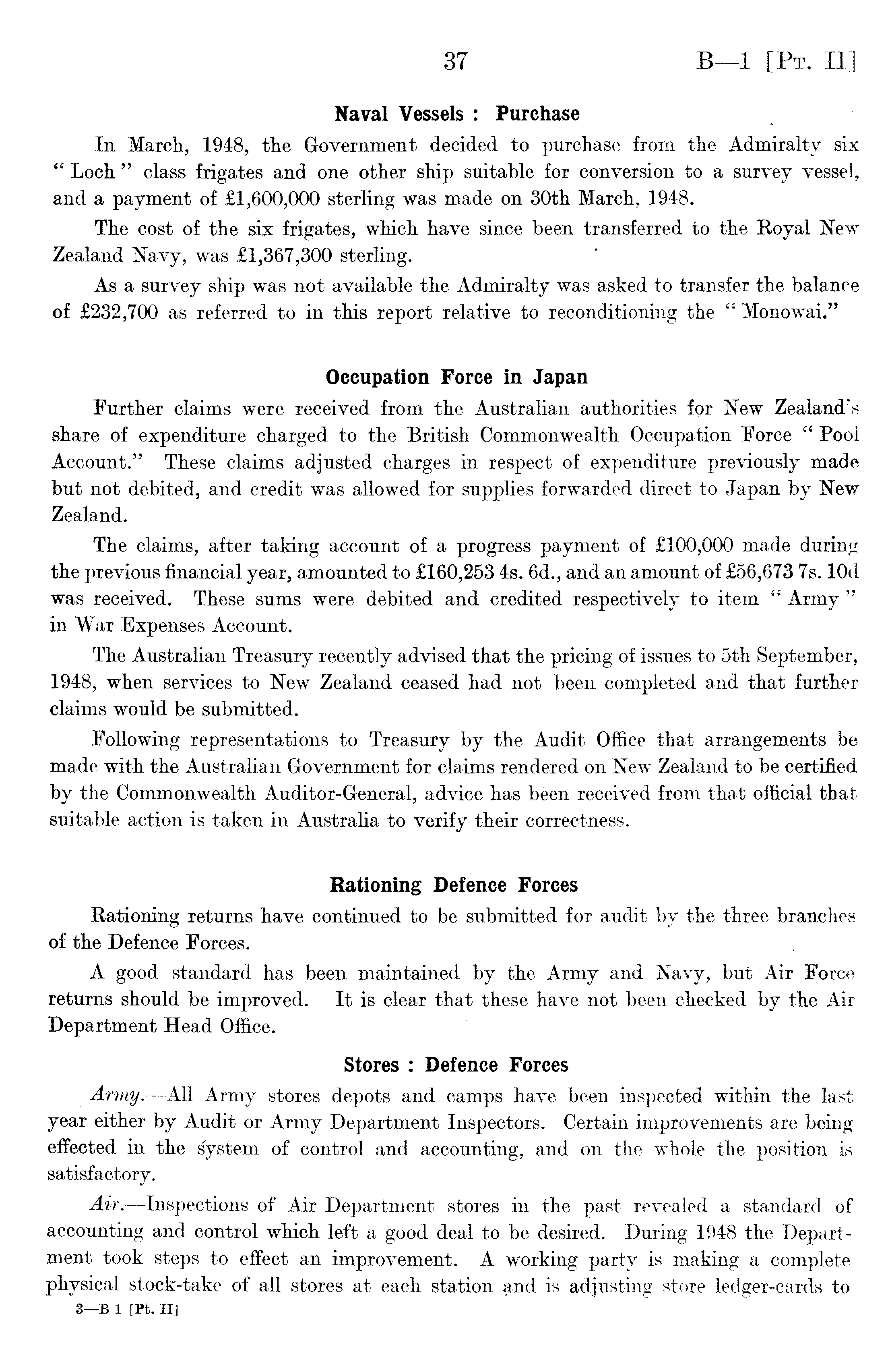 Naval Vessels : Purchase In March, 1948, the Government decided to purchase from the Admiralty six " Loch " class frigates and one other ship suitable for conversion to a survey vessel, and a payment of £1,600,000 sterling was made on 30th March, 1948. The cost of the six frigates, which have since been transferred to the Royal New Zealand Navy, was £1,367,300 sterling. As a survey ship was not available the Admiralty was asked to transfer the balance of £232,700 as referred to in this report relative to reconditioning the " Monowai." Occupation Force in Japan # Further claims were received from the Australian authorities for New Zealand's share of expenditure charged to the British Commonwealth Occupation Force " Pool Account." These claims adjusted charges in respect of expenditure previously made but not debited, and credit was allowed for supplies forwarded direct to Japan by New Zealand. The claims, after taking account of a progress payment of £lOO,OOO made during the previous financial year, amounted to £160,253 4s. 6d., and an amount of £56,673 7s. lOd was received. These sums were debited and credited respectively to item " Army " in War Expenses Account. The Australian Treasury recently advised that the pricing of issues to sth September, 1948, when services to New Zealand ceased had not been completed and that further claims would be submitted. Following representations to Treasury by the Audit Office that arrangements be made with the Australian Government for claims rendered on New Zealand to be certified by the Commonwealth Auditor-General, advice has been received from that official that suitable action is taken in Australia to verify their correctness. Rationing Defence Forces Rationing returns have continued to be submitted for audit by the three branches of the Defence Forces. A good standard has been maintained by the Army and Navy, but Air Force returns should be improved. It is clear that these have not been checked by the Air Department Head Office. Stores : Defence Forces v Army.—All Army stores depots and camps have been inspected within the last year either by Audit or Army Department Inspectors. Certain improvements are being effected in the system of control and accounting, and on the whole the position is satisfactory. Air. —Inspections of Air Department stores in the past revealed a standard of accounting and control which left a good deal to be desired. During 1948 the Department took steps to effect an improvement. A working party is making a complete physical stock-take of all stores at each station and is adjusting store ledger-cards to 3—B 1 [Pt. ll]