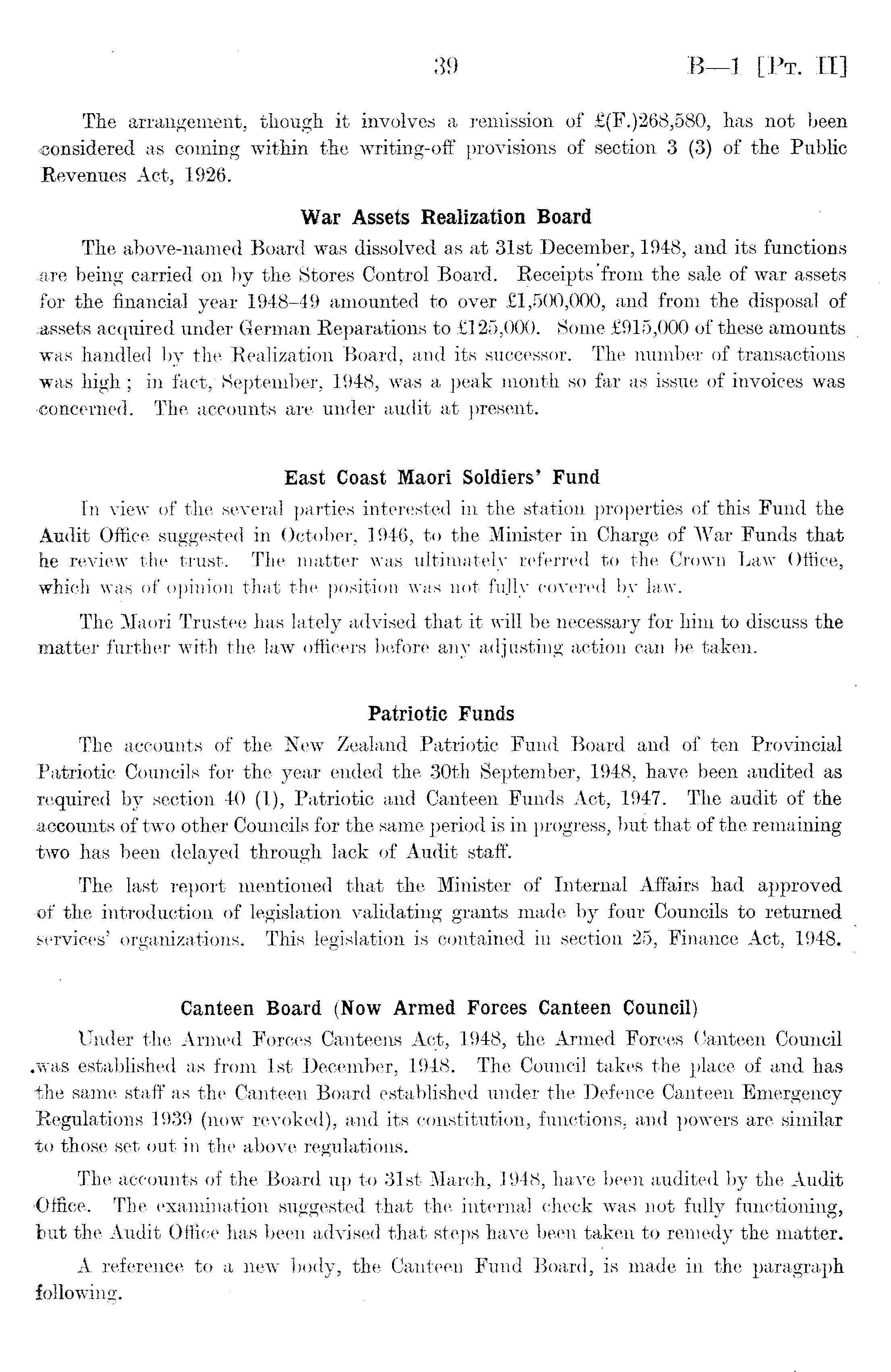 The arrangement, though it involves a remission of £(F.)268,580, has not been •considered as coming within the writing-off provisions of section 3 (3) of the Public Revenues Act, 1926. War Assets Realization Board The above-named Board was dissolved as at 31st December, 1948, and its functions .are being carried on by the Stores Control Board. Receipts from the sale of war assets for the financial year 1948-49 amounted to over £1,500,0 CX), and from the disposal of assets acquired under German Reparations to £125,000. Some £915,000 of these amounts was handled by the Realization Board, and its successor. The number of transactions was high ; in fact, September, 1948, was a peak month so far as issue of invoices was •concerned. The accounts are under audit at present. East Coast Maori Soldiers' Fund In view of the several parties interested in the station properties of this Fund the Audit Office suggested in October, 1946, to the Minister in Charge of War Funds that he review the trust. The matter was ultimately referred to the Crown Law Office, which was of opinion that the position was not fully covered by law. The Maori Trustee has lately advised that it will be necessary for him to discuss the matter further with the law officers before any adjusting action can be taken. Patriotic Funds The accounts of the New Zealand Patriotic Fund Board and of ten Provincial Patriotic Councils for the year ended the 30th September, 1948, have been audited as required by section 40 (1), Patriotic and Canteen Funds Act, 1947. The audit of the accounts of two other Councils for the same period is in progress, but that of the remaining two has been delayed through lack of Audit staff. The last report mentioned that the Minister of Internal Affairs had approved of the introduction of legislation validating grants made by four Councils to returned services' organizations. This legislation is contained in section 25, Finance Act, 1948. Canteen Board (Now Armed Forces Canteen Council) Under the Armed Forces Canteens Act, 1948, the Armed Forces Canteen Council .was established as from Ist December, 1948. The Council takes the place of and has the same staff as the Canteen Board established under the Defence Canteen Emergency Regulations 1939 (now revoked), and its constitution, functions, and powers are similar to those set out in the above regulations. The accounts of the Board up to 31st March, 1948, have been audited by the Audit •Office. The examination suggested that the internal check was not fully functioning, but the Audit Office has been advised that steps have been taken to remedy the matter. A reference to a new body, the Canteen Fund Board, is made in the paragraph following.