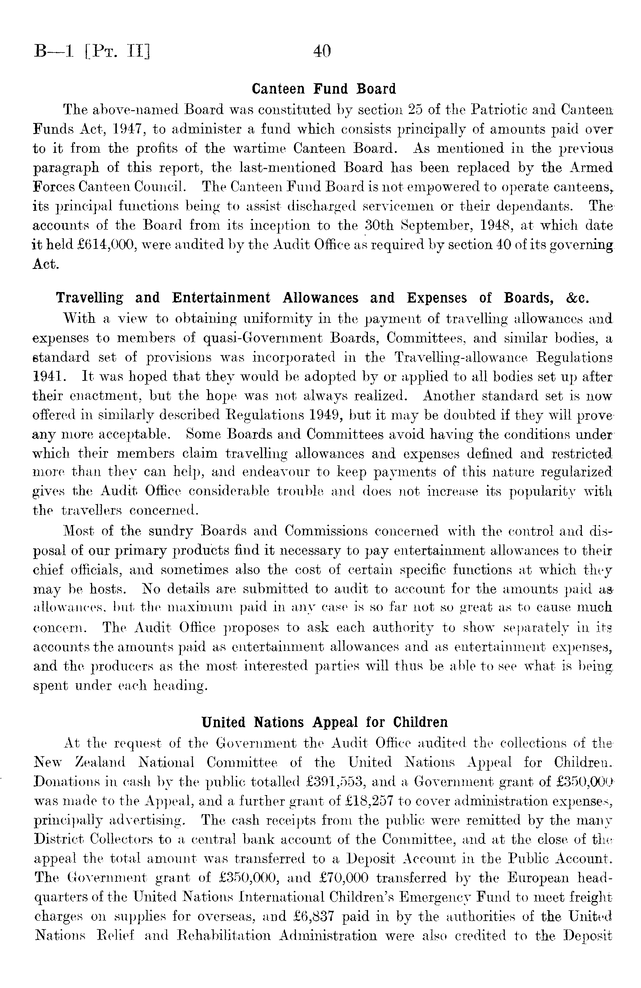 Canteen Fund Board The above-named Board was constituted by section 25 of the Patriotic and Canteen Funds Act, 1947, to administer a fund which consists principally of amounts paid over to it from the profits of the wartime Canteen Board. As mentioned in the previous paragraph of this report, the last-mentioned Board has been replaced by the Armed Forces Canteen Council. The Canteen Fund Board is not empowered to operate canteens,, its principal functions being to assist discharged servicemen or their dependants. The accounts of the Board from its inception to the 30th September, 1948, at which date it held £614,000, were audited by the Audit Office as required by section 40 of its governing Act. Travelling and Entertainment Allowances and Expenses of Boards, &c. With a view to obtaining uniformity in the payment of travelling allowances and expenses to members of quasi-Government Boards, Committees, and similar bodies, a standard set of provisions was incorporated in the Travelling-allowance Regulations 1941. It was hoped that they would be adopted by or applied to all bodies set up after their enactment, but the hope was not always realized. Another standard set is now offered in similarly described Regulations 1949, but it may be doubted if they will prove any more acceptable. Some Boards and Committees avoid having the conditions under which their members claim travelling allowances and expenses defined and restricted more than they can help, and endeavour to keep payments of this nature regularized gives the Audit Office considerable trouble and does not increase its popularity with the travellers concerned. Most of the sundry Boards and Commissions concerned with the control and disposal of our primary products find it necessary to pay entertainment allowances to their chief officials, and sometimes also the cost of certain specific functions at which they may be hosts. No details are submitted to audit to account for the amounts paid asallowances, but the maximum paid in any case is so far not so great as to cause much concern. The Audit Office proposes to ask each authority to show separately in its accounts the amounts paid as entertainment allowances and as entertainment expenses,, and the producers as the most interested parties will thus be able to see what is being, spent under each heading. United Nations Appeal for Children At the request of the Government the Audit Office audited the collections of theNew Zealand National Committee of the United Nations Appeal for Children. Donations in cash by the public totalled £391,553, and a Government grant of £350,000 was made to the Appeal, and a further grant of £18,257 to cover administration expenses,, principally advertising. The cash receipts from the public were remitted by the many District Collectors to a central bank account of the Committee, and at the close of the appeal the total amount was transferred to a Deposit Account in the Public Account. The Government grant of £350,000, and £70,000 transferred by the European headquarters of the United Nations International Children's Emergency Fund to meet freight charges on supplies for overseas, and £6,837 paid in by the authorities of the United Nations Relief and Rehabilitation Administration were also credited to the Deposit