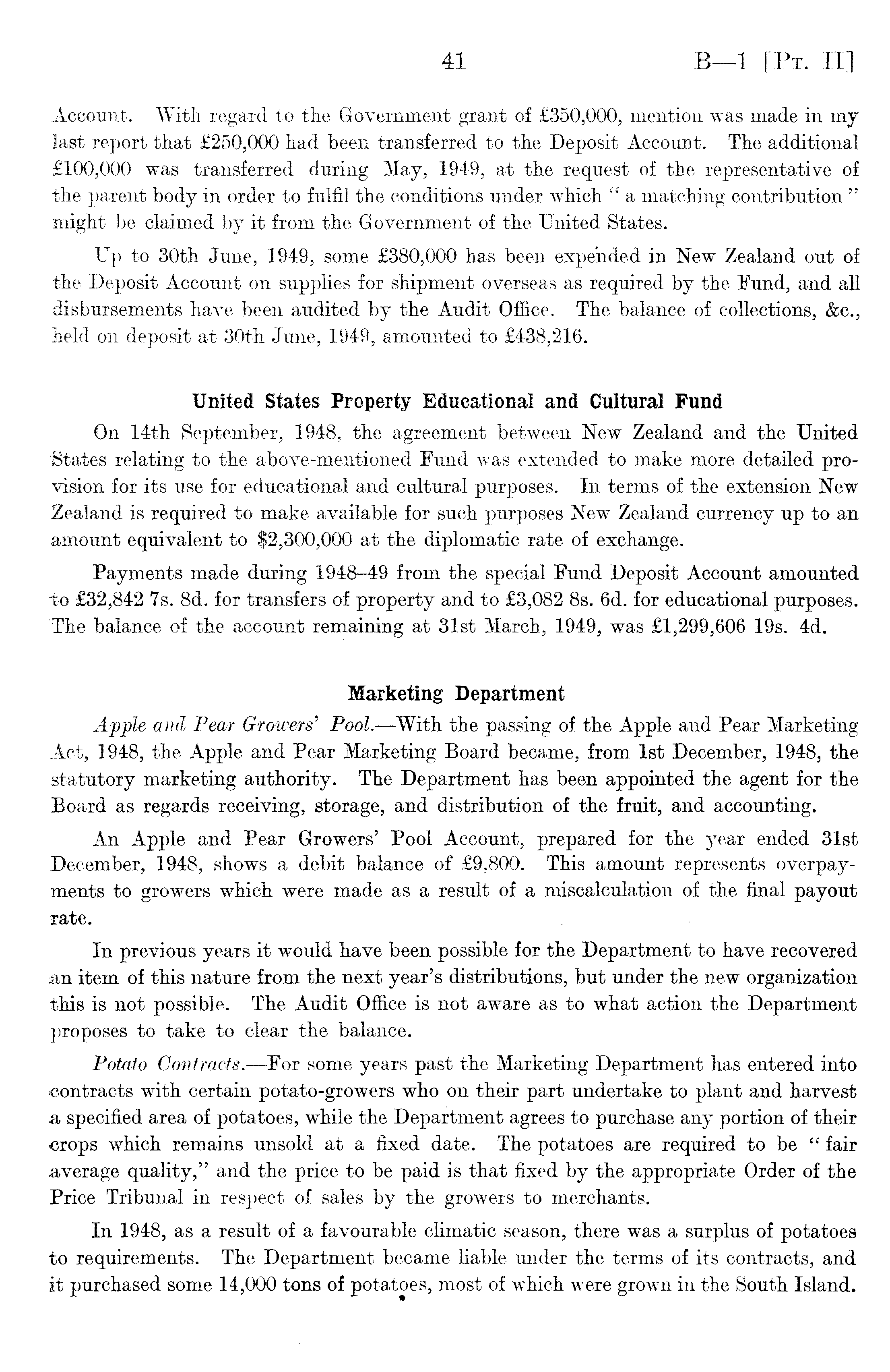 Account. With regard to the Government grant of £350,000, mention was made in my last report that £250,000 had been transferred to the Deposit Account. The additional £lOO,OOO was transferred during May, 1949, at the request of the representative of the parent body in order to fulfil the conditions under which " a matching contribution " might be claimed by it from the Government of the United States. Up to 30th June, 1949, some £380,000 has been expended in New Zealand out of the Deposit Account on supplies for shipment overseas as required by the Fund, and all •disbursements have been audited by the Audit Office. The balance of collections, &c., held on deposit at 30th June, 1949, amounted to £438,216. United States Property Educational and Cultural Fund On 14th September, 1948, the agreement between New Zealand and the United States relating to the above-mentioned Fund was extended to make more detailed provision for its use for educational and cultural purposes. In terms of the extension New Zealand is required to make available for such purposes New Zealand currency up to an amount equivalent to $2,300,000 at the diplomatic rate of exchange. Payments made during 1948-49 from the special Fund Deposit Account amounted to £32,842 7s. Bd. for transfers of property and to £3,082 Bs. 6d. for educational purposes. The balance of the account remaining at 31st March, 1949, was £1,299,606 19s. 4d. Marketing Department Apple and Pear Growers' Pool.—With the passing of the Apple and Pear Marketing Act, 1948, the Apple and Pear Marketing Board became, from Ist December, 1948, the statutory marketing authority. The Department has been appointed the agent for the Board as regards receiving, storage, and distribution of the fruit, and accounting. An Apple and Pear Growers' Pool Account, prepared for the year ended 31st December, 1948, shows a debit balance of £9,800. This amount represents overpayments to growers which were made as a result of a miscalculation of the final payout rate. In previous years it would have been possible for the Department to have recovered an item of this nature from the next year's distributions, but under the new organization this is not possible. The Audit Office is not aware as to what action the Department proposes to take to clear the balance. Potato Contracts.- —For some years past the Marketing Department has entered into contracts with certain potato-growers who on their part undertake to plant and harvest & specified area of potatoes, while the Department agrees to purchase any portion of their crops which remains unsold at a fixed date. The potatoes are required to be " fair average quality," and the price to be paid is that fixed by the appropriate Order of the Price Tribunal in respect of sales by the growers to merchants. In 1948, as a result of a favourable climatic season, there was a surplus of potatoes to requirements. The Department became liable under the terms of its contracts, and it purchased some 14,000 tons of potatoes, most of which were grown in the South Island.