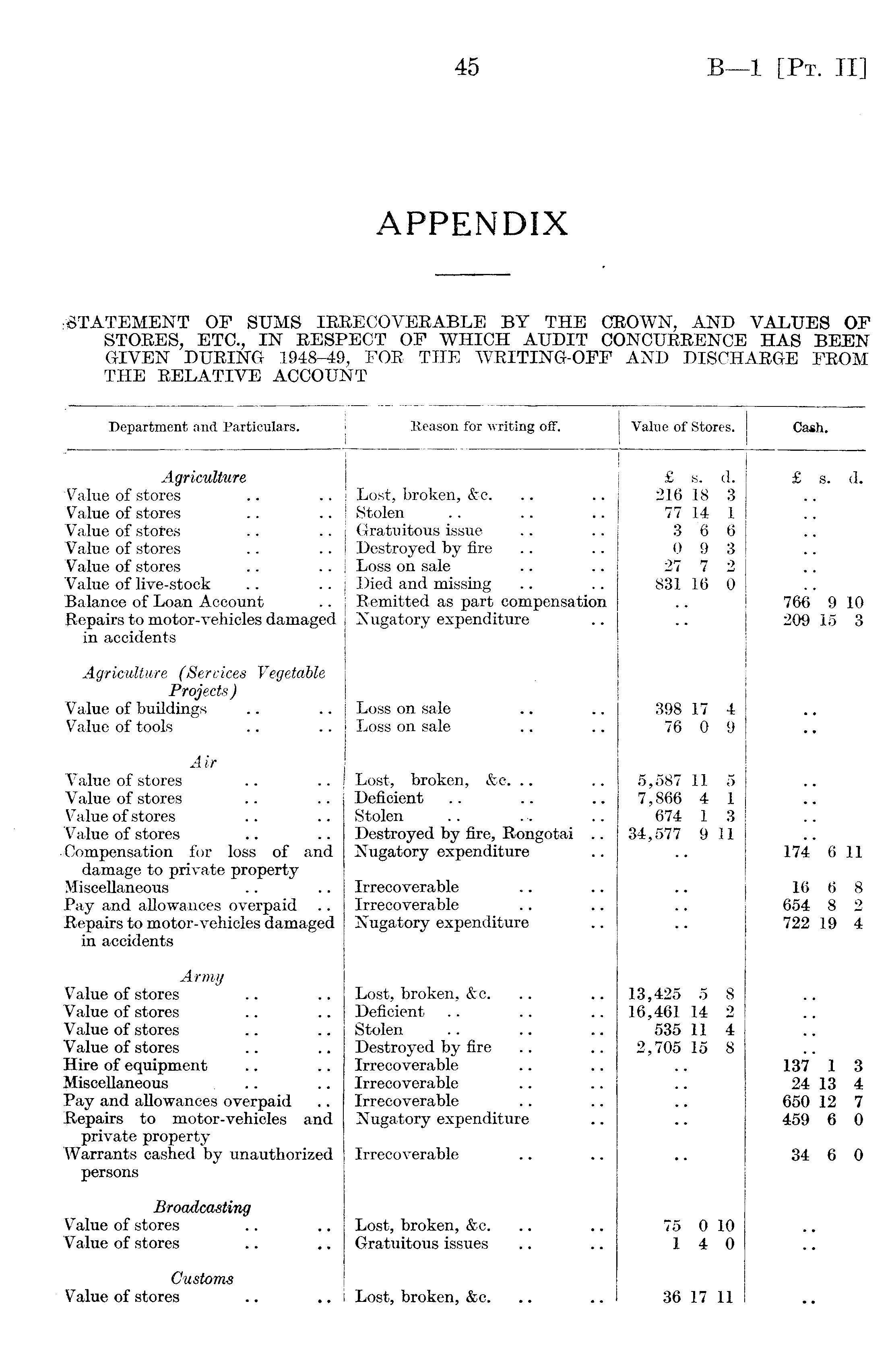 Department and Particulars. Reason for writing off. Value of Stores. Cash. Agriculture £ s. d. £ s. d. Value of stores .. Lost, broken, &c. 216 18 3 Value of stores Stolen 77 14 1 Value of stotes Gratuitous issue 3 6 6 Value of stores Destroyed by fire 0 9 3 Value of stores Loss on sale 27 7 2 Value of live-stock Died and missing 831 16 0 Balance of Loan Account Remitted as part compensation 766' 9 10 Repairs to motor-vehicles damaged Nugatory expenditure 209 15 3 in accidents Agriculture (Services Vegetable Projects ) Value of buildings Loss on sale 398 17 4 , , Value of tools Loss on sale 76 0 9 •• Air Value of stores Lost, broken, &c. 5,587 11 5 Value of stores Deficient 7,866 4 1 , , Value of stores Stolen 674 1 3 Value of stores Destroyed by fire, Rongotai .. 34,577 9 11 -Compensation for loss of and Nugatory expenditure 174 6 11 damage to private propertyMiscellaneous Irrecoverable ' 16 6 8 Pay and allowances overpaid Irrecoverable 654 8 2 Repairs to motor-vehicles damaged Nugatory expenditure 722 19 4 in accidents Army Value of stores Lost, broken, &c. 13,425 5 8 Value of stores Deficient 16,461 14 2 Value of stores Stolen 535 11 4 Value of stores Destroyed by fire 2,705 15 8 Hire of equipment Irrecoverable 137 1 3 Miscellaneous Irrecoverable 24 13 4 Pay and allowances overpaid Irrecoverable 650 12 7 Repairs to motor-vehicles and Nugatory expenditure 459 6 0 private property Warrants cashed by unauthorized Irrecoverable 34 6 0 persons Broadcasting Value of stores Lost, broken, &c. 75 0 10 Value of stores Gratuitous issues 1 4 0 •• Customs Value of stores Lost, broken, &c. 36 17 11
