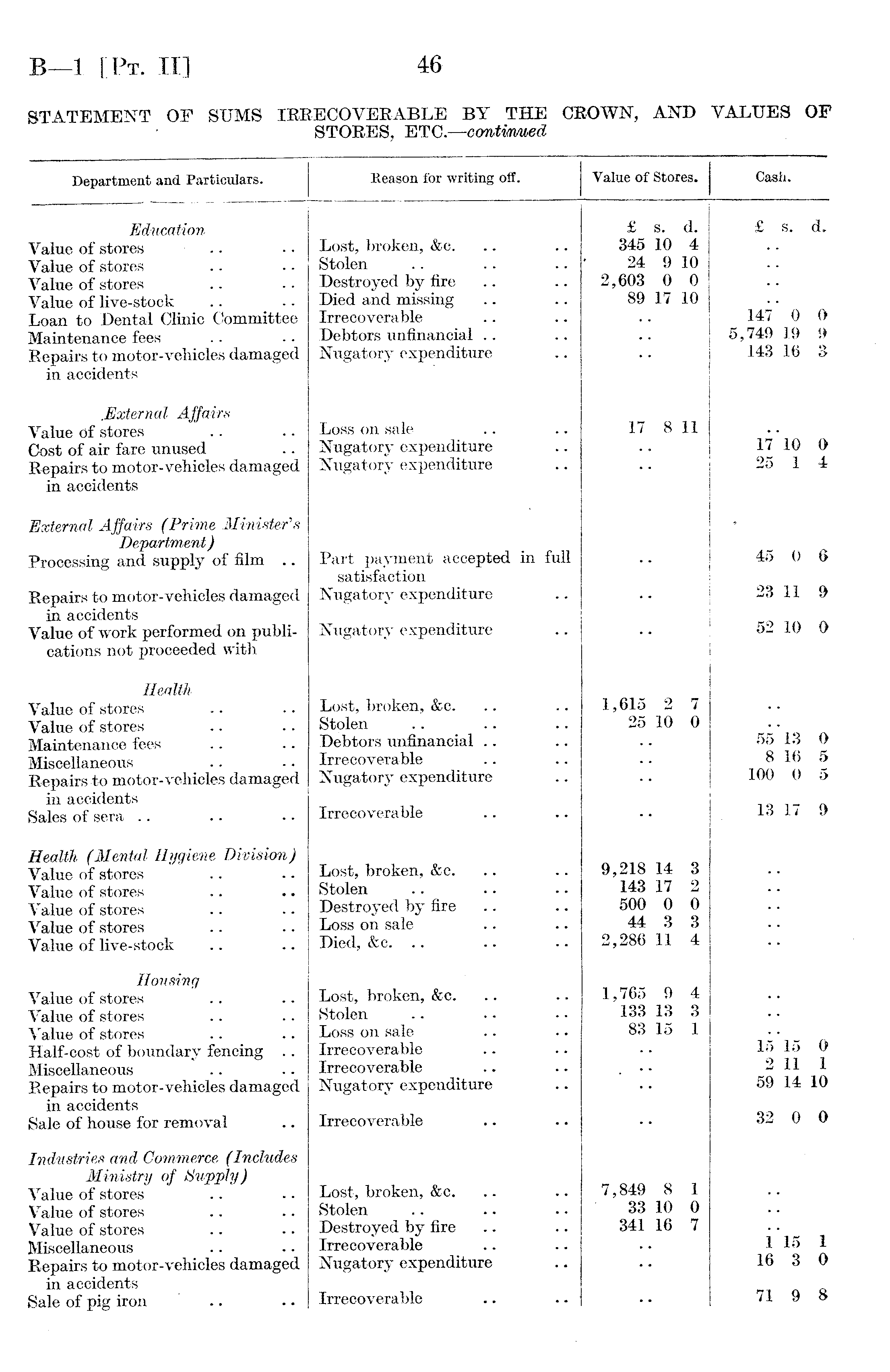 Department and Particulars. Reason for writing off. Value of Stores. Cash. Education £ s. d. £ s. d. Value of stores Lost, broken, &c. 345 10 4 Value of stores Stolen 24 9 10 Value of stores Destroyed by fire 2,603 0 0 Value of live-stock Died and missing 89 17 10 147 0 0 Loan to Dental Clinic Committee Irrecoverable Maintenance fees Debtors unfinancial 5,749 19 9 Repairs to motor-vehicles damaged Nugatory expenditure 143 16 3 in accidents .External Affairs 17 8 11 Value of stores Loss on sale Cost of air fare unused Nugatory expenditure 1710 0 Repairs to motor-vehicles damaged Nugatory expenditure 25 1 4 in accidents External Affairs (Prime Minister's . Department) Part payment accepted in full 45 0 6 Processing and supply of film .. satisfaction Repairs to motor-vehicles damaged Nugatory expenditure 23 11 9 in accidents 52 10 0 Value of work performed on publiNugatory expenditure cations not proceeded with Health Value of stores Lost, broken, &c. 1,615 2 7 Value of stores Stolen 25 10 0 Maintenance fees Debtors unfinancial 55 13 0 Miscellaneous Irrecoverable 8 16 5 Repairs to motor-vehicles damaged Nugatory expenditure 100 0 5 in accidents 13 17 9 Sales of sera .. .. Irrecoverable Health (Mental Hygiene Division) Lost, broken, &c. 9,218 14 3 Value of stores Value of stores Stolen 143 17 2 Value of stores Destroyed by fire 500 0 0 Value of stores Loss on sale 44 3 3 Value of live-stock Died, &c. 2,286 11 4 Housing 1,765 9 4 Value of stores .. Lost, broken, &e. Value of stores Stolen 133 13 3 Value of stores .. Loss on sale 83 15 1 15 15 0 Half-cost of boundary fencing .. Irrecoverable Miscellaneous .. Irrecoverable 2 11 1 Repairs to motor-vehicles damaged Nugatory expenditure 59 14 10 in accidents 32 0 0 Sale of Ijouse for removal Irrecoverable Industries and Commerce (Includes Ministry of Supply) Lost, broken, &c. 7-, 849 8 1 Value of stores Value of stores Stolen 33 10 0 Value of stores Destroyed by fire 341 16 7 i 15 1 Miscellaneous .. Irrecoverable Repairs to motor-vehicles damaged Nugatory expenditure 16 3 0 in accidents 71 9 8 Sale of pig iron Irrecoverable ..