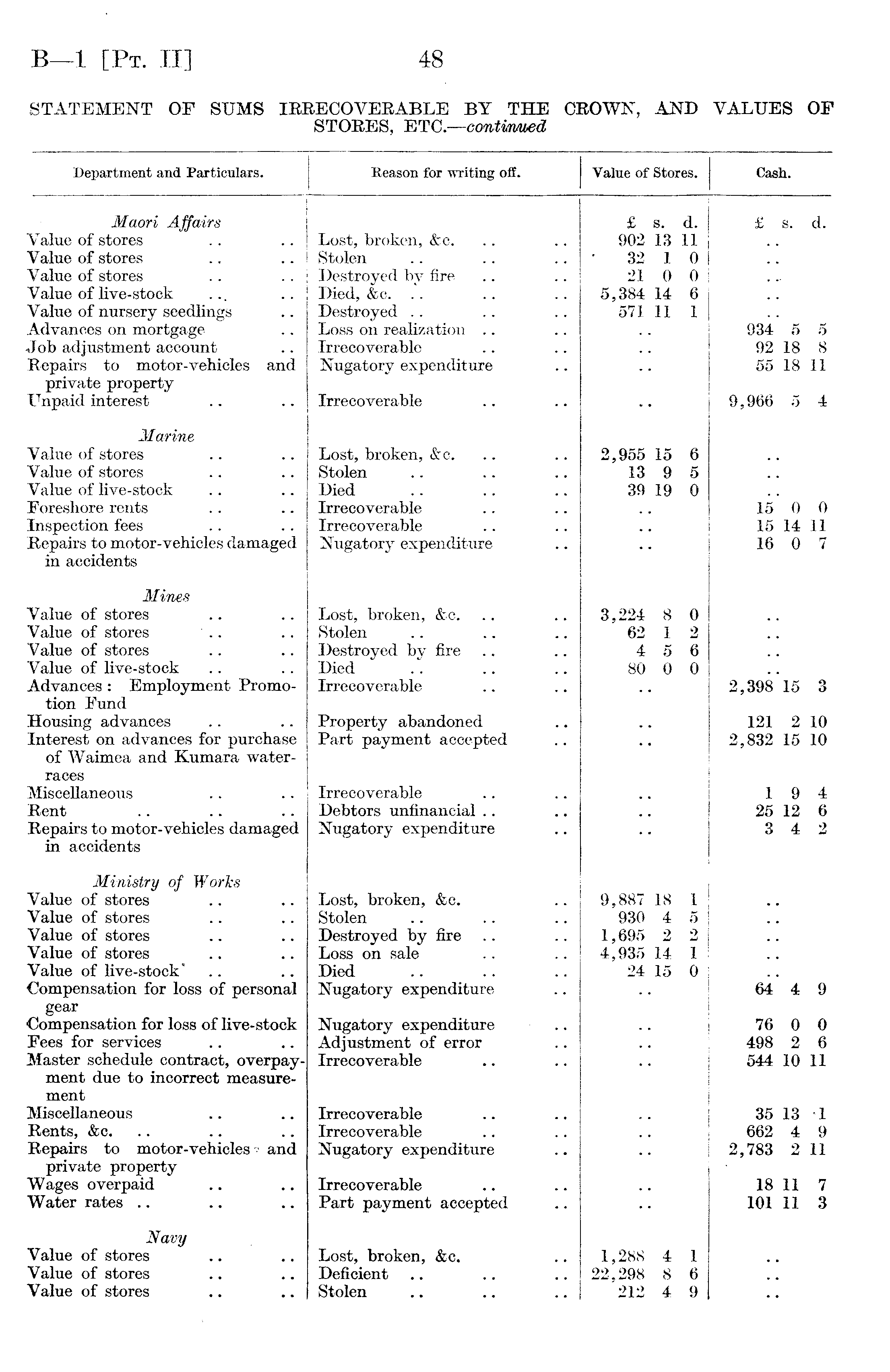 Department and Particulars. Reason for writing off. Value of Stores. Cash. Maori Affairs £ s. d. £ s. d. Value of stores Lost, broken, &c. 902 13 11 Value of stores Stolen 32 1 0 Value of stores Destroyed by fire 21 0 0 Value of live-stock Died, &c. 5,384 14 6 Value of nursery seedlings Destroyed .. .. 571 11 1 Advances on mortgage Loss on realization .. 934 5 5 Job adjustment account Irrecoverable 92 18 8 Repairs to motor-vehicles and Nugatory expenditure 55 18 11 private property Unpaid interest Irrecoverable 9,966 5 4 Marine Value of stores Lost, broken, &c. 2,955 15 6 Value of stores Stolen 13 9 5 Value of live-stock Died 39 19 0 Foreshore rents Irrecoverable 15 0 0 Inspection fees Irrecoverable 15 14 11 Repairs to motor-vehicles damaged Nugatory expenditure 16 0 7 in accidents Mines Value of stores Lost, broken, &c. 3,224 8 0 Value of stores Stolen 62 1 2 Value of stores Destroyed by fire 4 5 6 Value of live-stock Died 80 0 0 Advances : Employment PromoIrrecoverable .. 2,398 15 3 tion Fund Housing advances Property abandoned 121 2 10 Interest on advances for purchase Part payment accepted 2,832 15 10 of Waimea and Kumara waterraces Miscellaneous Irrecoverable 19 4 Rent Debtors unfinancial 25 12 6 Repairs to motor-vehicles damaged Nugatory expenditure 3 4 2 in accidents Ministry of Works Value of stores Lost, broken, &c. 9,887 18 1 Value of stores Stolen 930 4 5 Value of stores Destroyed by fire 1,695 2 2 Value of stores Loss on sale 4,935 14 1 Value of live-stock" Died 24 15 0 Compensation for loss of personal Nugatory expenditure 64 4 9 gear Compensation for loss of live-stock Nugatory expenditure 76 0 0 Fees for services Adjustment of error 498 2 6 Master schedule contract, overpayIrrecoverable 544 10 11 ment due to incorrect measurement Miscellaneous Irrecoverable 35 13 -1 Rents, <Ssc. Irrecoverable 662 4 9 Repairs to motor-vehicles* and Nugatory expenditure 2,783 2 11 private property Wages overpaid Irrecoverable 18 11 7 Water rates Part payment accepted 101 11 3 Navy Value of stores Lost, broken, &c. 1,288 4 1 . . Value of stores Deficient 22,298 8 6 Value of stores Stolen 212 4 9