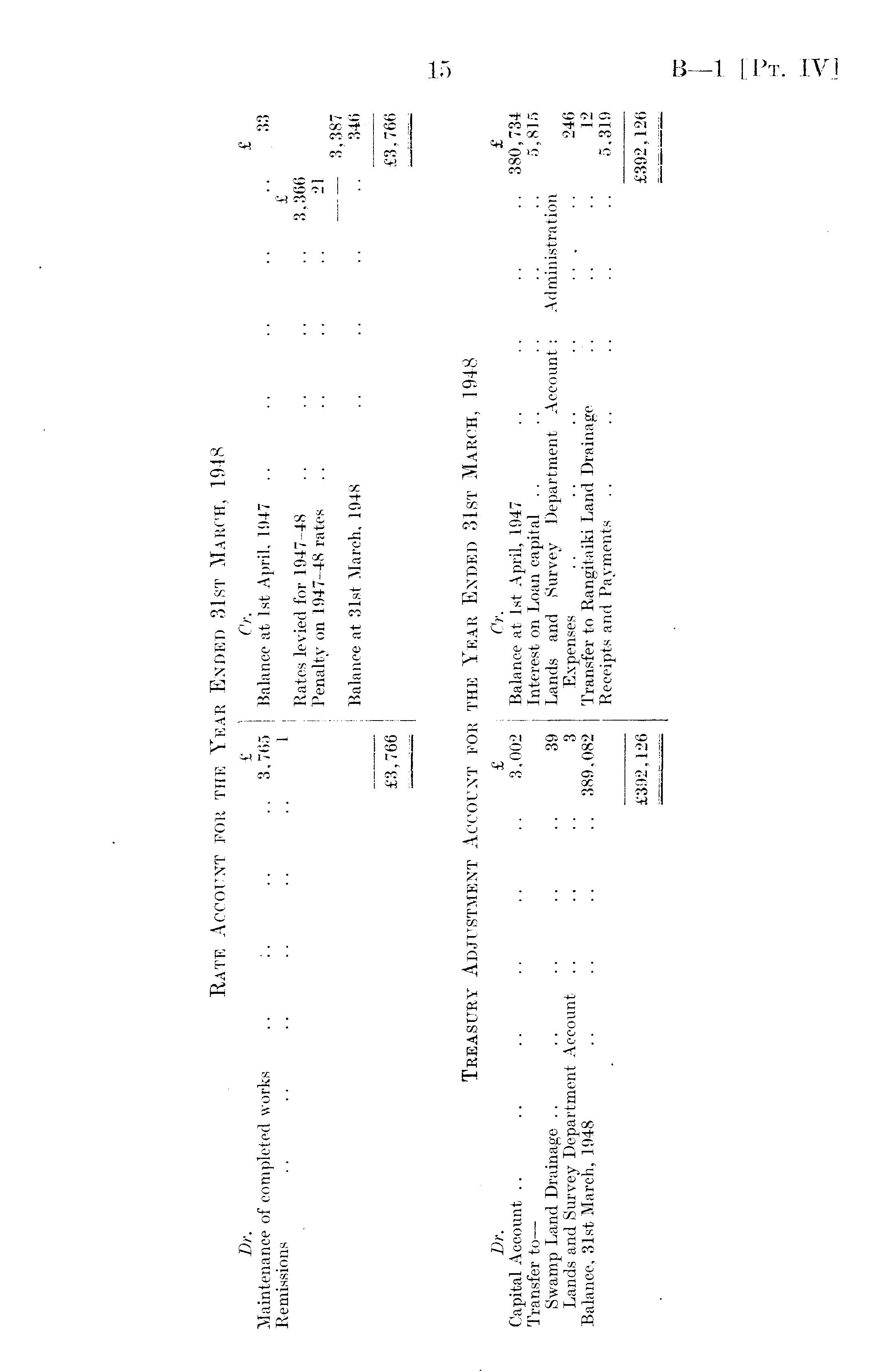 Rate Account for the Year Ended 31st March, 1948 Dr. £ I Cr. £ Maintenance of completed works .. I . . . 3,765 Balance at Ist April, 1947 . . .. .. .. .. .33 Remissions ............ 1 £ Rates levied for 1947-48 .. .. .. .. 3,366 Penalty on 1947-48 rates . . . . .. .. 21 3,387 Balance at 31st March, 1948 . . .. .. . . 346 £3,766 £3,766 Treasury Adjustment Account for the Year Ended 31st March, 1948 Dr. £ Cr. £ Capital Account .. .. .. .... .. 3,002 Balance at Ist April, 1947 .. * .. .. 380,734 Transfer to— Interest on Loan capital .. .. .. .. .. 5,815 Swamp Land Drainage .. .. .. .. .. 39 Lands and Survey Department Account : Administration Lands and Survey Department Account .. .. .. 3 Expenses .. .. .. .. ... .. 246 Balance, 31st March, 1948 .. .. .. .. 389,082 Transfer to Rangitaiki Land Drainage . . .. .. 12 Receipts and Payments .. .. .. .. .. 5,319 £392,126 £392,126