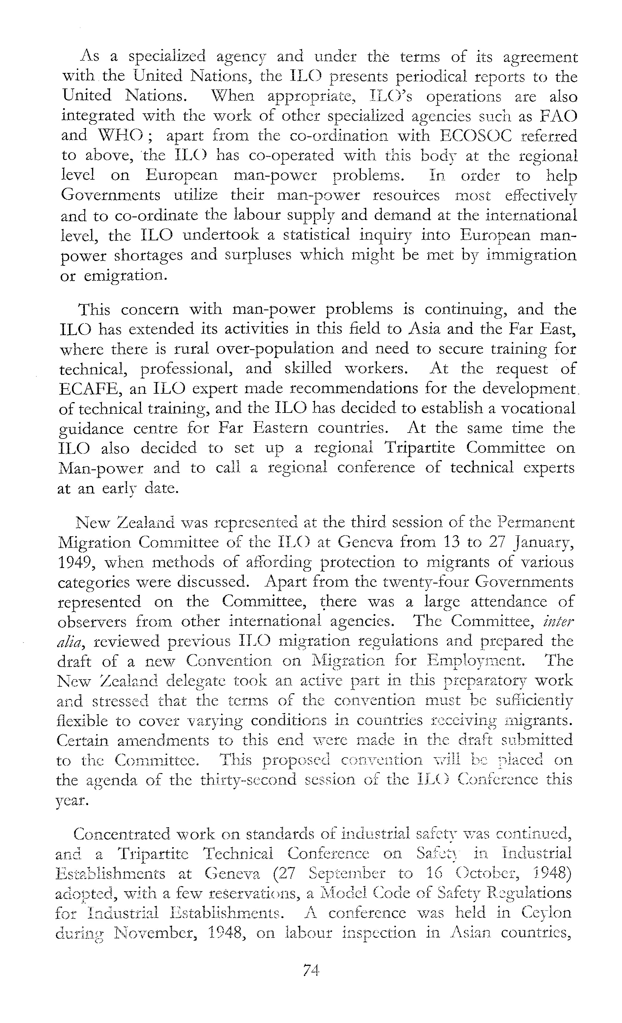As a specialized agency and under the terms of its agreement with the United Nations, the ILO presents periodical reports to the United Nations. When appropriate, ILO's operations are also integrated with the work of other specialized agencies such as FAO and WHO ; apart from the co-ordination with ECOSOC referred to above, the ILO has co-operated with this body at the regional level on European man-power problems. In order to help Governments utilize their man-power resources most effectively and to co-ordinate the labour , supply and demand at the international level, the ILO undertook a statistical inquiry into European manpower shortages and surpluses which might be met by immigration or emigration. This concern with man-power problems is continuing, and the ILO has extended its activities in this field to Asia and the Far East, where there is rural over-population and need to secure training for technical, professional, and skilled workers. At the request of ECAFE, an ILO expert made recommendations for the development, of technical training, and the ILO has decided to establish a vocational guidance centre for Far Eastern countries. At the same time the ILO also decided to set up a regional Tripartite Committee on Man-power and to call a regional conference of technical experts at an early date. New Zealand was represented at the third session of the Permanent Migration Committee of the ILO at Geneva from 13 to 27 January, 1949, when methods of affording protection to migrants of various categories were discussed. Apart from the twenty-four Governments represented on the Committee, there was a large attendance of observers from other international agencies. The Committee, inter alia, reviewed previous ILO migration regulations and prepared the draft of a new Convention on Migration for Employment. The New Zealand delegate took an active part in this preparatory work and stressed that the terms of the convention must be sufficiently flexible to cover varying conditions in countries receiving migrants. Certain amendments to this end were made in the draft submitted to the Committee. This proposed convention will be placed on the agenda of the thirty-second session of the ILO Conference this year. Concentrated work on standards of industrial safety was continued, and a Tripartite Technical Conference on Safety in Industrial Establishments at Geneva (27 September to 16 October, 1948) adopted, with a few reservations, a Model Code of Safety Regulations for Industrial Establishments. A conference was held in Ceylon during November, 1948, on labour inspection in Asian countries,