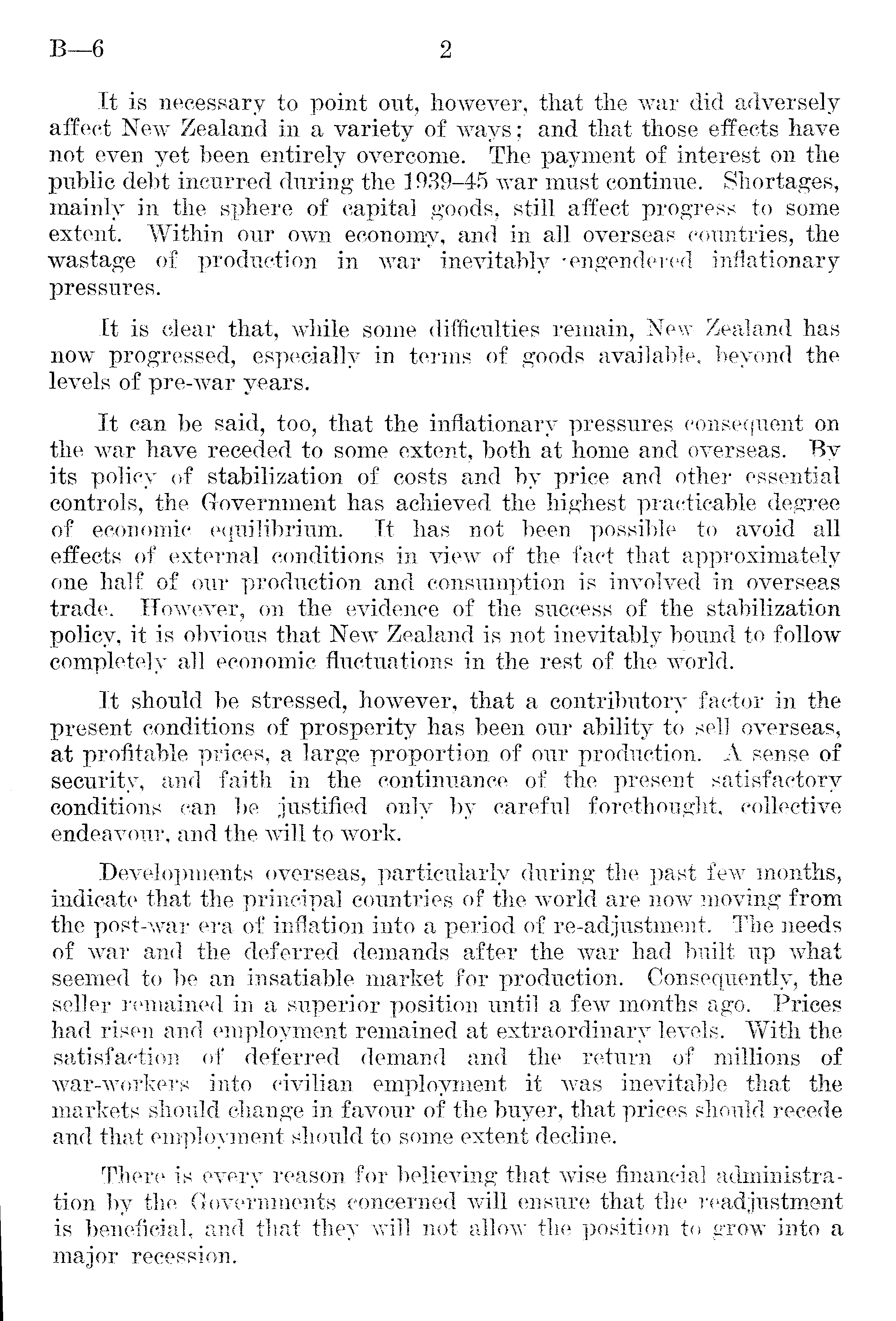 It is necessary to point out, however, that the war did adversely affect New Zealand in a variety of ways; and that those effects have not even yet been entirely overcome. The payment of interest on the public debt incurred during the 1939-45 war must continue. Shortages, mainly in the sphere of capital goods, still affect progress to some extent. Within our own economy, and in all overseas countries, the wastage of production in war inevitably -engendered inflationary pressures. It is clear that, while some difficulties remain, New Zealand has now progressed, especially in terms of goods available, beyond the levels of pre-war years. It can be said, too, that the inflationary pressures consequent on the war have receded to some extent, both at home and overseas. By its policy of stabilization of costs and by price and other essential controls, the Government has achieved the highest practicable degree of economic equilibrium. It has not been possible to avoid all effects of external conditions in view of the fact that approximately one half of our production and consumption is involved in overseas trade. However, on the evidence of the success of the stabilization policy, it is obvious that New Zealand is not inevitably bound to follow completely all economic fluctuations in the rest of the world. It should be stressed, however, that a contributory factor in the present conditions of prosperity has been our ability to sell overseas, at profitable prices, a large proportion of our production. A sense of security, and faith in the continuance of the present satisfactory conditions can be justified only by careful forethought, collective endeavour, and the will to work. Developments overseas, particularly during the past few months, indicate that the principal countries of the world are now moving from the post-war era of inflation into a period of re-adjustment. The needs of war and the deferred demands after the war had built up what seemed to be an insatiable market for production. Consequently, the seller remained in a- superior position until a few months ago. Prices had risen and employment remained at extraordinary levels. With the satisfaction of deferred demand and the return of millions of war-workers into civilian employment it was inevitable that the markets should change in favour of the buyer, that prices should recede and that employment should to some extent decline. There is every reason for believing that wise financial administration by the Governments concerned will ensure that the readjustment is beneficial, and that they will not allow the position to grow into a major recession.