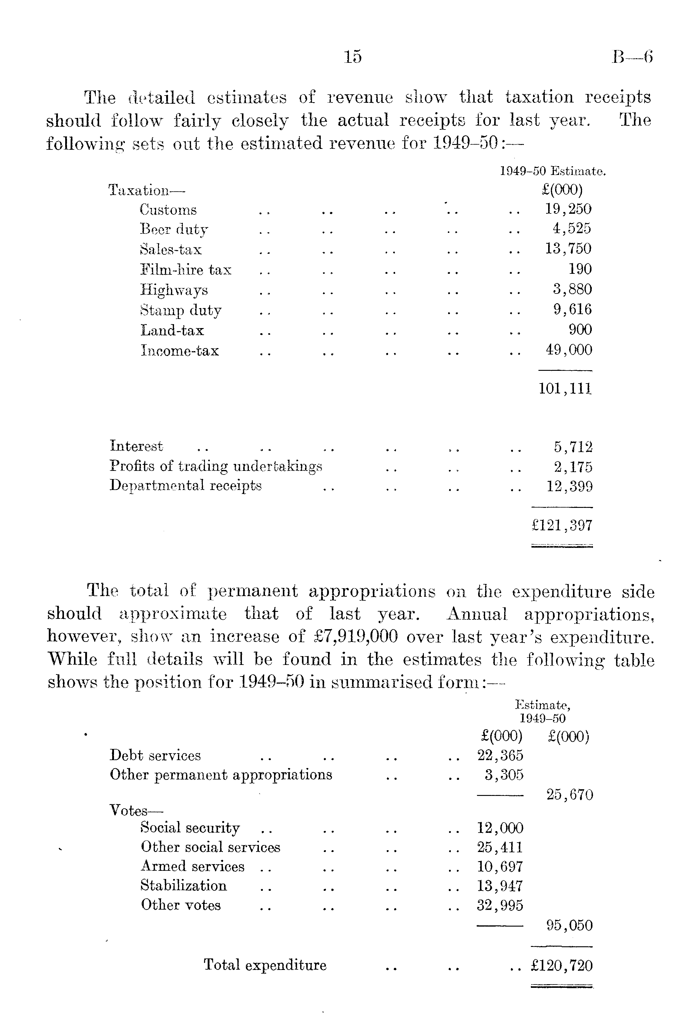 The detailed estimates of revenue show that taxation receipts should follow fairly closely the actual receipts for last year. The following sets out the estimated revenue for 1949-50: 1949-50 Estimate. Taxation— £(000) Customs .. .. .. .. .. 19,250 Beer duty .. .. .. .. .. 4,525 Sales-tax .. .. .. .. .. 13,750 Film-hire tax .. .. .. .. .. 190 Highways .. .. .. .. .. 3,880 Stamp duty .. .. .. .. .. 9,616 Land-tax .. .. .. .. .. 900 Income-tax .. .. .. .. 49,000 101,111 Interest .. .. .. .. .. .. 5,712 Profits of trading undertakings .. .. .. 2,175 Departmental receipts .. .. .. .. 12,399 £121,397 The total of permanent appropriations on the expenditure side should approximate that of last year. Annual appropriations, however, show an increase of £7,919,000 over last year's expenditure. While full details will be found in the estimates the following table shows the position for 1949-50 in summarised form: — Estimate, 1949-50 £(000) £(000) Debt services .. .. .. .. 22,365 Other permanent appropriations .. .. 3,305 25,670 Votes— Social security .. .. .. .. 12,000 Other social services .. .. .. 25 ,411 Armed services .. .. .. .. 10,697 Stabilization .. .. .. .. 13,947 Other votes .. .. .. .. 32,995 95,050 Total expenditure .. .. .. £120,720
