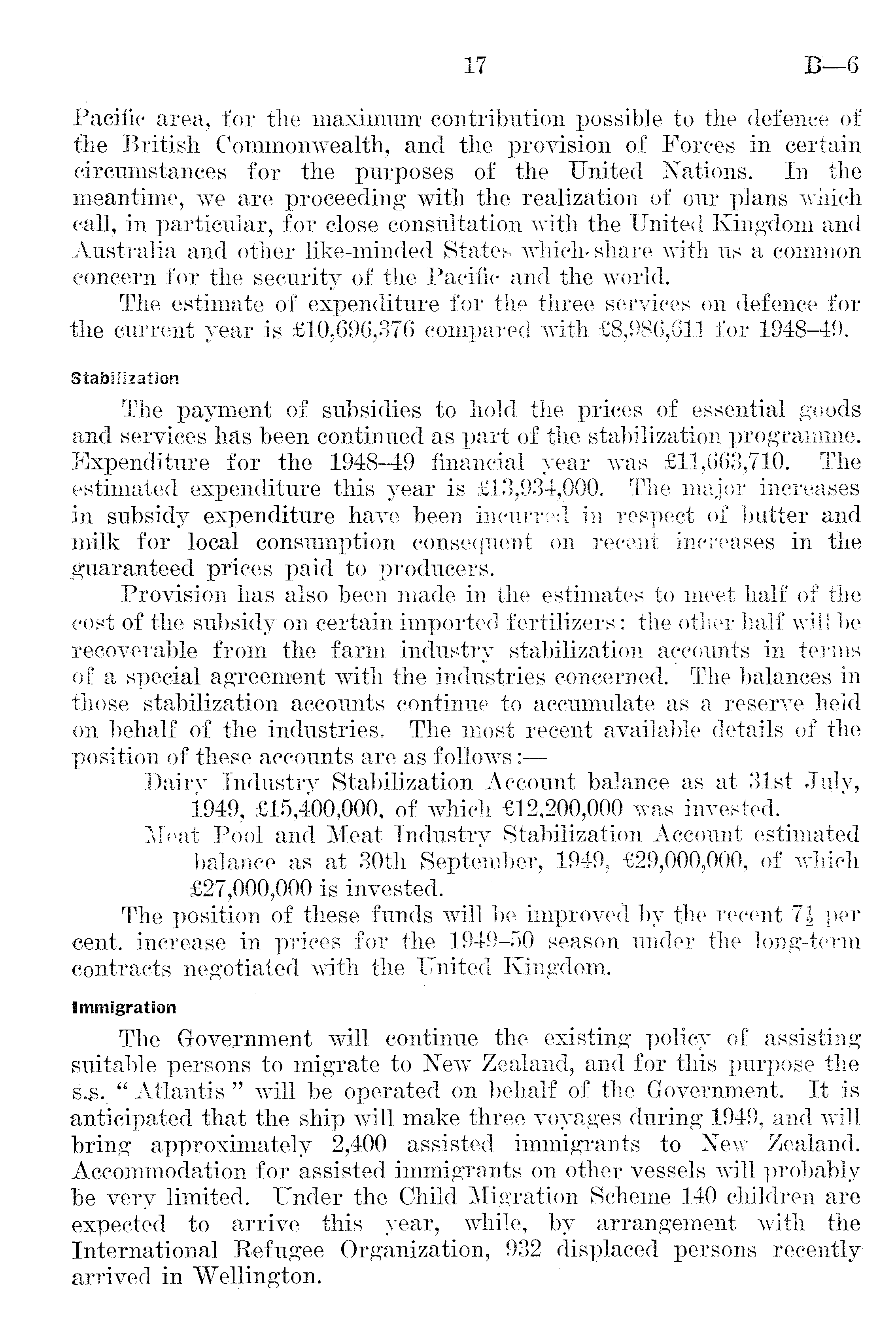 Pacific area, for the maximum' contribution possible to the defence of the British Commonwealth, and the provision of Forces in certain circumstances for the purposes of the United Nations. In the meantime, we are proceeding with the realization of our plans which call, in particular, for close consultation with the United Kingdom and Australia and other like-minded States which- share with us a common concern for the security of the Pacific and the world. The estimate of expenditure for the three services on defence for the current year is £10,696,376 compared with £8,986,611 for 1948-49. Stabilization The payment of subsidies to hold the prices of essential goods and services has been continued as part of the stabilization programme. Expenditure for the 1948-49 financial year was £11,663,710. The estimated expenditure this year is £13,934,000. The major increases in subsidy expenditure have been incurred in respect of butter and milk for local consumption consequent on recent increases in the guaranteed prices paid to producers. Provision has also been made in the estimates to meet half of the cost of the subsidy on certain imported fertilizers: the other half will be recoverable from the farm industry stabilization accounts in terms of a special agreement with the industries concerned. The balances in those stabilization accounts continue to accumulate as a reserve held on behalf of the industries. The most recent available details of the position of these accounts are as follows: — Dairv Industry Stabilization Account balance as at 31st July, 1949, £15,400,000, of which £12,200,000 was invested. Meat Pool and Meat Industry Stabilization Account estimated balance as at 30th September, 1949, £29,000,000, of which £27,000,000 is invested. The position of these funds will be improved by the recent per cent, increase in prices for the 1949-50 season under the long-term contracts negotiated with the United Kingdom. Immigration The Government will continue the existing policy of assisting suitable persons to migrate to New Zealand, and for this purpose the s.s. " Atlantis " will be operated on behalf of the Government. It is anticipated that the ship will make three voyages during 1949, and will bring approximately 2,400 assisted immigrants to New Zealand. Accommodation for assisted immigrants on other vessels will probably be very limited. Under the Child Migration Scheme 140 children are expected to arrive this year, while, by arrangement with the International Refugee Organization, 932 displaced persons recentlyarrived in Wellington.