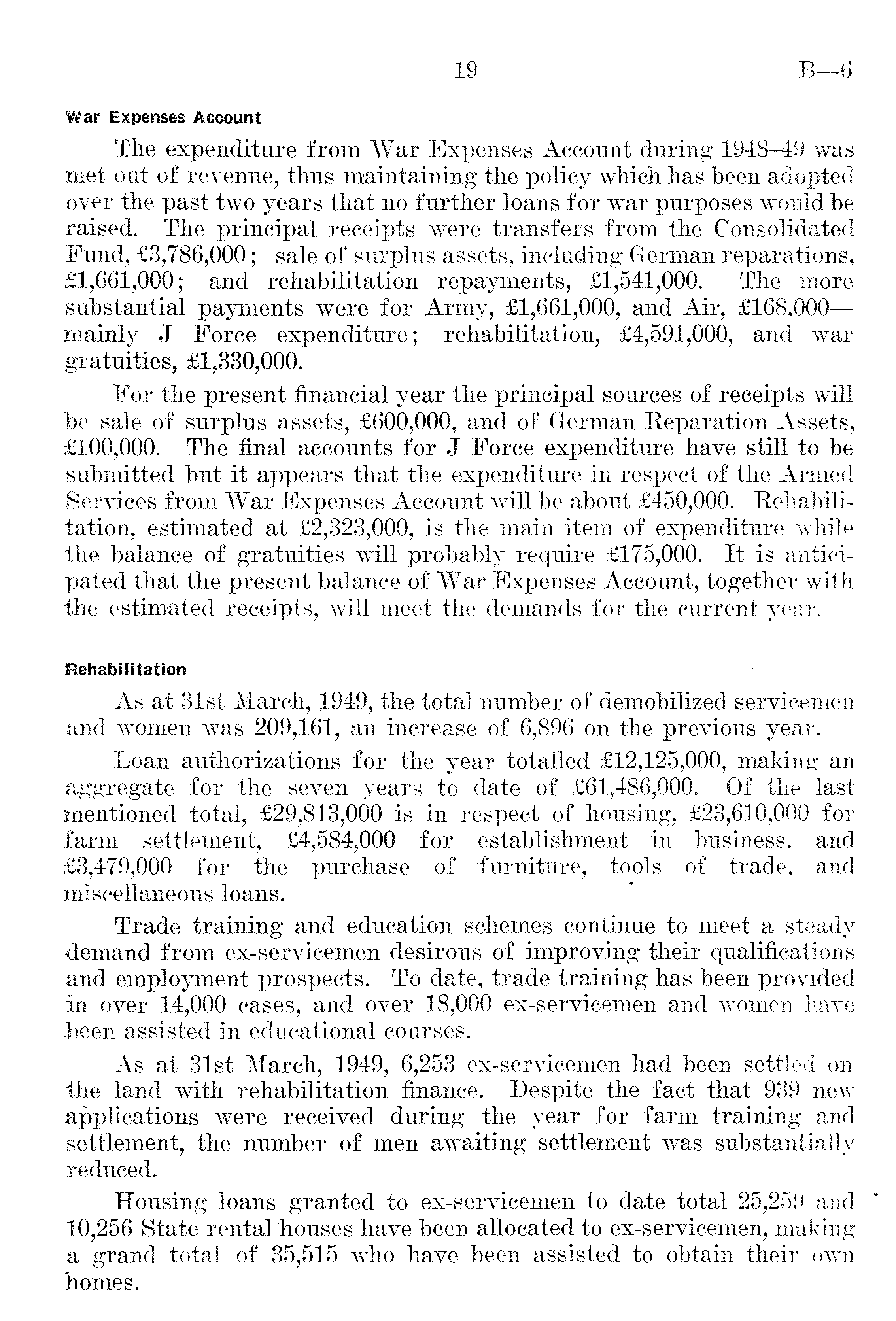 War Expenses Account The expenditure from War Expenses Account during 1948-49 was met out of revenue, thus maintaining the policy which has been adopted over the past two years that no further loans for war purposes would be raised. The principal receipts were transfers from the Consolidated Fund, £3,786,000; sale of surplus assets, including German reparations, £1,661,000; and rehabilitation repayments, £1,541,000. The more substantial payments were for Army, £1,661,000, and Air, £168,000 — mainly J Force expenditure; rehabilitation, £4,591,000, and war gratuities, £1,330,000. For the present financial year the principal sources of receipts will be sale of surplus assets, £600,000, and of German Reparation Assets, £lOO,OOO. The final accounts for J Force expenditure have still to be submitted but it appears that the expenditure in respect of the Armed Services from War Expenses Account will be about £450,000. Rehabilitation, estimated at £2,323,000, is the main item of expenditure while the balance of gratuities will probably require £175,000. It is anticipated that the present balance of War Expenses Account, together with the estimated receipts, will meet the demands for the current year. Rehabilitation As at 31st March, 1949, the total number of demobilized servicemen and women was 209,161, an increase of 6,896 on the previous year. Loan authorizations for the year totalled £12,125,000, making an aggregate for the seven years to date of £61,486,000. Of the last mentioned total, £29,813,000 is in respect of housing, £23,610,000 for farm settlement, £4,584,000 for establishment in business, and £3,479,000 for the purchase of v furniture, tools of trade, and miscellaneous loans. Trade training and education schemes continue to meet a steady demand from ex-servicemen desirous of improving their qualifications and employment prospects. To date, trade training has been provided in over 14,000 cases, and over 18,000 ex-servicemen and women have •been assisted in educational courses. As at 31st March, 1949, 6,253 ex-servicemen had been settled on the land with rehabilitation finance. Despite the fact that 939 new applications were received during the year for farm training and settlement, the number of men awaiting settlement was substantially reduced. Housing loans granted to ex-servicemen to date total 25,259 and 10,256 State rental houses have been allocated to ex-servicemen, making a grand total of 35,515 who have been assisted to obtain their own homes.