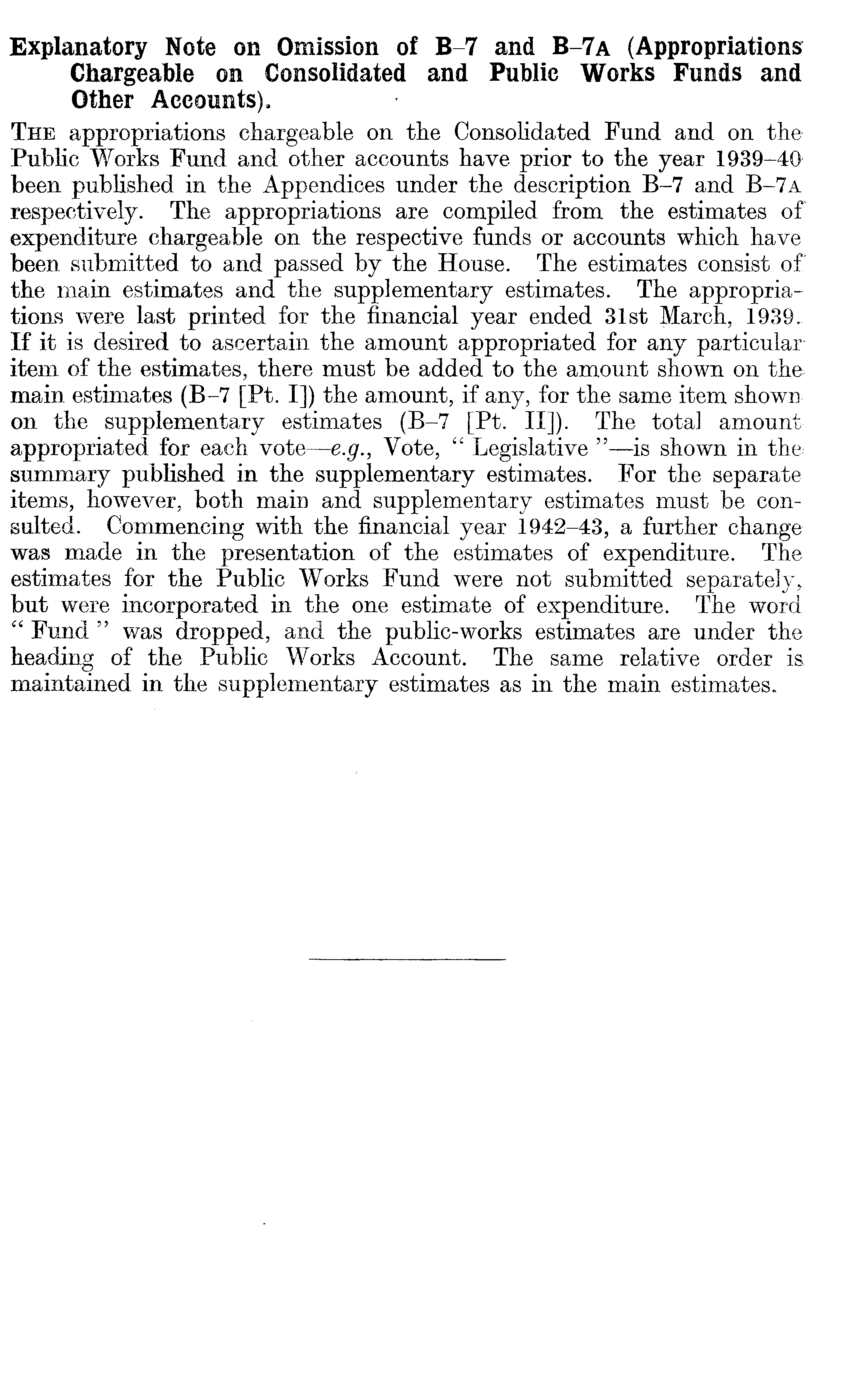 The appropriations chargeable on the Consolidated Fund and on the Public Works Fund and other accounts have prior to the year 1939-40 been published in the Appendices under the description B-7 and B-7a respectively. The appropriations are compiled from the estimates of expenditure chargeable on the respective funds or accounts which have been submitted to and passed by the House. The estimates consist of the main estimates and the supplementary estimates. The appropriations were last printed for the financial year ended 31st March, 1939. If it is desired to ascertain the amount appropriated for any particular item of the estimates, there must be added to the amount shown on the main estimates (B-7 [Pt. I]) the amount, if any, for the same item shown on the supplementary estimates (B-7 [Pt. II]). The total amount appropriated for each vote —e.g., Vote, " Legislative " —is shown in the summary published in the supplementary estimates. For the separate items, however, both main and supplementary estimates must be consulted. Commencing with the financial year 1942-43, a further change was made in the presentation of the estimates of expenditure. The estimates for the Public Works Fund were not submitted separately, but were incorporated in the one estimate of expenditure. The word " Fund " was dropped, and the public-works estimates are under the heading of the Public Works Account. The same relative order is maintained in the supplementary estimates as in the main estimates.