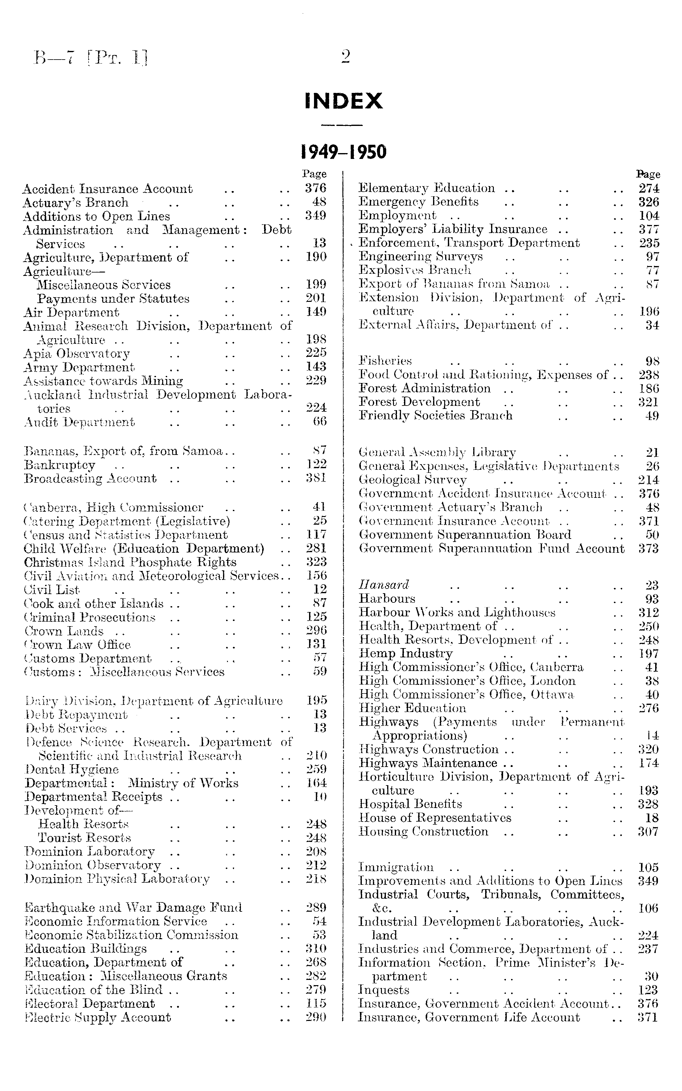 Page Accident Insurance Account .. .. 376 Actuary's Branch .. .. 48 Additions to Open Lines .. .. 349 Administration and Management: Debt Services .. .. .. .. 13 Agriculture, Department of .. .. 190 Agriculture— Miscellaneous Services .. .. 199 Payments under Statutes .. .. 201 Air Department .. .. .. 149 Animal Research Division, Department of Agriculture .. .. .. .. 198 Apia Observatory .. .. .. 225 Army Department .. .. .. 143 Assistance towards Mining .. .. 229 Auckland Industrial Development Laboratories .. .. .. .. 224 Audit Department .. .. .. 66 Bananas, Export of, from Samoa.. .. 87 Bankruptcy .. .. .. .. 122 Broadcasting Account .. .. .. 381 Canberra, High Commissioner .. .. 41 Catering Department (Legislative) .. 25 Census and Statistics Department .. 117 Child Welfare (Education Department) .. 281 Christmas Island Phosphate Rights .. 323 Civil Aviation and Meteorological Services .. 156 Civil List .. .. .. 12 Cook and other Islands .. .. 87 Criminal Prosecutions .. .. .. 125 Crown Lands .. .. .. .. 296 Crown Law Office .. .. . . 131 Customs Department ... .. .. 57 Customs: Miscellaneous Services .. 59 Dairy Division, Department of Agriculture 195 Debt Repayment .. .. 13 Debt Services .. .. .. 13 Defence Science Research, Department of Scientific and Industrial Research .. 210 Dental Hygiene .. .. .. 259 Departmental: Ministry of Works .. 164 Departmental Receipts .. .. .. 10 Development of— Health Resorts .. .. .. 248 Tourist Resorts .. .. .. 248 Dominion Laboratory .. .. .. 208 Dominion Observatory .. .. .. 212 Dominion Physical Laboratory .. .. 218 Earthquake and War Damage Fund .. 289 Economic Information Service .. .. 54 Economic Stabilization Commission .. 53 Education Buildings .. .. .. 310 Education, Department of .. .. 268 Education : Miscellaneous Grants .. 282 Education of the Blind .. .. .. 279 Electoral Department .. .. 115 Electric Supply Account .. .. 290