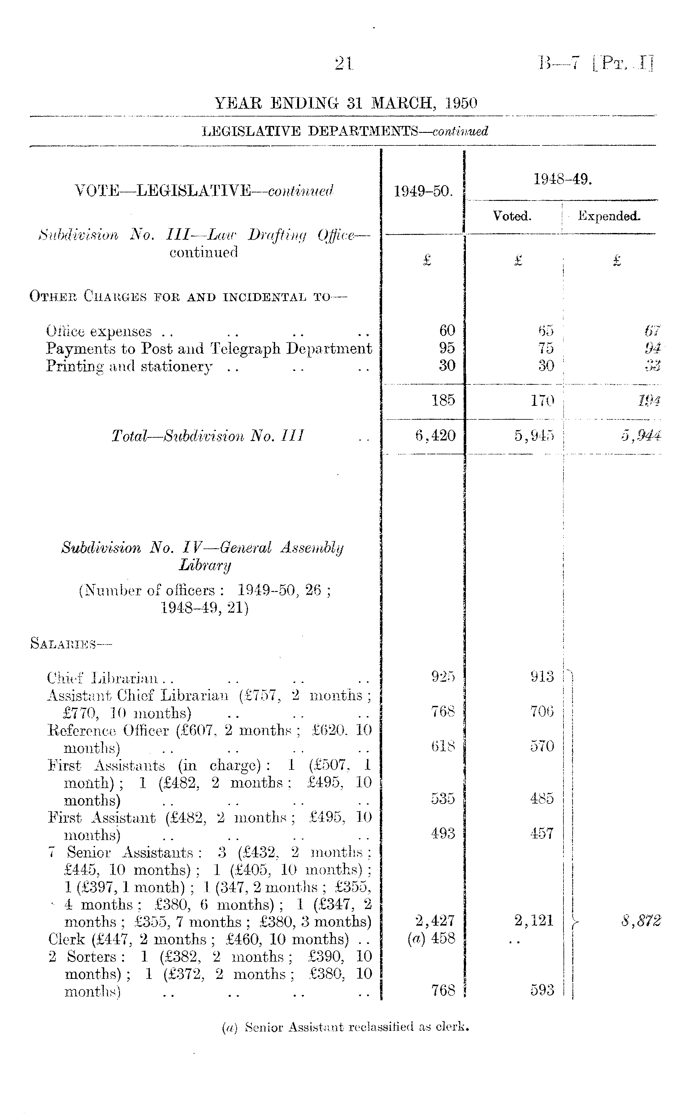 VOTE —LEGISLATIVE —continued 1949-50. 1948-49. Subdivision No. Ill—Law Drafting Office — continued Voted. Expended. £ £ £ Other Charges for and incidental to — Office expenses Payments to Post and Telegraph Department Printing and stationery 60 95 30 65 75 30 67 94 33 185 170 194 Total —Siibdivision No. III 6,420 5,945 5,944 Subdivision No. IV —General Assembly Library (Number of officers : 1949-50, 26 ; 1948-49, 21) Salaries — Chief Librarian Assistant Chief Librarian (£757, 2 months ; £770, 10 months) Reference Officer (£607, 2 months ; £620, 10 months) First Assistants (in charge): 1 (£507, 1 month); 1 (£482, 2 months; £495, 10 months) First Assistant (£482, 2 months ; £495, 10 months) 7 Senior Assistants: 3 (£432, 2 months; £445, 10 months); 1 (£405, 10 months); 1 (£397,1 month); 1 (347, 2 months ; £355, 4 months ; £380, 6 months); 1 (£347, 2 months ; £355, 7 months ; £380, 3 months) Clerk (£447, 2 months ; £460, 10 months) .. 2 Sorters: 1 (£382, 2 months; £390, 10 months); 1 (£372, 2 months; £380, 10 months) 925 768 618 535 493 2,427 (a) 458 768 913 706 570 485 457 2,121 593 8,872 (a) Senior Assistant reclassified as clerk