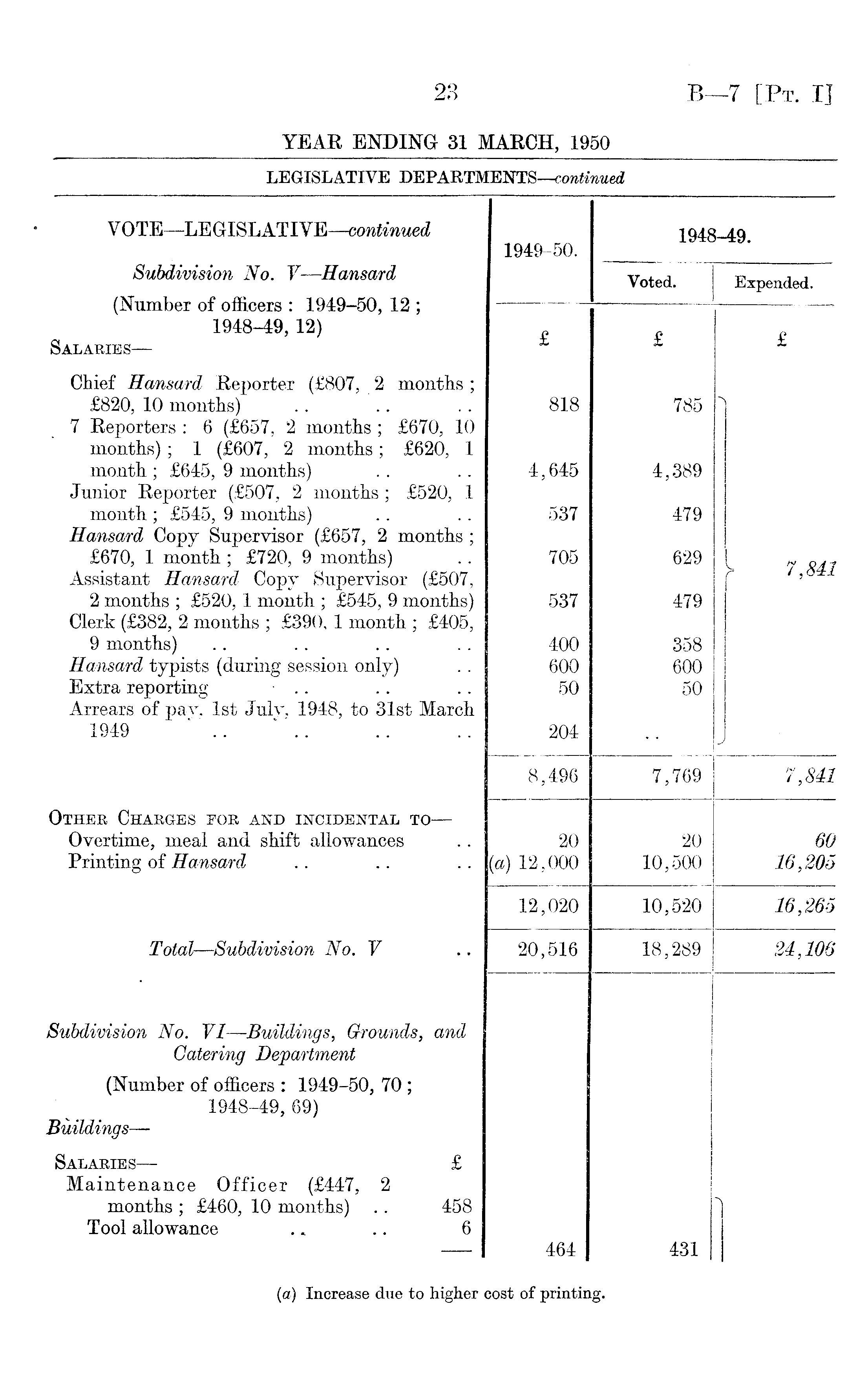 VOTE —LEGISLATIVE—continued 1949-50. 1948-49. Subdivision No. V —Hansard (Number of officers : 1949-50, 12 ; 1948-49, 12) Salaries — Voted. Expended. £ £ £ £ Chief Hansard Reporter (£807, 2 months ; £820, 10 months) 7 Reporters : 6 (£657, 2 months; £670, 10 months); 1 (£607, 2 months; £620, 1 month ; £645, 9 months) Junior Reporter (£507, 2 months; £520, 1 month ; £545, 9 months) Hansard Copy Supervisor (£657, 2 months ; £670, 1 month; £720, 9 months) Assistant Hansard Copy Supervisor (£507, 2 months ; £520,1 month ; £545, 9 months) Clerk (£382, 2 months ; £390, 1 month ; £405, 9 months) Hansard typists (during session only) Extra reporting Arrears of pay, 1st July, 1948, to 31st March 1949 .. 818 4,645 537 705 537 400 600 50 204 785 4,389 479 629 479 358 600 50 7,841 8,496 7,769 7,841 Other Charges for and incidental to — Overtime, meal and shift allowances Printing of Hansard 20 (a) 12,000 20 10,500 60 16,205 12,020 10,520 16,265 Total —Subdivision No. V 20,516 18,289 24,106 Subdivision No. VI —Buildings, Grounds, and Catering Department (Number of officers : 1949-50, 70 ; 1948-49, 69) Buildings— Salaries— £ Maintenance Officer (£447, 2 months ; £460, 10 months) .. 458 Tool allowance .. .. 6 464 431 (a) Increase due to higher cost of printing.