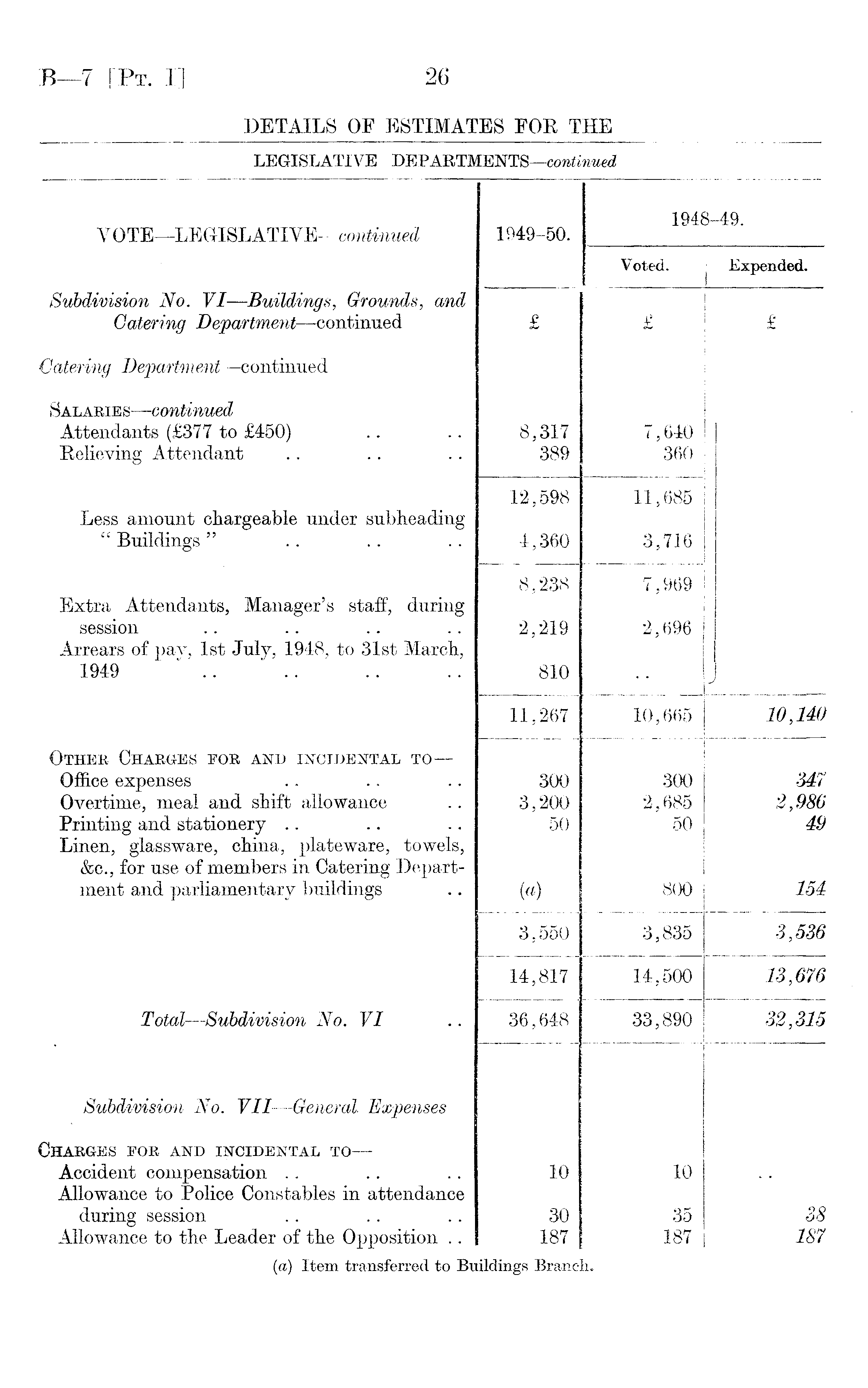 VOTE —LEGISLATIVE —continued 1949-50. 1948-49. Voted. Expended. Subdivision No. VI—Buildings, Grounds, and Catering Department—continued £ £ £ Catering Department —continued Salaries —continued Attendants (£377 to £450) Relieving Attendant 8,317 389 7,640 360 Less amount chargeable under subheading "Buildings" 12,598 4,360 11,685 3,716 Extra Attendants, Manager's staff, during session Arrears of pay, 1st July, 1948, to 31st March, 1949 8,238 2,219 810 7,969 2,696 11,267 10,665 10,140 Other Charges for and incidental to— Office expenses Overtime, meal and shift allowance Printing and stationery Linen, glassware, china, plateware, towels, &c., for use of members in Catering Department and parliamentary buildings 300 3,200 50 (a) 300 2,685 50 800 347 2,986 49 154 3,550 3,835 3,536 14,817 14,500 13,676 Total —Subdivision No. VI 36,648 33,890 32,315 Subdivision No. VII—General Expenses Charges for and incidental to — Accident compensation Allowance to Police Constables in attendance during session Allowance to the Leader of the Opposition .. 10 30 187 10 35 187 38 187 (a) Item transferred to Buildings Branch.
