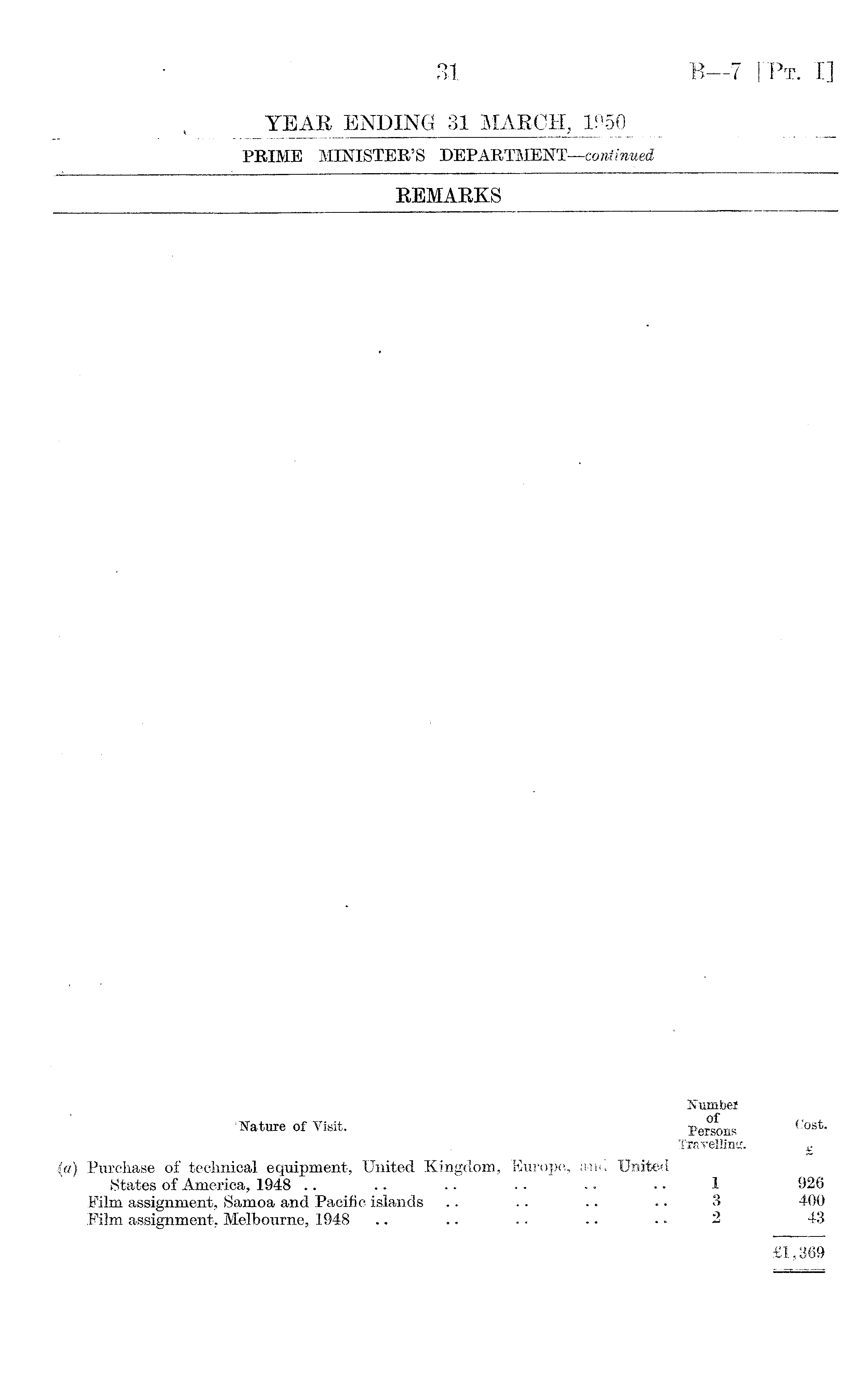 Number Nature of Visit. Persons Cost. Travelling. £ (a) Purchase of technical equipment, United Kingdom, Europe, and United States of America, 1948 .. .. .. .. .. .. 1 926 Film assignment, Samoa and Pacific islands .. .. .. .. 3 400 Film assignment, Melbourne, 1948 .. .. .. .. • • 2 43 £1,369