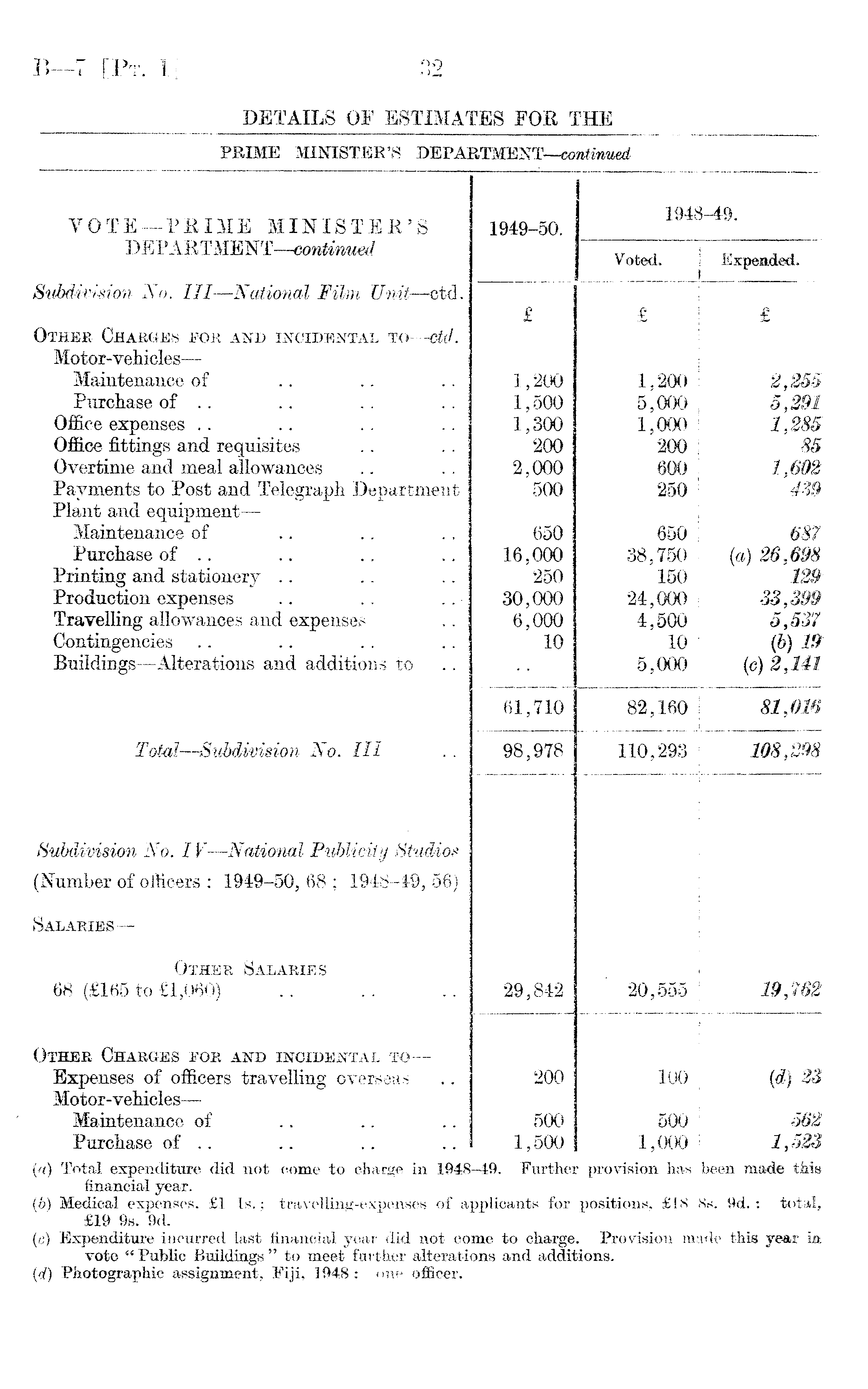 VOTE —PRIME MINISTER'S 1949-50. 1948-49. DEPARTMENT—continued Voted. Expended. Subdivision No. Ill —National Film Unit —ctd. £ £ £ Other Charges for and incidental to —ctd. Motor-vehicles — Maintenance of 1,200 1,200 2,255 Purchase of .. 1,500 5,000 5,291 Office expenses 1,300 1,000 1,285 Office fittings and requisites 200 200 85 Overtime and meal allowances 2,000 600 1,602 439 Payments to Post and Telegraph Department 500 250 Plant and equipment— Maintenance of 650 650 687 Purchase of .. 16,000 38,750 (a) 26.698 Printing and stationery 250 150 129 Production expenses 30,000 24,000 33,399 Travelling allowances and expenses 6,000 4,500 5,537 Contingencies 10 10 (b)19 Buildings —Alterations and additions to 5,000 (c) 2,141 61,710 82,160 81,016 Total —Subdivision No. Ill 98,978 110,293 108,298 Subdivision No. IV —National Publicity Studios (Number of officers : 1949-50, 68 ; 1948-49, 56) Salaries— Other Salaries 68 (£165 to £1,060) 29,842 20,555 19,762 Other Charges for and incidental toExpenses of officers travelling overseas 200 100 (d) 23 Motor-vehicles— Maintenance of 500 500 562 Purchase of .. 1,500 1,000 1,523