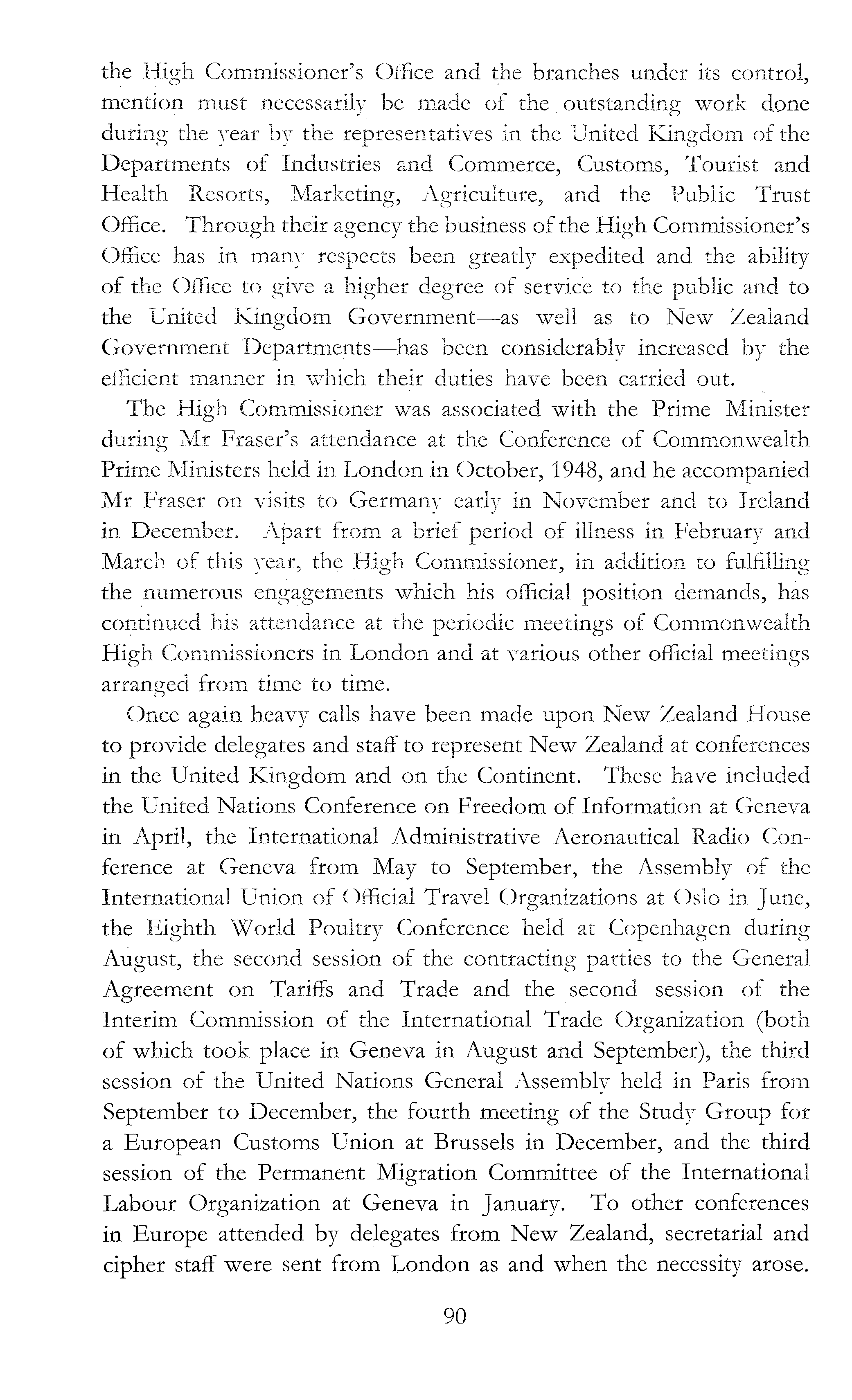 the High Commissioner's Office and the branches under its control, mention rnust • necessarily be made of the outstanding work done during the year by the representatives in the United Kingdom of the Departments of Industries and Commerce, Customs, Tourist and Health Resorts, Marketing, Agriculture, and the Public Trust Office. Through their agency the business of the High Commissioner's Office has in many respects been greatly expedited and the ability of the Office to give a higher-degree of service to the public and to the United Kingdom Government—as well as to New Zealand Government Departments—has been considerably increased by the efficient manner in which their duties have been carried out. The High, Commissioner was associated with the Prime Minister during Mr Fraser's attendance at the Conference of Commonwealth Prime Ministers held in London in October, 1948, and he accompanied Mr Fraser on visits to Germany early in November and to Ireland in December. Apart from a brief period of illness in February and March of this year, the High Commissioner, in addition to fulfilling the numerous engagements which his official position demands, has continued his attendance at the periodic meetings of Commonwealth High Commissioners, in London and at various other official meetings arranged from time to time. Once again heavy calls have been made upon New Zealand House to provide delegates and staff to represent .New Zealand at conferences in the United Kingdom and on the Continent. These have included the United Nations Conference on Freedom of Information at Geneva in April, the International Administrative Aeronautical Radio Conference at Geneva from May to September, the Assembly of the International Union of Official Travel Organizations at Oslo in June, the Eighth World Poultry Conference held at Copenhagen during August, the second session of the contracting parties to the General Agreement on Tariffs and Trade and the second session of the Interim Commission of the International Trade Organization (both of which took place in Geneva in August and September), the third session of the United Nations General Assembly held in Paris from September to December, the fourth meeting of the Study Group for a European Customs Union at Brussels in December, and the third session of the Permanent Migration Committee of the International Labour Organization at Geneva in January. To other conferences in Europe attended by delegates from New Zealand, secretarial and cipher staff were sent from London as and when the necessity arose.