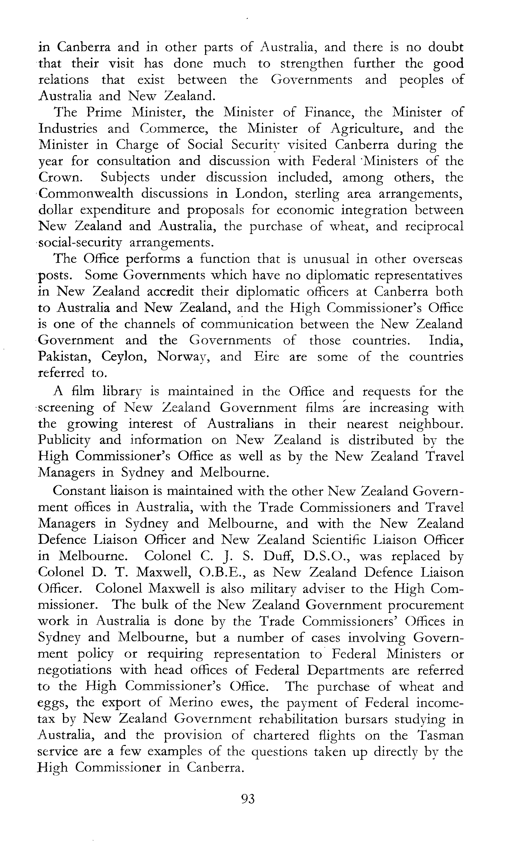 in Canberra and in other parts of Australia, and there is no doubt that their visit has done much to strengthen further the good relations that exist between the Governments and peoples of Australia and New Zealand. The Prime Minister, the Minister of Finance, the Minister of Industries and Commerce, the Minister of Agriculture, and the Minister in Charge of Social Security visited Canberra during the year for consultation and discussion with Federal Ministers of the Crown. Subjects under discussion included, among others, the Commonwealth discussions in London, sterling area arrangements, dollar expenditure and proposals for economic integration between New Zealand and Australia, the purchase of wheat, and reciprocal •social-security arrangements. The Office performs a function that is unusual in other overseas posts. Some Governments which have no diplomatic representatives in New Zealand accredit their diplomatic officers at Canberra both to Australia and New Zealand, and the High Commissioner's Office is one of the channels of communication between the New Zealand Government and the Governments of those countries. India, Pakistan, Ceylon, Norway, and Eire are some of the countries referred to. A film library is maintained in the Office and requests for the screening of New Zealand Government films are increasing with the growing interest of Australians in their nearest neighbour! Publicity and information on New Zealand is distributed by the High Commissioner's Office as well as by the New Zealand Travel Managers in Sydney and Melbourne. Constant liaison is maintained with the other New Zealand Government offices in Australia, with the Trade Commissioners and Travel Managers in Sydney and Melbourne, and with the New Zealand Defence Liaison Officer and New Zealand Scientific Liaison Officer in Melbourne. Colonel C. J. S. Duff, D.5.0., was replaced by Colonel D. T. Maxwell, 0.8. E., as New Zealand Defence Liaison Officer. Colonel Maxwell is also military adviser to the High Commissioner. The bulk of the New Zealand Government procurement work in Australia is done by the Trade Commissioners' Offices in Sydney and Melbourne, but a number of cases involving Government policy or requiring representation to Federal Ministers or negotiations with head offices of Federal Departments are referred to the High Commissioner's Office. The purchase of wheat and eggs, the export of Merino ewes, the payment of Federal incometax by New Zealand Government rehabilitation bursars studying in Australia, and the provision of chartered flights on the Tasman service are a few examples of the questions taken up directly by the High Commissioner in Canberra.