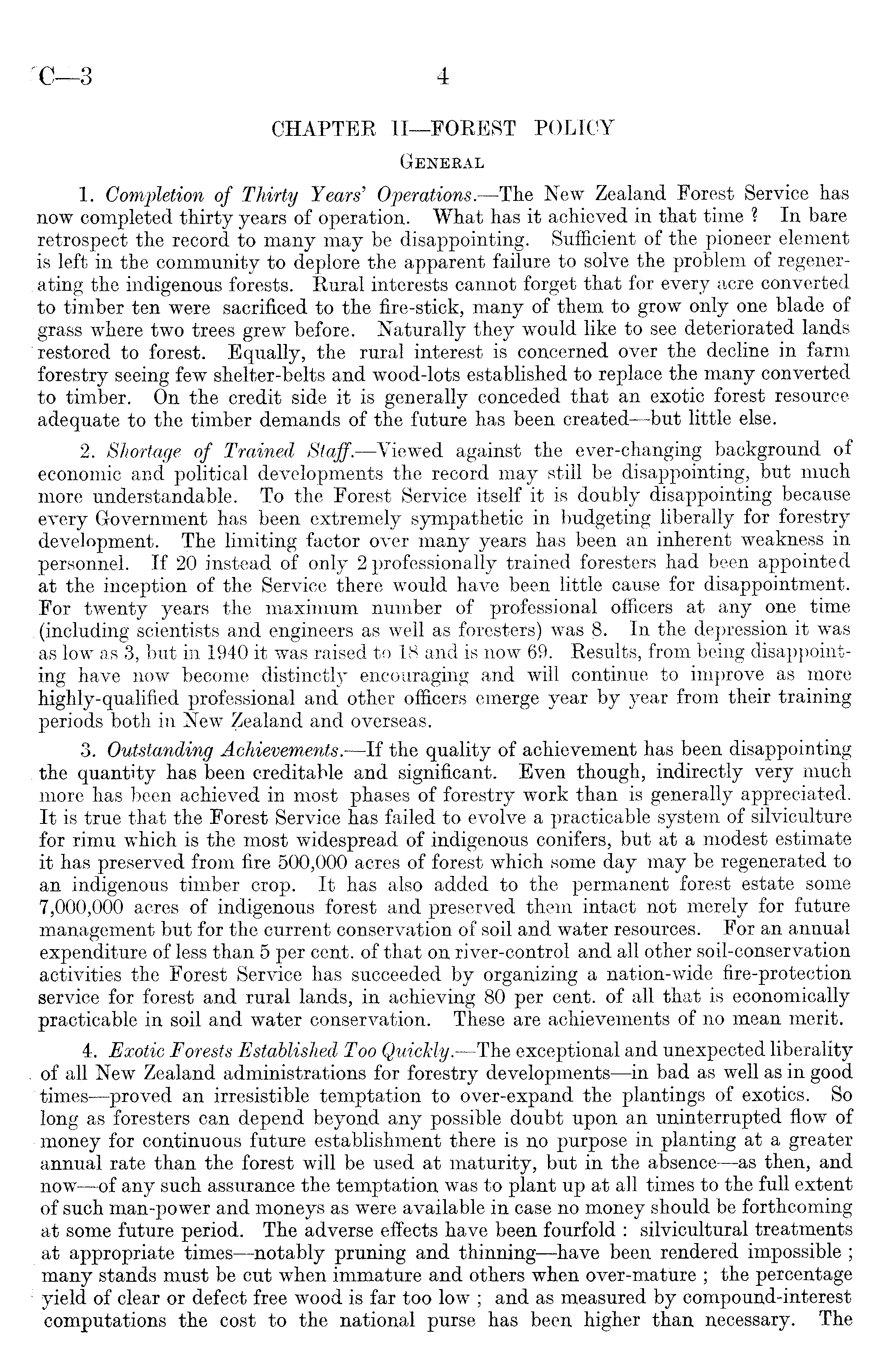 CHAPTER lI—FOREST POLICY General 1. Completion of Thirty Years' Operations.—The New Zealand Forest Service lias now completed thirty years of operation. What has it achieved in that time ? In bare retrospect the record to many may be disappointing. Sufficient of the pioneer element is left in the community to deplore the apparent failure to solve the problem of regenerating the indigenous forests. Rural interests cannot forget that for every acre converted to timber ten were sacrificed to the fire-stick, many of them to grow only one blade of grass where two trees grew before. Naturally they would like to see deteriorated lands restored to forest. Equally, the rural interest is concerned over the decline in farm forestry seeing few shelter-belts and wood-lots established to replace the many converted to timber. On the credit side it is generally conceded that an exotic forest resource adequate to the timber demands of the future has been created —but little else. 2. Shortage of Trained Staff. —Viewed against the ever-changing background of economic and political developments the record may still be disappointing, but much more understandable. To the Forest Service itself it is doubly disappointing because every Government has been extremely sympathetic in budgeting liberally for forestry development. The limiting factor over many years has been an inherent weakness in personnel. If 20 instead of only 2 professionally trained foresters had been appointed at the inception of the Service there would have been little cause for disappointment. For twenty years the maximum number of professional officers at any one time . (including scientists and engineers as well as foresters) was 8. In the depression it was as low as 3, but in 1940 it was raised to 18 and is now 69. Results, from being disappointing have now become distinctly encouraging and will continue to improve as more highly-qualified professional and other officers emerge year by year from their training periods both in New Zealand and overseas. 3. Outstanding Achievements. —If the quality of achievement has been disappointing the quantity has been creditable and significant. Even though, indirectly very much more has been achieved in most phases of forestry work than is generally appreciated. It is true that the Forest Service has failed to evolve a practicable system of silviculture for rimu which is the most widespread of indigenous conifers, but at a modest estimate it has preserved from fire 500,000 acres of forest which some day may be regenerated to an indigenous timber crop. It has also added to the permanent forest estate some 7,000,000 acres of indigenous forest and preserved them intact not merely for future management but for the current conservation of soil and water resources. For an annual expenditure of less than 5 per cent, of that on river-control and all other soil-conservation activities the Forest Service has succeeded by organizing a nation-wide fire-protection service for forest and rural lands, in achieving 80 per cent, of all that is economically practicable in soil and water conservation. These are achievements of no mean merit. 4. Exotic Forests Established Too Quickly.—The exceptional and unexpected liberality of all New Zealand administrations for forestry developments —in bad as well as in good times —proved an irresistible temptation to over-expand the plantings of exotics. So long as foresters can depend beyond any possible doubt upon an uninterrupted flow of money for continuous future establishment there is no purpose in planting at a greater annual rate than the forest will be used at maturity, but in the absence —as then, and now —of any such assurance the temptation was to plant up at all times to the full extent of such man-power and moneys as were available in case no money should be forthcoming at some future period. The adverse effects have been fourfold : silvicultural treatments at appropriate times —notably pruning and thinning—have been rendered impossible ; many stands must be cut when immature and others when over-mature ; the percentage : yield of clear or defect free wood is far too low ; and as measured by compound-interest computations the cost to the national purse has been higher than necessary. The