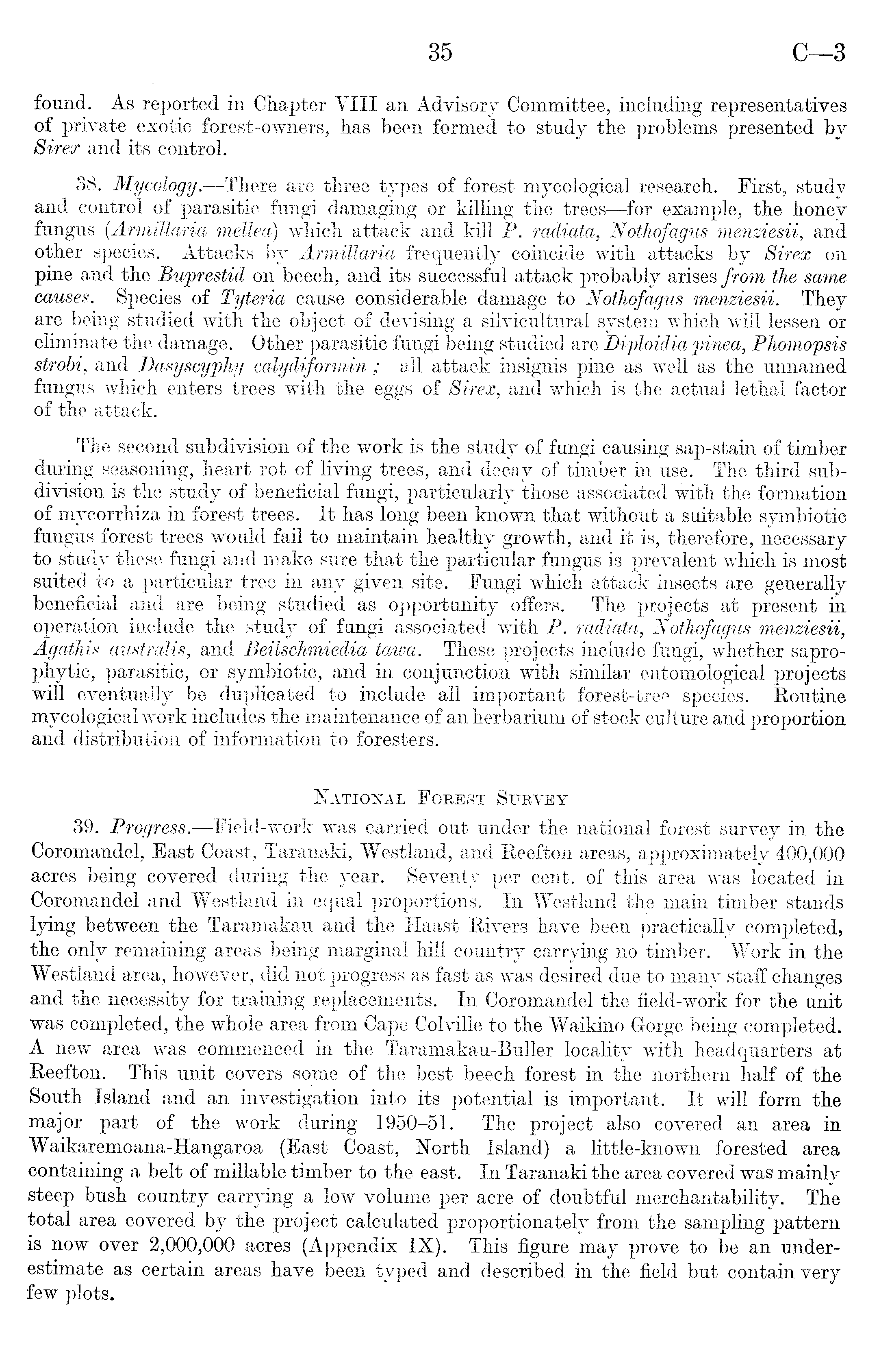 found. As reported in Chapter VIII an Advisory Committee, including representatives of private exotic forest-owners, has been formed to study the problems presented by Sir ex and its control. 38. Mycology.—There are three types of forest mycological research. First, study and control of parasitic fungi damaging or killing the trees —for example, the honey fungus (Armillaria mellea) which attack and kill P. radiata, Nothofagus menziesii, and other species. Attacks by Armillaria frequently coincide with attacks by Sir ex on pine and the Buprestid on beech, and its successful attack probably arises from the same causes. Species of Tyteria cause considerable damage to Nothofagus menziesii. They are being studied with the object of devising a silvicultural system which will lessen or eliminate the damage. Other parasitic fungi being studied are Diploidia pinea, Phomopsis strobi, and Dasyscyphy calydiformin; all attack insignis pine as well as the unnamed fungus which enters trees with the eggs of Sirex, and which is the actual lethal factor of the attack. The second subdivision of the work is the study of fungi causing sap-stain of timber during seasoning, heart rot of living trees, and decay of timber in use. The third subdivision is the study of beneficial fungi, particularly those associated with the formation of mycorrhiza in forest trees. It has long been known that without a suitable symbiotic fungus forest trees would fail to maintain healthy growth, and it is, therefore, necessary to study these fungi and make sure that the particular fungus is prevalent which is most suited to a particular tree in any given site. Fungi which attack insects are generally beneficial and are being studied as opportunity offers. The projects at present in operation include the study of fungi associated with P. radiata, Nothofagus menziesii, Agathis australis, and Beilschmiedia tawa. These projects include fungi, whether saprophytic, parasitic, or symbiotic, and in conjunction with similar entomological projects will eventually be duplicated to include all important forest-tree species. Routine mycological work includes the maintenance of an herbarium of stock culture and proportion and distribution of information to foresters. National Forest Survey 39. Progress.—Field-work was carried out under the national forest survey in the Coromandel, East Coast, Taranaki, Westland, and Reefton areas, approximately 400,000 acres being covered during the year. Seventy per cent, of this area was located in Coromandel and Westland in equal proportions. In Westland the main timber stands lying between the Taramakau and the Haast Rivers have been practically completed, the only remaining areas being marginal hill country carrying no timber. Work in the Westland area, however, did not progress as fast as was desired due to many staff changes and the necessity for training replacements. In Coromandel the field-work for the unit was completed, the whole area from Cape Colville to the Waikino Gorge being completed. A new area was commenced in the Taramakau-Buller locality with headquarters at Reefton. This unit covers some of the best beech forest in the northern half of the South Island and an investigation into its potential is important. It will form the major part of the work during 1950-51. The project also covered an area in Waikaremoana-Hangaroa (East Coast, North Island) a little-known forested area containing a belt of millable timber to the east. In Taranaki the area covered was mainly steep bush country carrying a low volume per acre of doubtful merchantability. The total area covered by the project calculated proportionately from the sampling pattern is now over 2,000,000 acres (Appendix IX). This figure may prove to be an underestimate as certain areas have been typed and described in the field but contain very few plots.