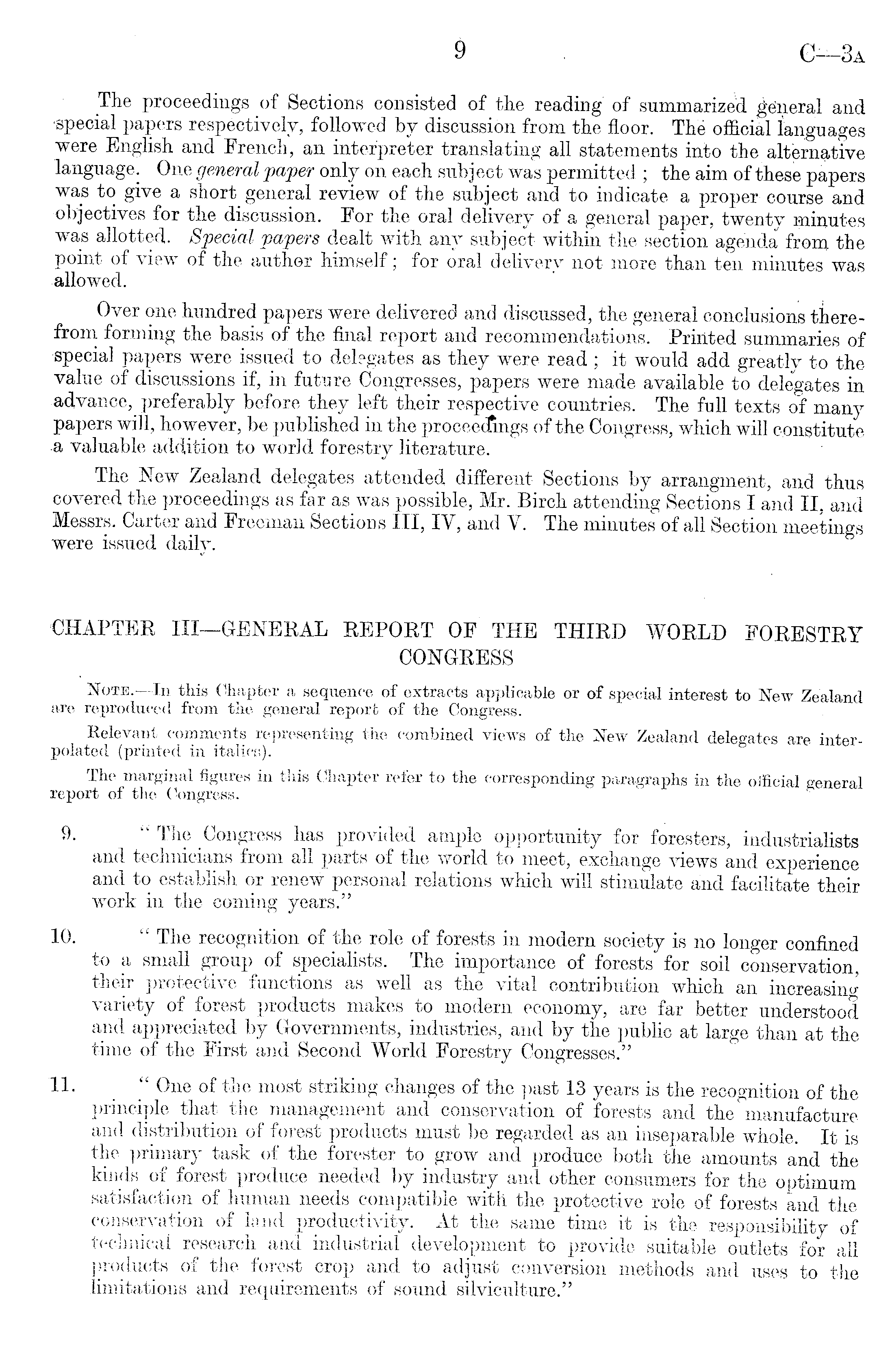 The proceedings of Sections consisted of the reading of summarized general and •special papers respectively, followed by discussion from the floor. The official languages were English and French, an interpreter translating all statements into the alternative language. One general paper only on each subject was permitted ; the aim of these papers was to give a short general review of the subject and to indicate a proper course and objectives for the discussion. For the oral delivery of a general paper, twenty minutes was allotted. Special papers dealt with any subject within the section agenda from the point of view of the author himself; for oral delivery not more than ten minutes was allowed. Over one hundred papers were delivered and discussed, the general conclusions therefrom forming the basis of the final report and recommendations. Printed summaries of special papers were issued to delegates as they were read ; it would add greatly to the value of discussions if, in future Congresses, papers were made available to delegates in advance, preferably before they left their respective countries. The full texts of many papers will, however, be published in the proceedings of the Congress, which will constitute -a valuable addition to world forestry literature. The New Zealand delegates attended different Sections by arrangment, and thus ■covered the proceedings as far as was possible, Mr. Birch attending Sections I and 11, and Messrs. Carter and Freeman Sections 111, IV, and V. The minutes of all Section meetings were issued daily. CHAPTER lII—GENERAL REPORT OF THE THIRD WORLD FORESTRY CONGRESS Note.—ln this Chapter a sequence of extracts applicable or of special interest to New Zealand -are reproduced from the general report of the Congress. Relevant comments representing the combined views of the New Zealand delegates are interpolated (printed in italics). The marginal figures in this Chapter refer to the corresponding paragraphs in the official general report of the Congress. .9. " The Congress has provided ample opportunity for foresters, industrialists and technicians from all parts of the world to meet, exchange views and experience and to establish or renew personal relations which will stimulate and facilitate their work in the coming years." 10. " The recognition of the role of forests in modern society is no longer confined to a small group of specialists. The importance of forests for soil conservation, their protective functions as well as the vital contribution which an increasing variety of forest products makes to modern economy, are far better understood and appreciated by Governments, industries, and by the public at large than at the time of the First and Second World Forestry Congresses." 11. " One of the most striking changes of the past 13 years is the recognition of the principle that the management and conservation of forests and the manufacture and distribution of forest products must be regarded as an inseparable whole. It is the primary task of the forester to grow and produce both the amounts and the kinds of forest produce needed by industry and other consumers for the optimum satisfaction of human needs compatible with the protective role of forests and the conservation of land productivity. At the same time it is the responsibility of technical research and industrial development to provide suitable outlets for all products of the forest crop and to adjust conversion methods and uses to the limitations and requirements of sound silviculture."