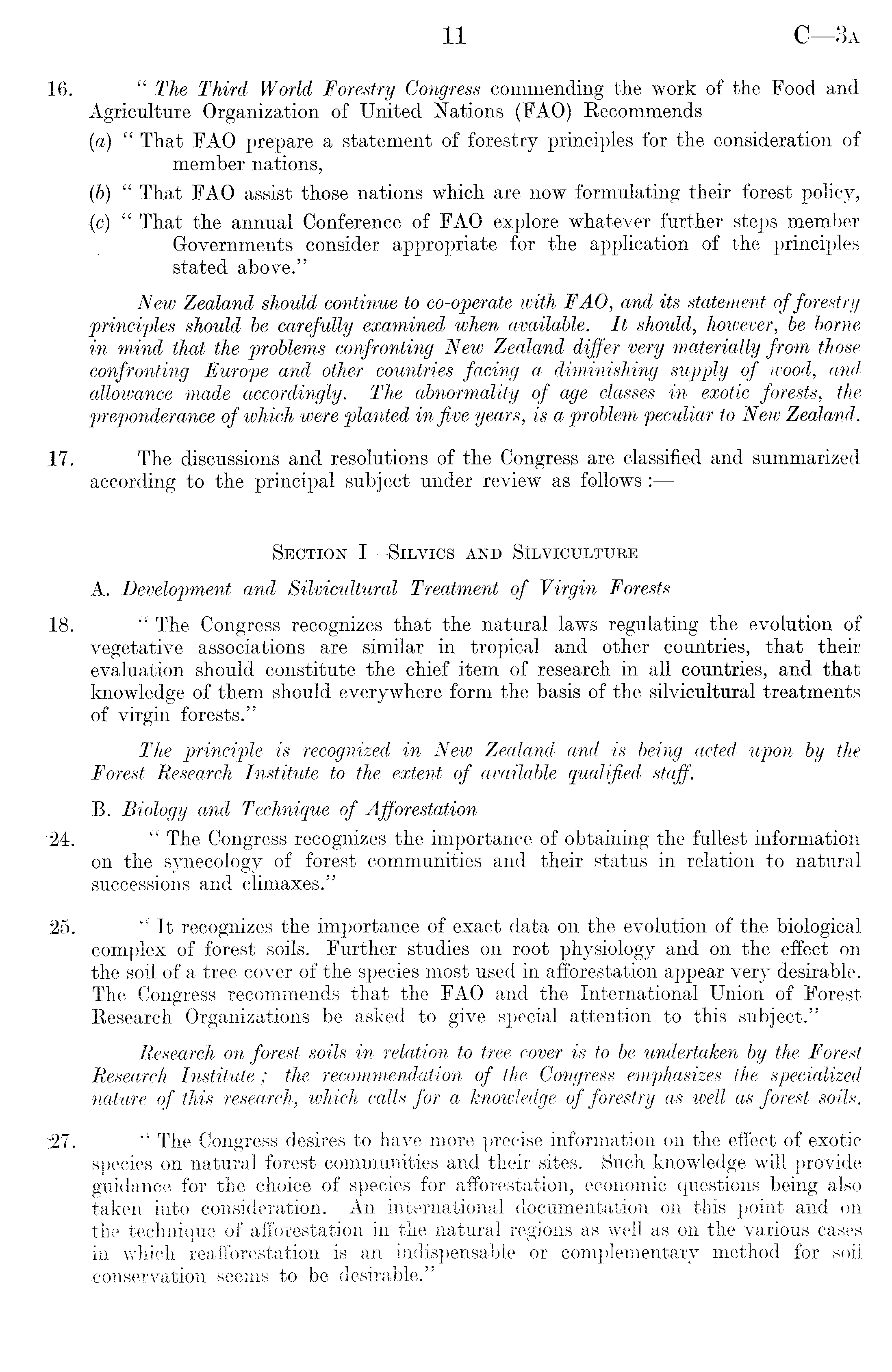 16. " The Third World Forestry Congress commending the work of the Food and Agriculture Organization of United Nations (FAO) Recommends (a) " That FAO prepare a statement of forestry principles for the consideration of member nations, (b) " That FAO assist those nations which are now formulating their forest policy, (c) " That the annual Conference of FAO explore whatever further steps member Governments consider appropriate for the application of the principles stated above." New Zealand should continue to co-operate with FAO, and its statement of forestry principles should be carefully examined when available. It should, however, be borne in mind that the problems confronting New Zealand differ very materially from those confronting Europe and other countries facing a diminishing supply of wood, and allowance made accordingly. The abnormality of age classes in exotic forests, the preponderance of which were planted in five years, is a problem peculiar to New Zealand. 17. The discussions and resolutions of the Congress are classified and summarized according to the principal subject under review as follows: — Section I —Silvi.cs and Silviculture A. Development and Silvicultural Treatment of Virgin Forests 18. " The Congress recognizes that the natural laws regulating the evolution of vegetative associations are similar in tropical and other countries, that their evaluation should constitute the chief item of research in all countries, and that knowledge of them should everywhere form the basis of the silvicultural treatments of virgin forests." The principle is recognized in New Zealand and is being acted upon by the Forest Research Institute to the extent of available qualified staff. B. Biology and Technique of Afforestation 24. " The Congress recognizes the importance of obtaining the fullest information on the synecology of forest communities and their status in relation to natural successions and climaxes." 25. "It recognizes the importance of exact data on the evolution of the biological complex of forest soils. Further studies on root physiology and on the effect on the soil of a tree cover of the species most used in afforestation appear very desirable. The Congress recommends that the FAO and the International Union of Forest Research Organizations be asked to give special attention to this subject." Research on forest soils in relation to tree cover is to be undertaken by the Forest Research Institute; the recommendation of the Congress emphasizes the specialized nature of this research, which calls for a knowledge of forestry as well as forest soils. 12,7. " The Congress desires to have more precise information on the effect of exotic species on natural forest communities and their sites. Such knowledge will provide guidance for the choice of species for afforestation, economic questions being also taken into consideration. An international documentation on this point and on the technique of afforestation in the natural regions as well as on the various cases in which reafforestation is an indispensable or complementary method for soil conservation seems to be desirable."