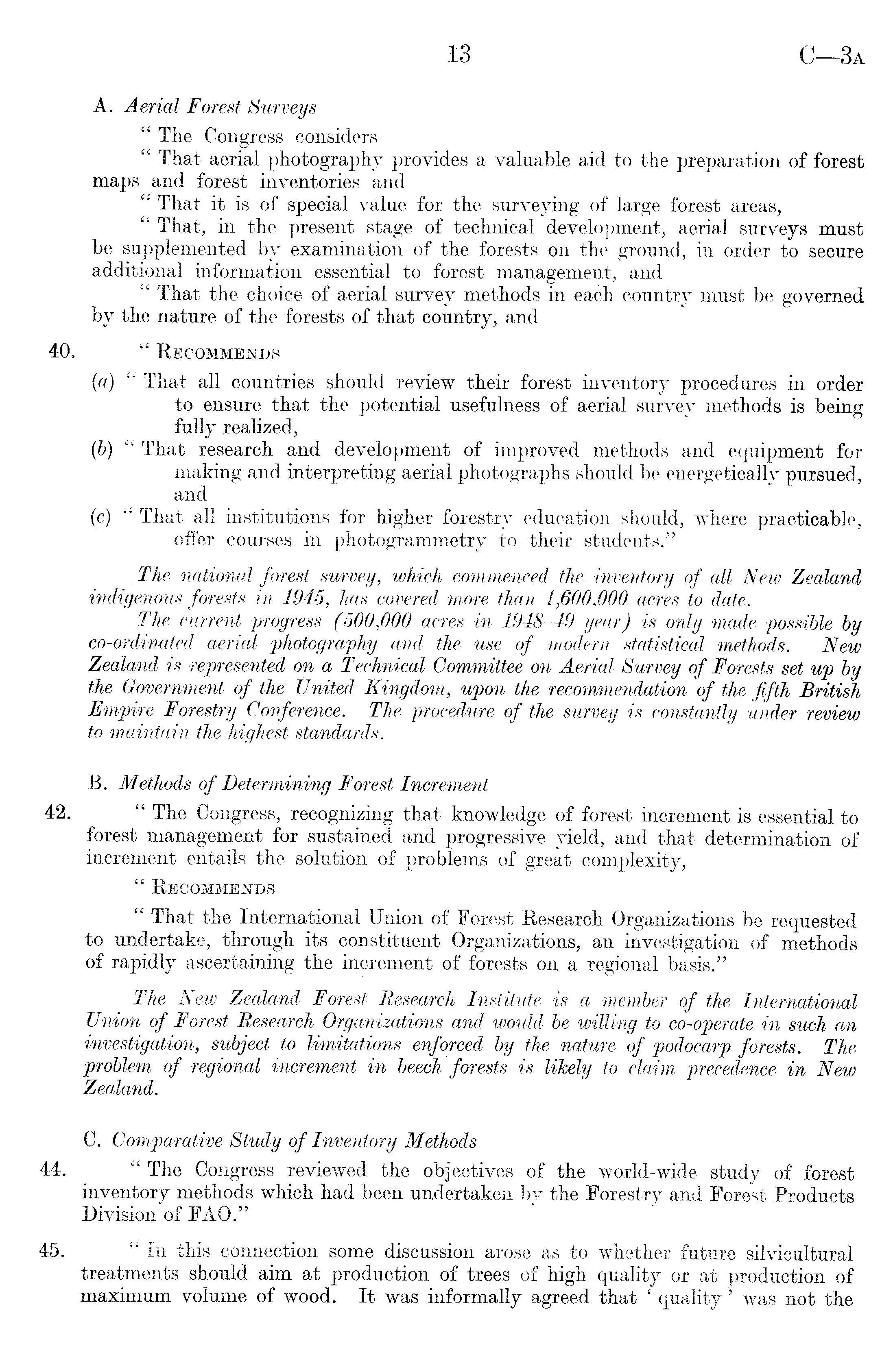 A. Aerial Forest Surveys " The Congress considers " That aerial photography provides a valuable aid to the preparation of forest maps and forest inventories and " That it is of special value for the surveying of large forest areas, " That, in the present stage of technical development, aerial surveys must be supplemented by examination of the forests on the ground, in order to secure additional information essential to forest management, and " That the choice of aerial survey methods in each country must be governed by the nature of the forests of that country, and 40. " Recommends (a) " That all countries should review their forest inventory procedures in order to ensure that the potential usefulness of aerial survey methods is being fully realized, (b) " That research and development of improved methods and equipment for making and interpreting aerial photographs should be energetically pursued, and (c) " That all institutions for higher forestry education should, where practicable, offer courses in photogrammetry to their students." The national forest survey, which commenced the inventory of all New Zealand indigenous forests in 194-5, has covered more than 1,600,000 acres to date. The current progress (500,000 acres in 1948-49 year) is only made possible by co-ordinated aerial photography and the use of modern statistical methods. New Zealand is represented on a Technical Committee on Aerial Survey of Forests set up by the Government of the United Kingdom, upon the recommendation of the fifth British Empire Forestry Conference. The procedure of the survey is constantly under review to maintain the highest standards. B. Methods of Determining Forest Increment 42. " The Congress, recognizing that knowledge of forest increment is essential to forest management for sustained and progressive yield, and that determination of increment entails the solution of problems of great complexity, " Recommends " That the International Union of Forest Research Organizations be requested to undertake, through its constituent Organizations, an investigation of methods of rapidly ascertaining the increment of forests on a regional basis." The New Zealand Forest Research Institute is a member of the International Union of Forest Research Organizations and would be willing to co-operate in such an investigation, subject to limitations enforced by the nature of podocarp forests. The problem of regional increment in beech forests is likely to claim precedence in New Zealand. C. Comparative Study of Inventory Methods 44. " The Congress reviewed the objectives of the world-wide study of forest inventory methods which had been undertaken by the Forestry and Forest Products Division of FAO." 45. "In this connection some discussion arose as to whether future silvicultural treatments should aim at production of trees of high quality or at production of maximum volume of wood. It was informally agreed that ' quality ' was not the