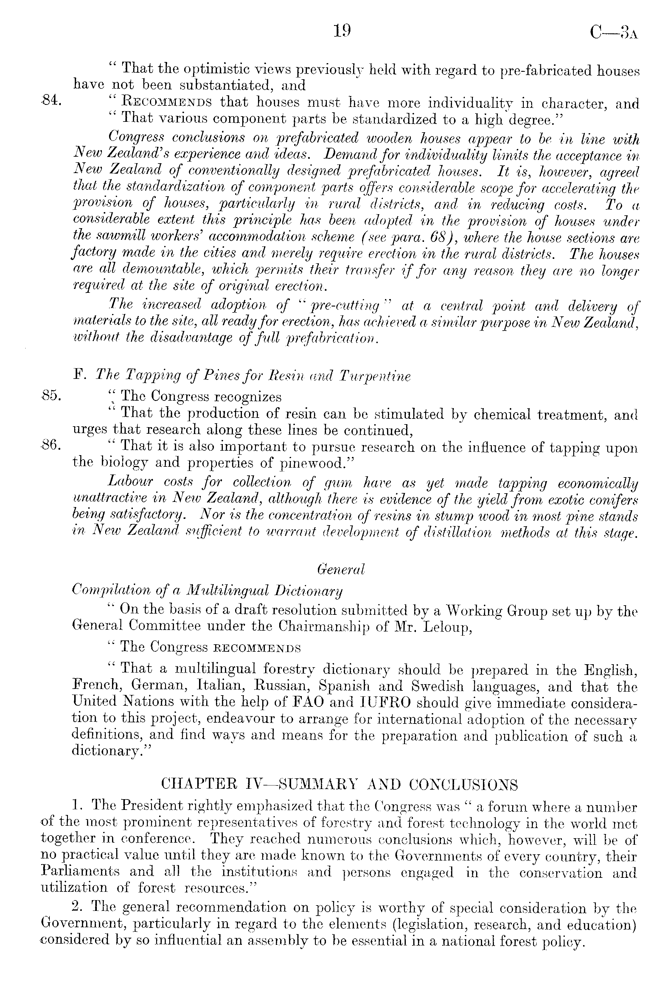 " That the optimistic views previously held with regard to pre-fabricated houses have not been substantiated, and 84. " Recommends that houses must have more individuality in character, and " That various component parts be standardized to a high degree." Congress conclusions on prefabricated wooden houses appear to be in line with New Zealand's experience and ideas. Demand for individuality limits the acceptance in New Zealand of conventionally designed prefabricated houses. It is, however, agreed that the standardization of component parts offers considerable scope for accelerating the provision of houses, particularly, in rural districts, and in reducing costs. To a considerable extent this principle has been adopted in the provision of houses under the sawmill workers' accommodation scheme (see para. 68), where the house sections are factory made in the cities and merely require erection in the rural districts. The houses are all demountable, which permits their transfer if for any reason they are no longer required at the site of original erection. The increased adoption of " pre-cutting " at a central point and delivery of materials to the site, all ready for erection, has achieved a similar purpose in New Zealand, without the disadvantage of full prefabrication. F. The Tapping of Pines for Resin and Turpentine •85. " The Congress recognizes " That the production of resin can be stimulated by chemical treatment, and urges that research along these lines be continued, 86. " That it is also important to pursue research on the influence of tapping upon the biology and properties of pine wood." Labour costs for collection of gum have as yet made tapping economically unattractive in New Zealand, although there is evidence of the yield from exotic conifers being satisfactory. Nor is the concentration of resins in stump wood in most pine stands in New Zealand sufficient to warrant development of distillation methods at this stage. General Compilation of a Multilingual Dictionary " On the basis of a draft resolution submitted by a Working Group set up by the General Committee under the Chairmanship of Mr. Leloup, " The Congress recommends " That a multilingual forestry dictionary should be prepared in the English, French, German, Italian, Russian, Spanish and Swedish languages, and that the United Nations with the help of FAO and lUFRO should give immediate consideration to this project, endeavour to arrange for international adoption of the necessary definitions, and find ways and means for the preparation and publication of such a dictionary." CHAPTER IV—SUMMARY AND CONCLUSIONS 1. The President rightly emphasized that the Congress was " a forum where a number of the most prominent representatives of forestry and forest technology in the world met together in conference. They reached numerous conclusions which, however, will be of no practical value until they are made known to the Governments of every country, their Parliaments and all the institutions and persons engaged in the conservation and utilization of forest resources." 2. The general recommendation on policy is worthy of special consideration by the Government, particularly in regard to the elements (legislation, research, and education) considered by so influential an assembly to be essential in a national forest policy.