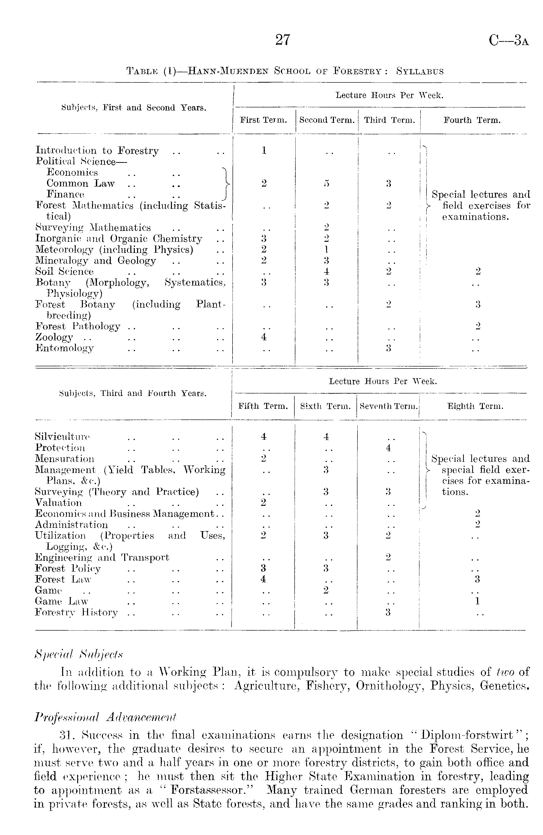 Special Subjects In addition to a Working Plan, it is compulsory to make special studies of two of the following additional subjects : Agriculture, Fishery, Ornithology, Physics, Genetics. Professional Advancement 31. Success in the final examinations earns , the designation " Diplom-forstwirt"; if, however, the graduate desires to secure an appointment in the Forest Service, he must serve two and a half years in one or more forestry districts, to gain both office and field experience ; he must then sit the Higher State Examination in forestry, leading to appointment as a " Forstassessor." Many trained German foresters are employed in private forests, as well as State forests, and have the same grades and ranking in both.
