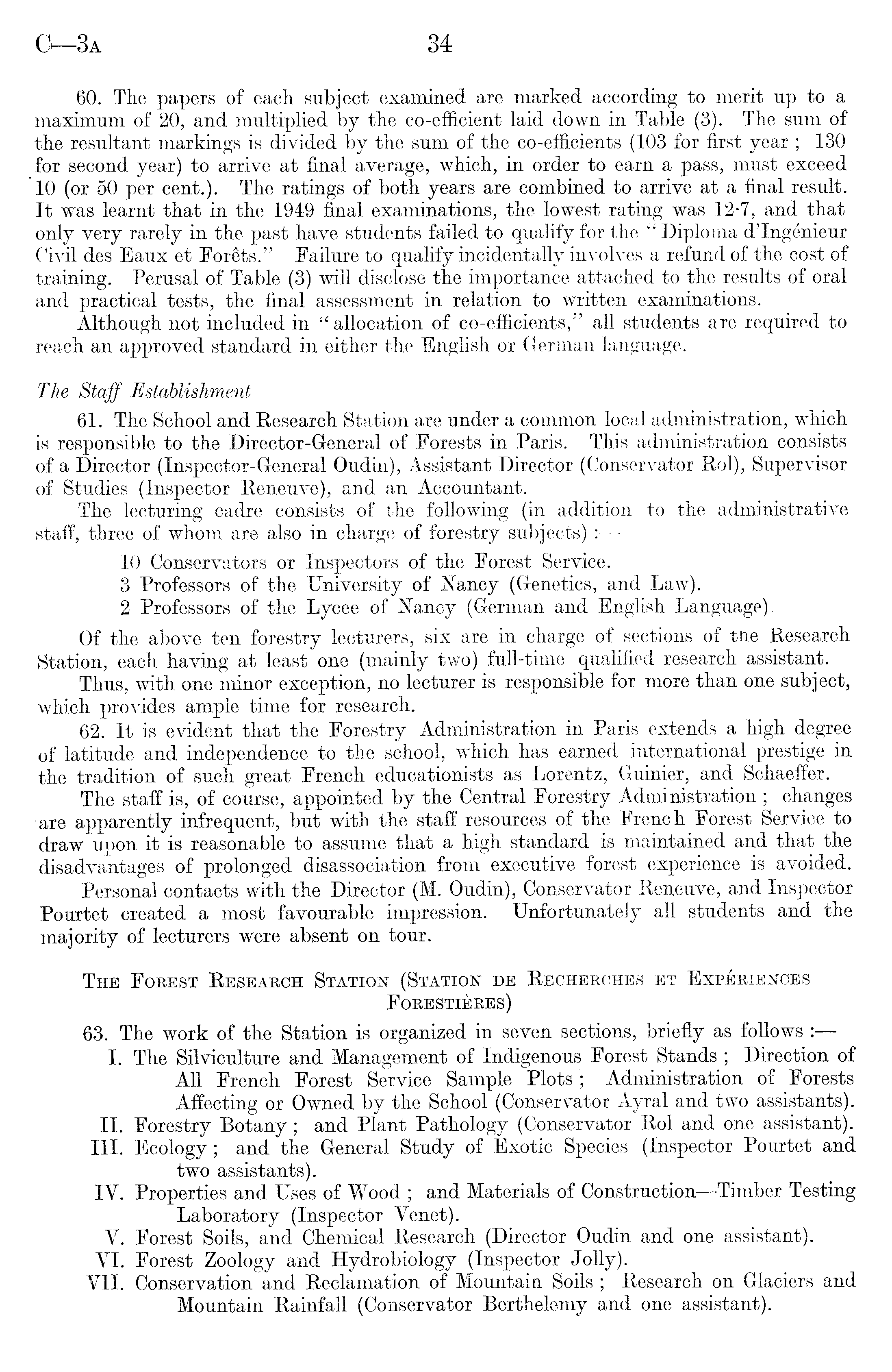 60. The papers of each subject examined are marked according to merit up to a maximum of 20, and multiplied by the co-efficient laid down in Table (3). The sum of the resultant markings is divided by the sum of the co-efficients (103 for first year ; 130 for second year) to arrive at final average, which, in order to earn a pass, must exceed 10 (or 50 per cent.). The ratings of both years are combined to arrive at a final result. It was learnt that in the 1949 final examinations, the lowest rating was 12-7, and that only very rarely in the past have students failed to qualify for the " Diploma d'lngenieur Civil des Eaux et Forets." Failure to qualify incidentally involves a refund of the cost of training. Perusal of Table (3) will disclose the importance attached to the results of oral and practical tests, the final assessment in relation to written examinations. Although not included in. " allocation of co-efficients," all students are required to reach an approved standard in either the English or German language. The Staff Establishment 61. The School and Research Station are under a common local administration, which is responsible to the Director-General of Forests in Paris. This administration consists of a Director (Inspector-General Oudin), Assistant Director (Conservator Pol), Supervisor of Studies (Inspector Reneuve), and an Accountant. The lecturing cadre consists of the following (in addition to the administrative staff, three of whom are also in charge of forestry subjects) : 10 Conservators or Inspectors of the Forest Service. 3 Professors of the University of Nancy (Genetics, and Law). 2 Professors of the Lycee of Nancy (German and English Language). Of the above ten forestry lecturers, six are in charge of sections of tne Research Station, each having at least one (mainly two) full-time qualified research assistant. Thus, with one minor exception, no lecturer is responsible for more than one subject, which provides ample time for research. 62. It is evident that the Forestry Administration in Paris extends a high degree -of latitude and independence to the school, which has earned international prestige in the tradition of such great French educationists as Lorentz, Guinier, and Schaeffer. The staff is, of course, appointed by the Central Forestry Administration ; changes are apparently infrequent, but with the staff resources of the French Forest Service to draw upon it is reasonable to assume that a high standard is maintained and that the disadvantages of prolonged disassociation from executive forest experience is avoided. Personal contacts with the Director (M. Oudin), Conservator Reneuve, and Inspector Pourtet created a most favourable impression. Unfortunately all students and the majority of lecturers were absent on tour. The Forest Research Station (Station de Recherches et Experiences Forestieres) 63. The work of the Station is organized in seven sections, briefly as follows : I. The Silviculture and Management of Indigenous Forest Stands ; Direction of All French Forest Service Sample Plots ; Administration of Forests Affecting or Owned by the School (Conservator Ayral and two assistants). 11. Forestry Botany; and Plant Pathology (Conservator Rol and one assistant). 111. Ecology; and the General. Study of Exotic Species (Inspector Pourtet and two assistants). IY. Properties and Uses of Wood ; and Materials of Construction —Timber Testing Laboratory (Inspector Venet). Y. Forest Soils, and Chemical Research (Director Oudin and one assistant). VI. Forest Zoology and Hydrobiology (Inspector Jolly). VII. Conservation and Reclamation of Mountain Soils ; Research on Glaciers and Mountain Rainfall (Conservator Berthelemy and one assistant).
