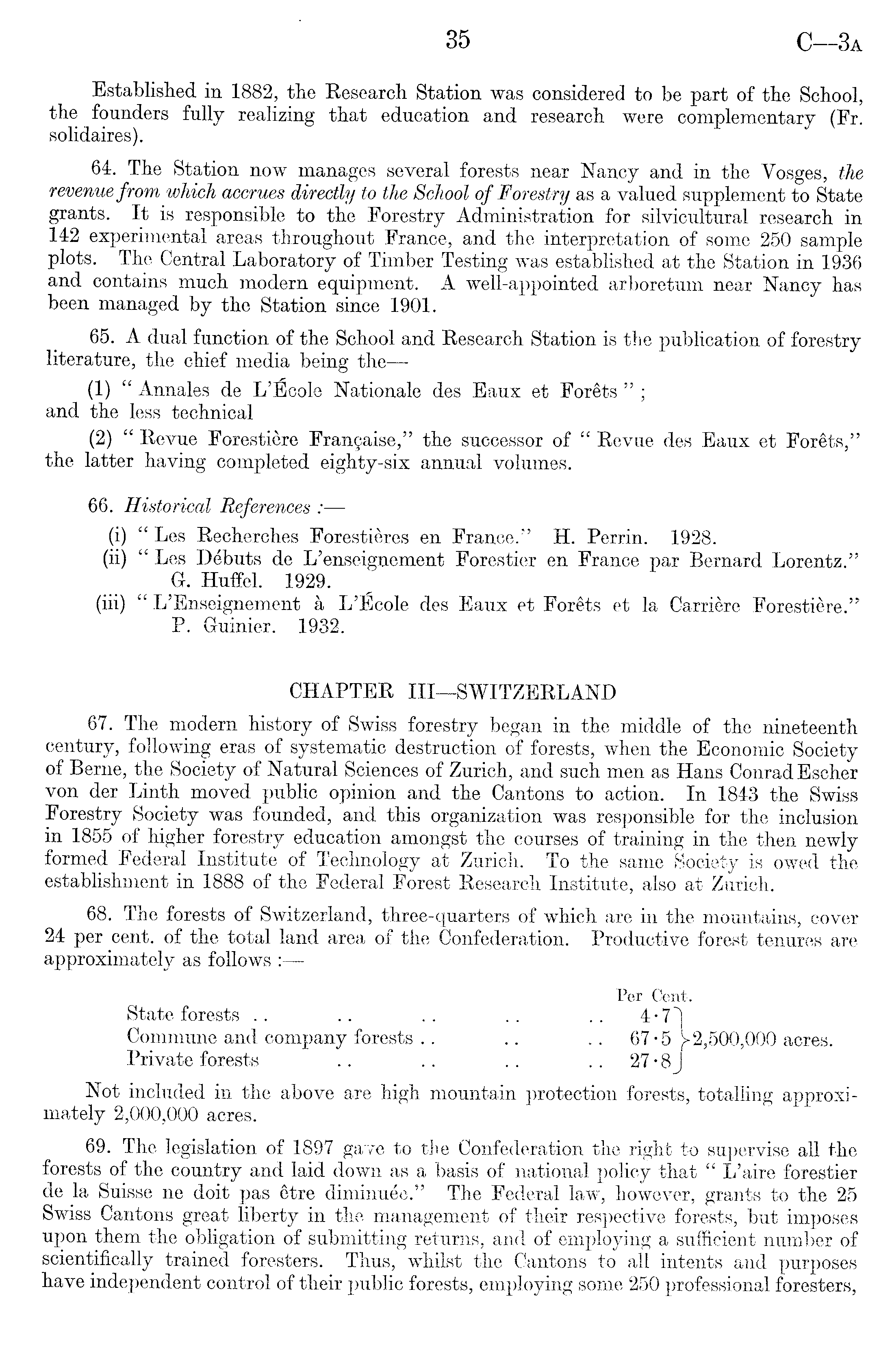 Established in 1882, the Research Station was considered to be part of the School, the founders fully realizing that education and research were complementary (Fr. solidaires). 64. The Station now manages several forests near Nancy and in the Vosges, the revenue from which accrues directly to the School of Forestry as a valued supplement to State grants. It is responsible to the Forestry Administration for silvicultural research in 142 experimental areas throughout France, and the interpretation of some 250 sample plots. The Central Laboratory of Timber Testing was established at the Station in 1936 and contains much modern equipment. A well-appointed arboretum near Nancy has been managed by the Station since 1901. 65. A dual function of the School and Research Station is the publication of forestry literature, the chief media being the — (1) " Annales de Rationale des Eaux et Forets " ; and the less technical (2) " Revue Forestiere Fran§aise," the successor of " Revue des Eaux et Forets," the latter having completed eighty-six annual volumes. 66. Historical References :■ —- (i) " Les Recherches Forestieres en France." H. Perrin. 1928. (ii) " Les Debuts de L'enseignement Forestier en France par Bernard Lorentz." Gr. Huffel. 1929. (iii) " L'Enseignement a L'Ecole des Eaux et Forets et la Carriere Forestiere." P. Gruinier. 1932. CHAPTER lII—SWITZERLAND 67. The modern history of Swiss forestry began in the middle of the nineteenth century, following eras of systematic destruction of forests, when the Economic Society of Berne, the Society of Natural Sciences of Zurich, and such men as Hans Conrad Escher von der Linth moved public opinion and the Cantons to action. In 1843 the Swiss Forestry Society was founded, and this organization was responsible for the inclusion in 1855 of higher forestry education amongst the courses of training in the then newly formed Federal Institute of Technology at Zurich. To the same Society is owed the establishment in 1888 of the Federal Forest Research Institute, also at Zurich. 68. The forests of Switzerland, three-quarters of which are in the mountains, cover 24 per cent, of the total land area of the Confederation. Productive forest tenures are approximately as follows : Per Cent. State forests .. .. .. .. .. 4-7"] Commune and company forests .. .. . . 67*5 [>-2,500,000 acres. Private forests .. .. .. 27 • 8 J Not included in the above are high mountain protection forests, totalling approximately 2,000,000 acres. 69. The legislation of 1897 gave to the Confederation the right to supervise all the forests of the country and laid down as a basis of national policy that " L'aire forestier de la Suisse ne doit pas etre diminuee." The Federal law, however, grants to the 25 Swiss Cantons great liberty in the management of their respective forests, but imposes upon them the obligation of submitting returns, and of employing a sufficient number of scientifically trained foresters. Thus, whilst the Cantons to all intents and purposes have independent control of their public forests, employing some 250 professional foresters,
