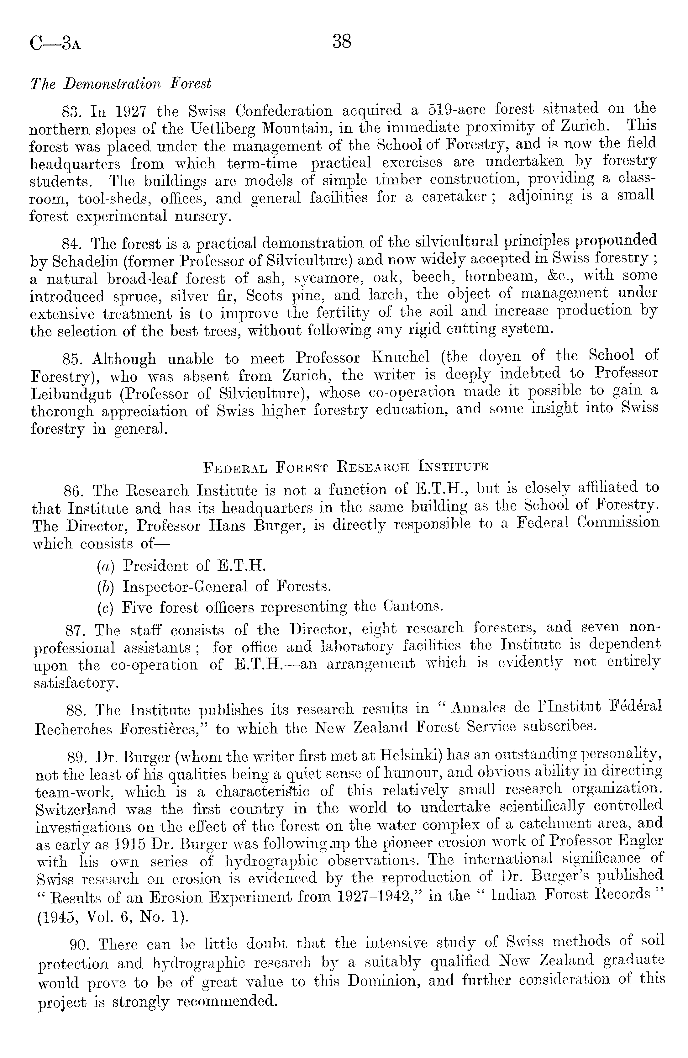The Demonstration Forest 83. In 1927 the Swiss Confederation acquired a 519-acre forest situated on the northern slopes of the Uetliberg Mountain, in the immediate proximity of Zurich. This forest was placed under the management of the School of Forestry, and is now the field headquarters from which term-time practical exercises are undertaken by forestry students. The buildings are models of simple timber construction, providing a classroom, tool-sheds, offices, and general facilities for a caretaker; adjoining is a small forest experimental nursery. 84. The forest is a practical demonstration of the silvicultural principles propounded by Schadelin (former Professor of Silviculture) and now widely accepted in Swiss forestry ; a natural broad-leaf forest of ash, sycamore, oak, beech, hornbeam, &c., with some introduced spruce, silver fir, Scots pine, and larch, the object of management under extensive treatment is to improve the fertility of the soil and increase production by the selection of the best trees, without following any rigid cutting system. 85. Although unable to meet Professor Knuchel (the doyen of the School of Forestry), who was absent from Zurich, the writer is deeply indebted to Professor Leibundgut (Professor of Silviculture), whose co-operation made it possible to gain a thorough appreciation of Swiss higher forestry education, and some insight into Swiss forestry in general. Federal Forest Research Institute 86. The Research Institute is not a function of E.T.H., but is closely affiliated to that Institute and has its headquarters in the same building as the School of Forestry. The Director, Professor Hans Burger, is directly responsible to a Federal Commission which consists of — (а) President of E.T.H. (б) Inspector-General of Forests. (c) Five forest officers representing the Cantons. 87. The staff consists of the Director, eight research foresters, and seven nonprofessional assistants ; for office and laboratory facilities the Institute is dependent upon the co-operation of E.T.H. —an arrangement which is evidently not entirely satisfactory. 88. The Institute publishes its research results in " Annales de l'lnstitut Federal Recherches Forestieres," to which the New Zealand Forest Service subscribes. 89. Dr. Burger (whom the writer first met at Helsinki) has an outstanding personality, not the least of his qualities being a quiet sense of humour, and obvious ability in directing team-work, which is a characteristic of this relatively small research organization. Switzerland was the first country in the world to undertake scientifically controlled investigations on the effect of the forest on the water complex of a catchment area, and as early as 1915 Dr. Burger was following-up the pioneer erosion work of Professor Engler with his own series of hydrographic observations. The international significance of Swiss research on erosion is evidenced by the reproduction of Dr. Burger's published " Results of an Erosion Experiment from 1927-1942," in the " Indian Forest Records " (1945, Vol. 6, No. 1). 90. There can be little doubt that the intensive study of Swiss methods of soil protection and hydrographic research by a suitably qualified New Zealand graduate would prove to be of great value to this Dominion, and further consideration of this project is strongly recommended.
